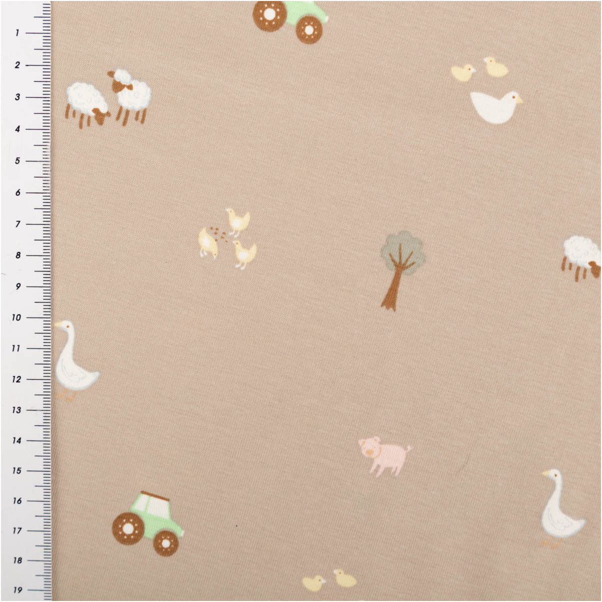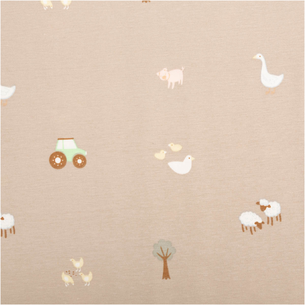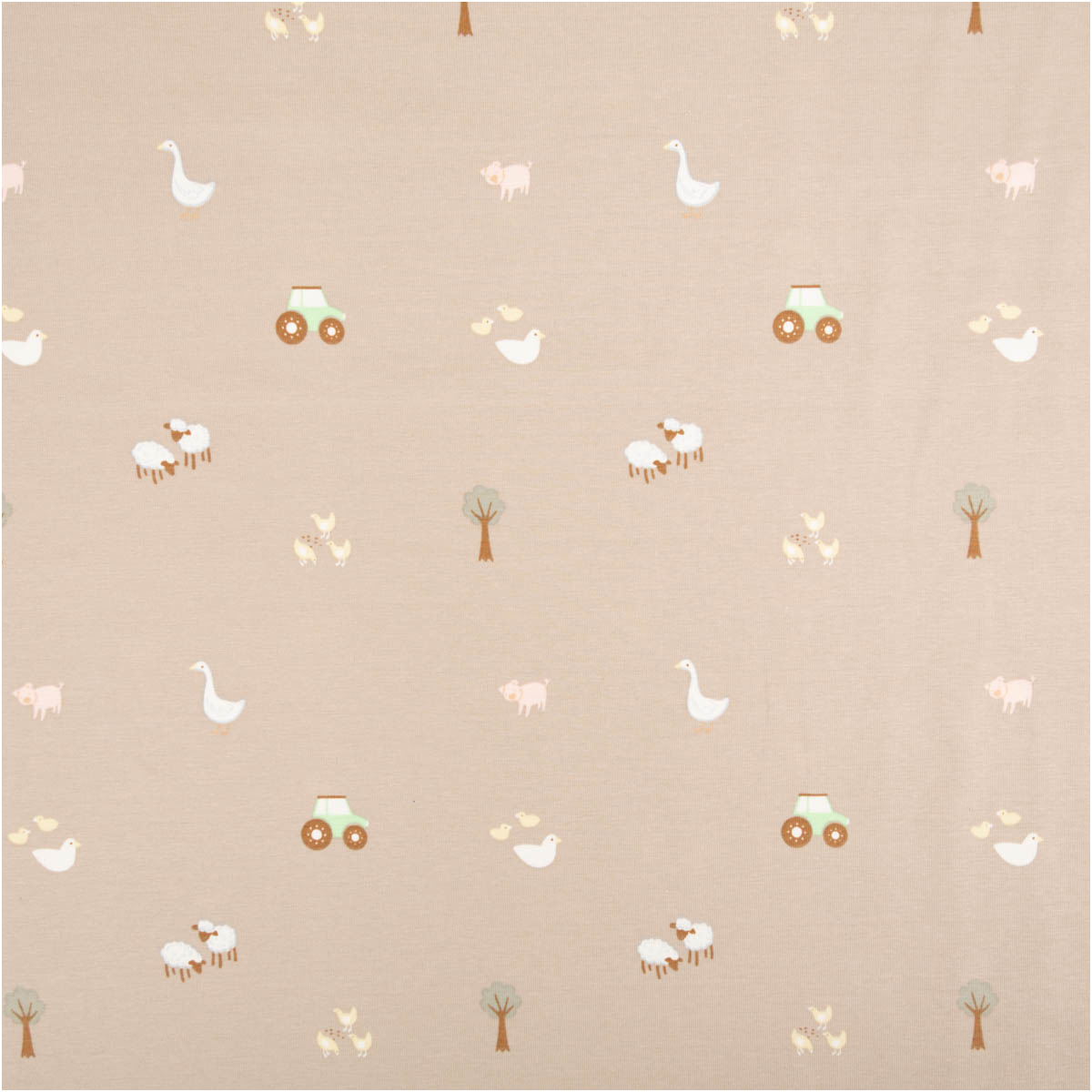 Jersey Stoff Baumwolljersey Bauernhof Traktor Tiere sand 1,45m Breite