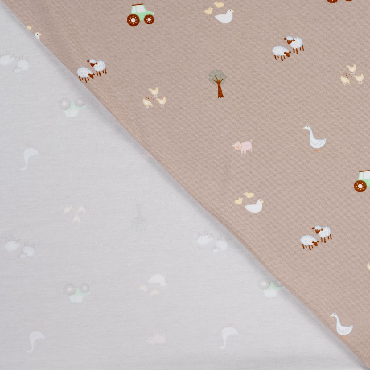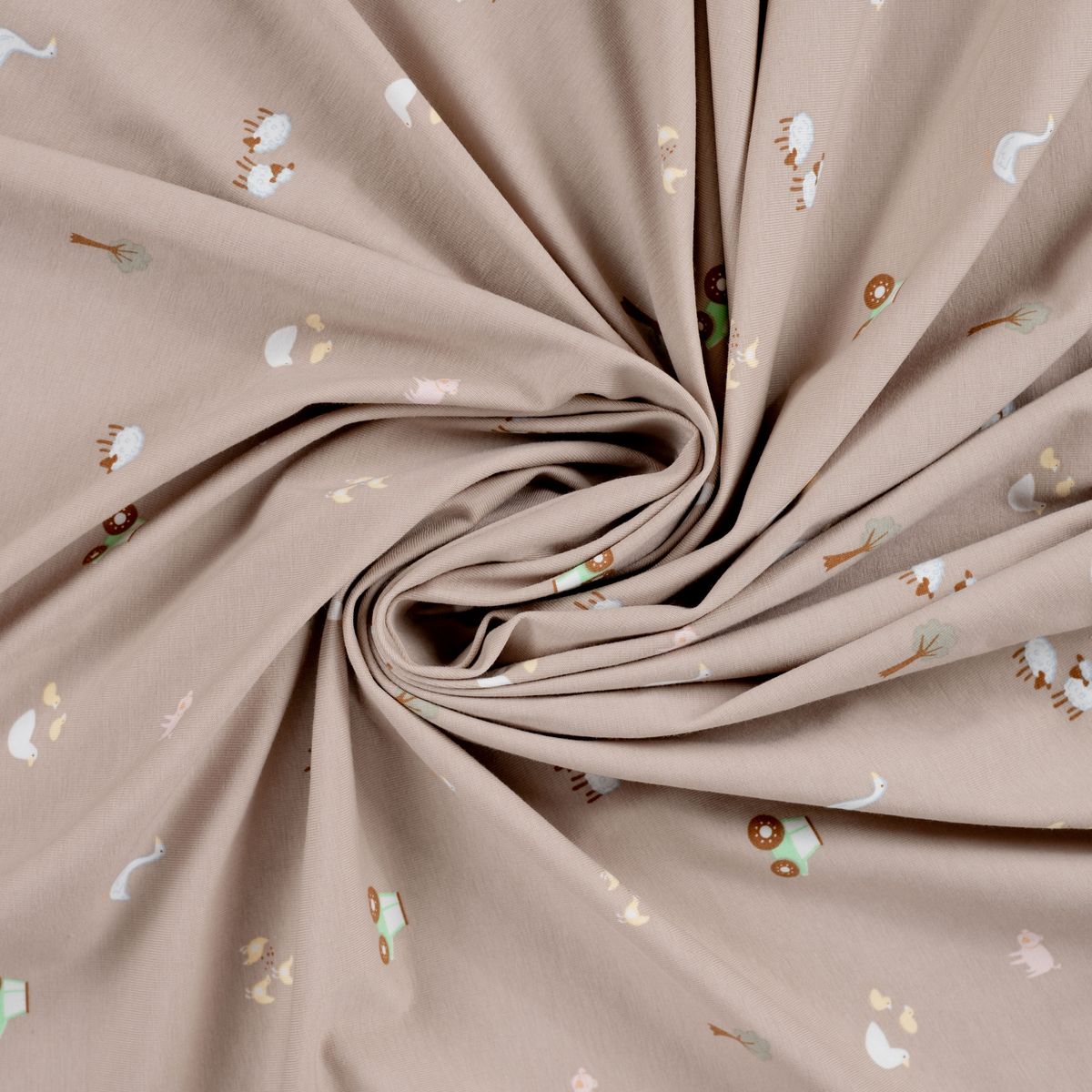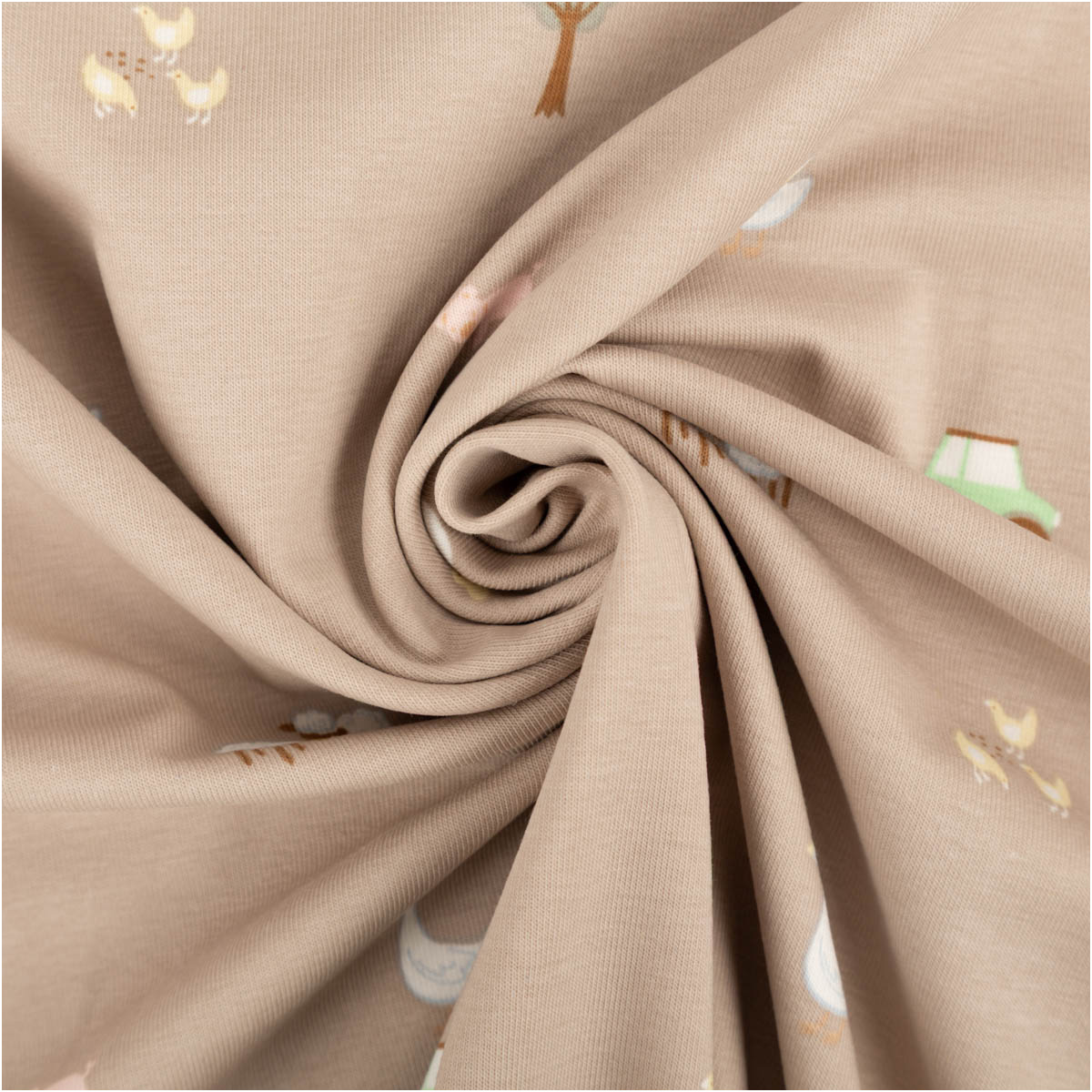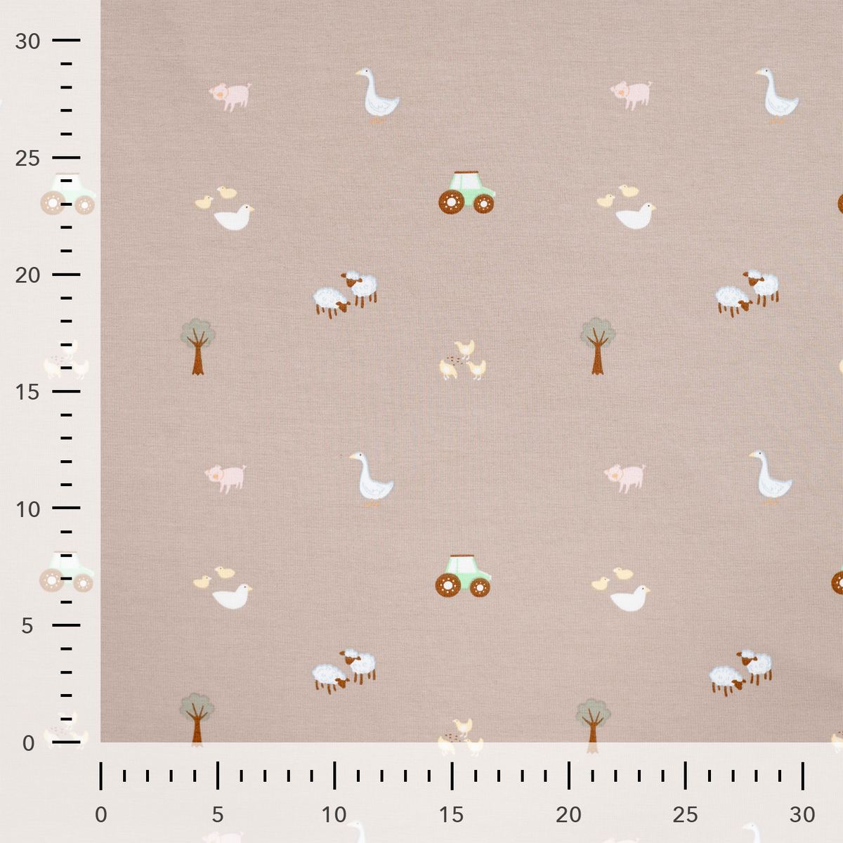 Jersey Stoff Baumwolljersey Bauernhof Traktor Tiere sand 1,45m Breite