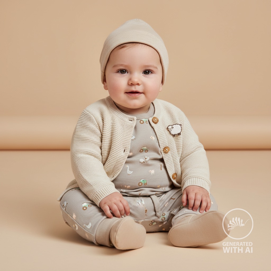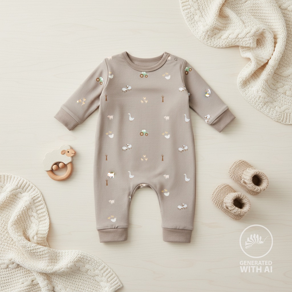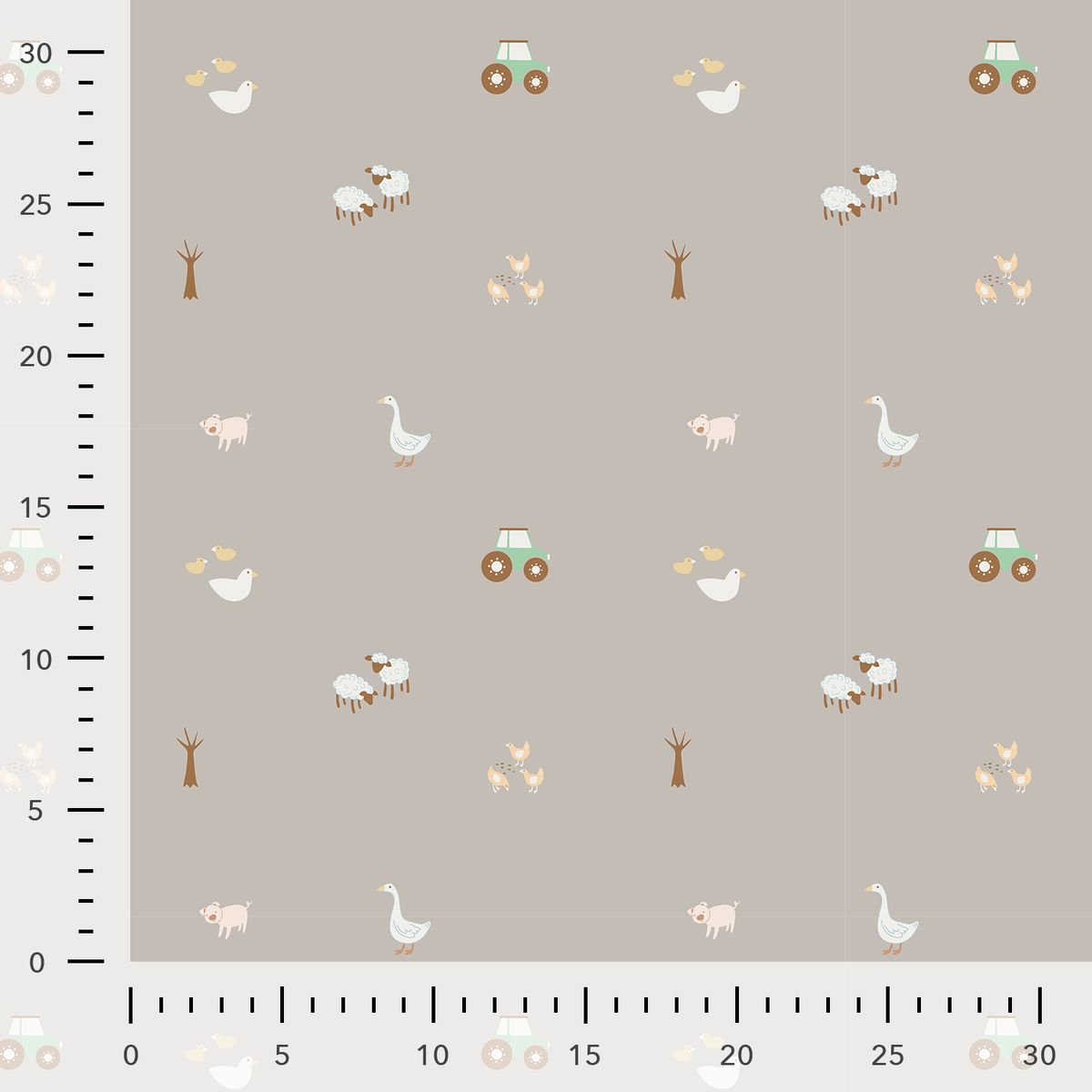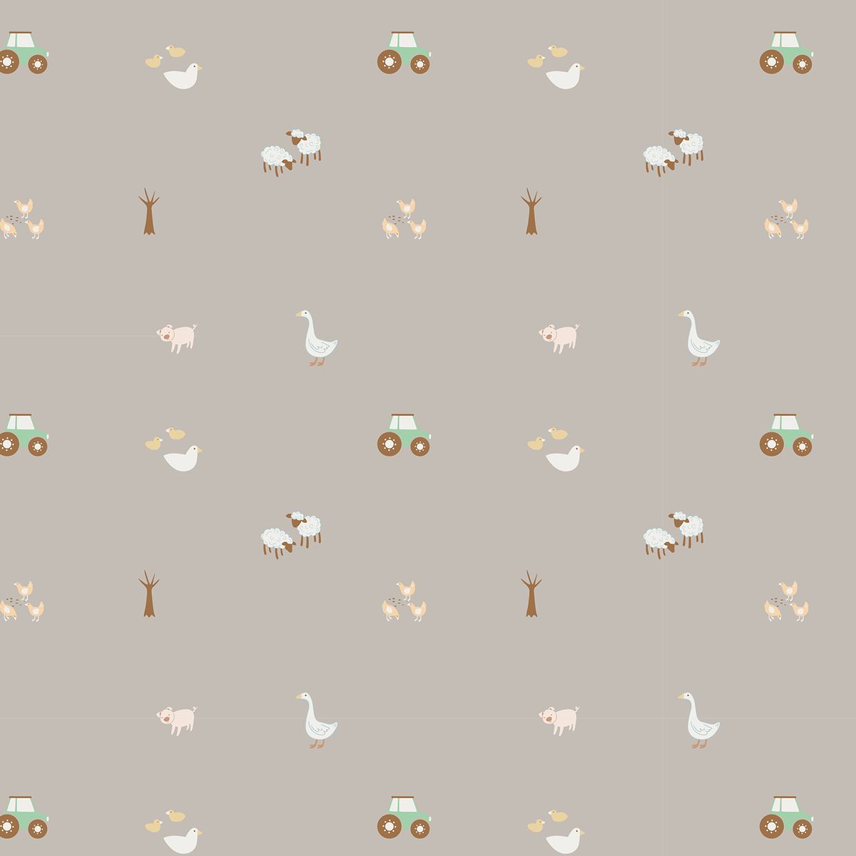 Bauernhof-Motiv: Traktor und Tiere auf sandfarbenem Grund, dezent und kinderfreundlich gestaltet