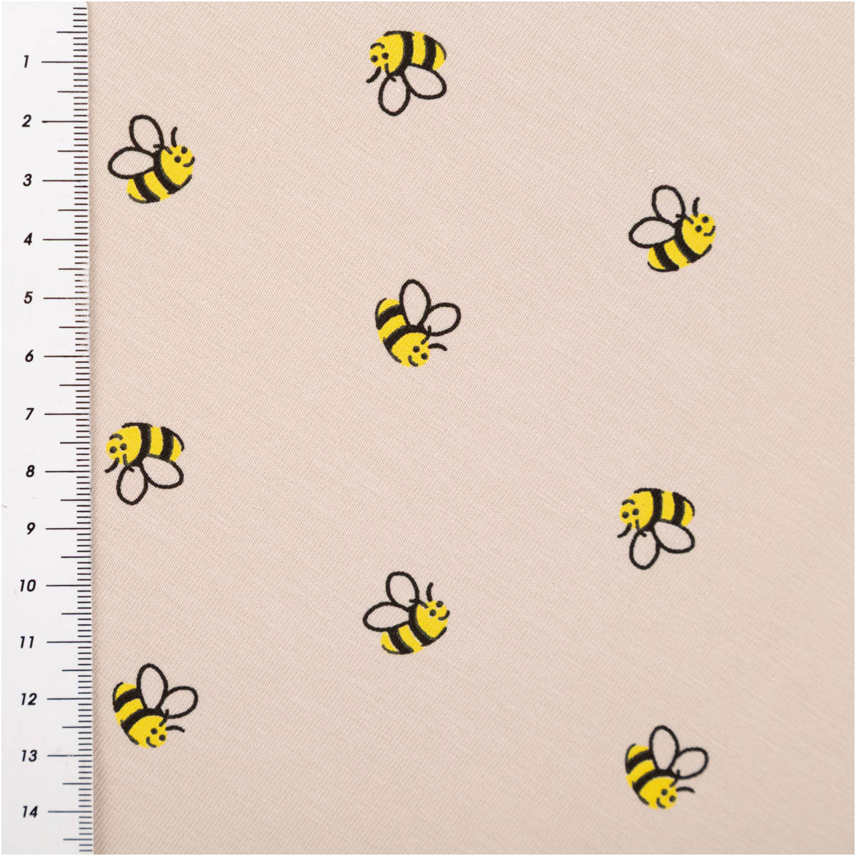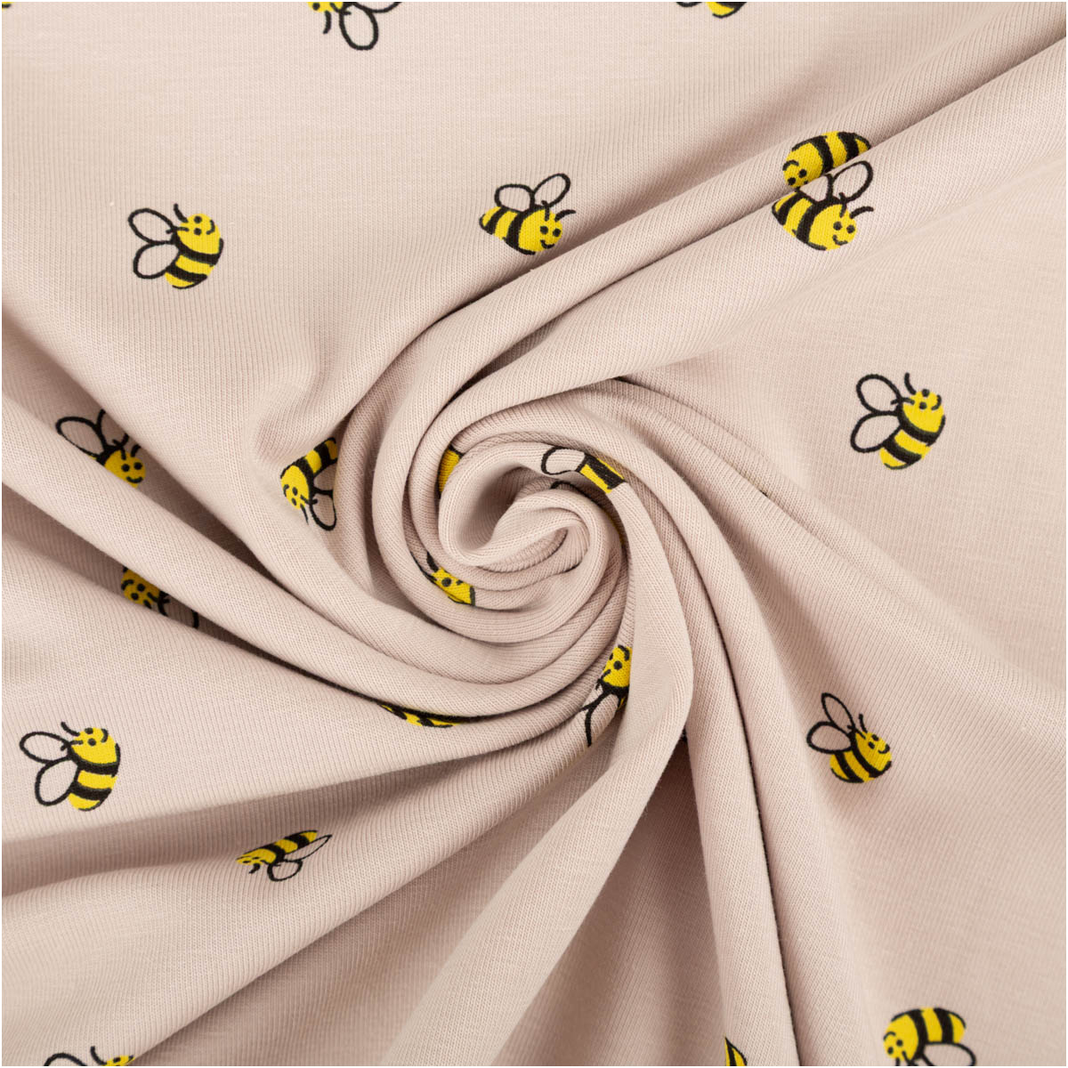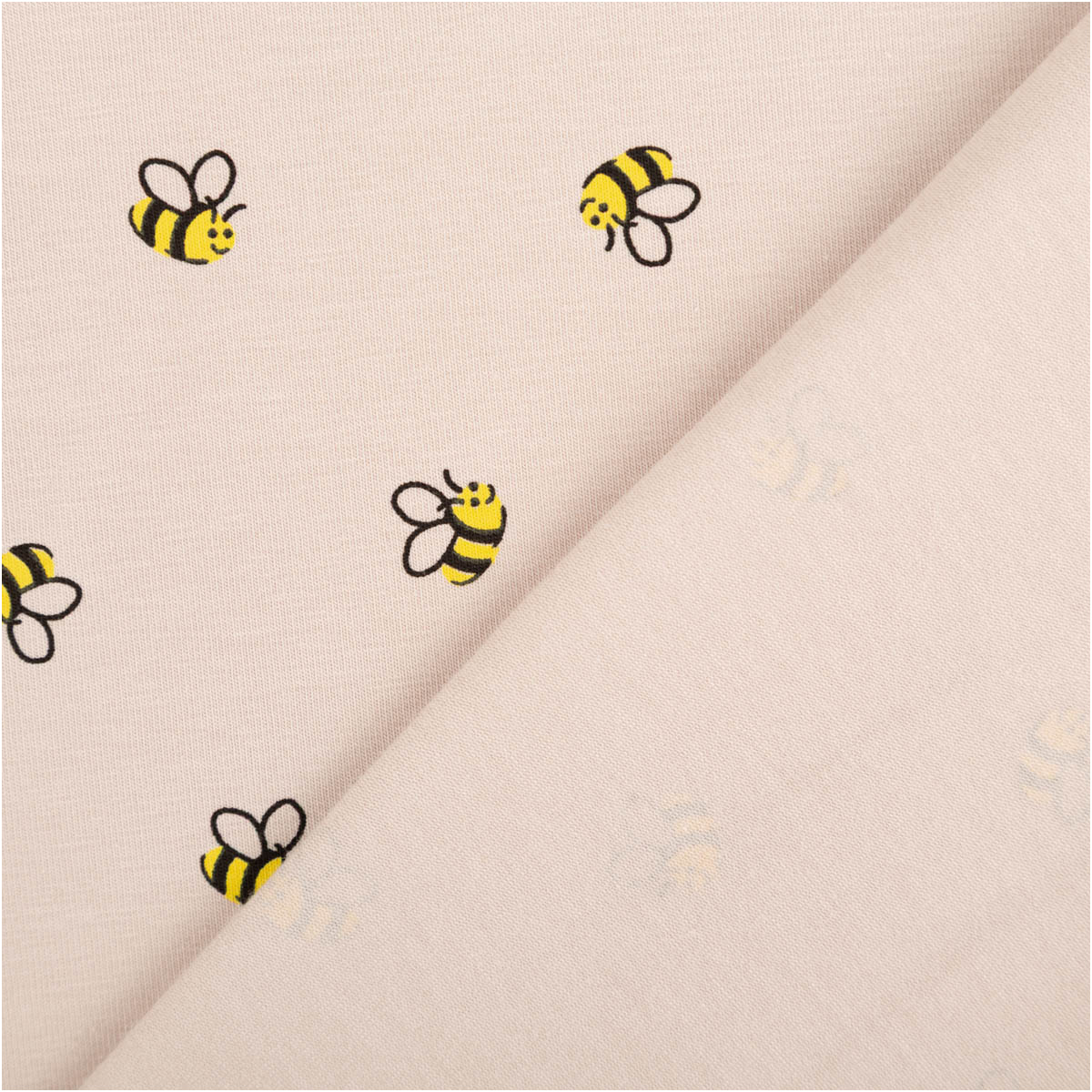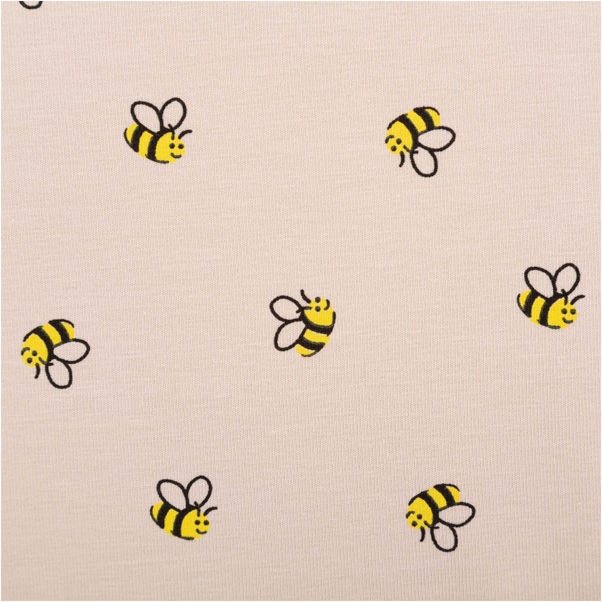 Die Bienen sind grafisch klar gestaltet und heben sich schön vom sandfarbigen Grund ab. Dadurch wirkt das Muster lebendig, aber trotzdem dezent – perfekt für alltagstaugliche Outfits.