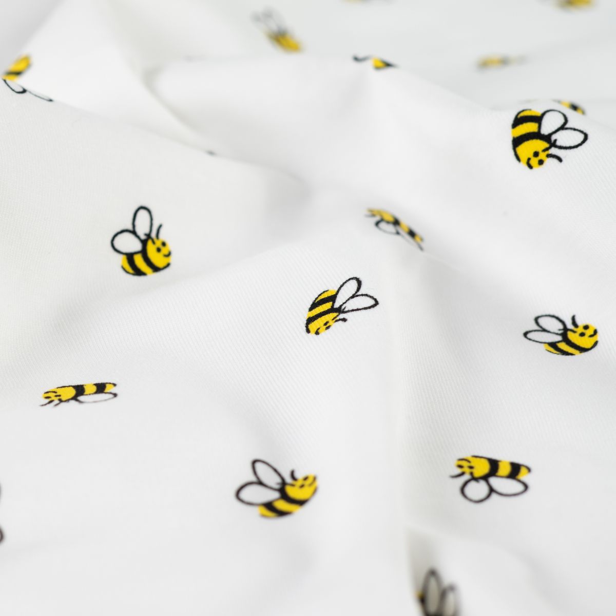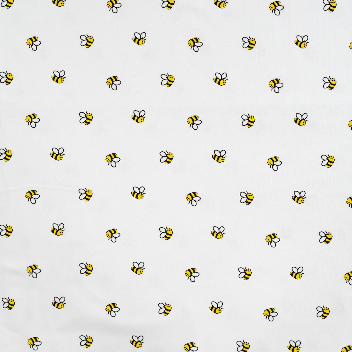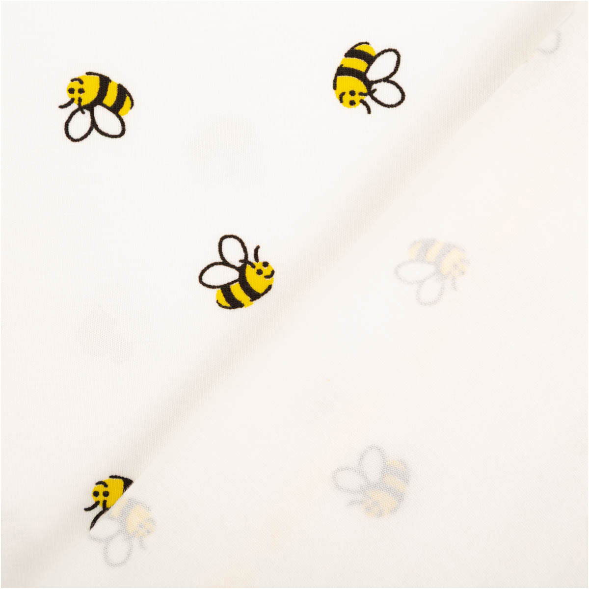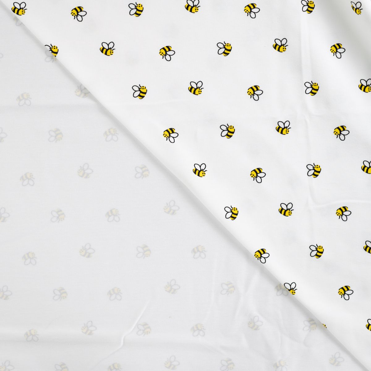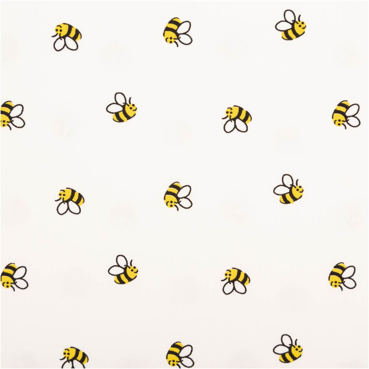 Süßes Bienenmuster: kleine gelb-schwarze Bienen auf weißem Grund – dezent, modern und leicht zu kombinieren.