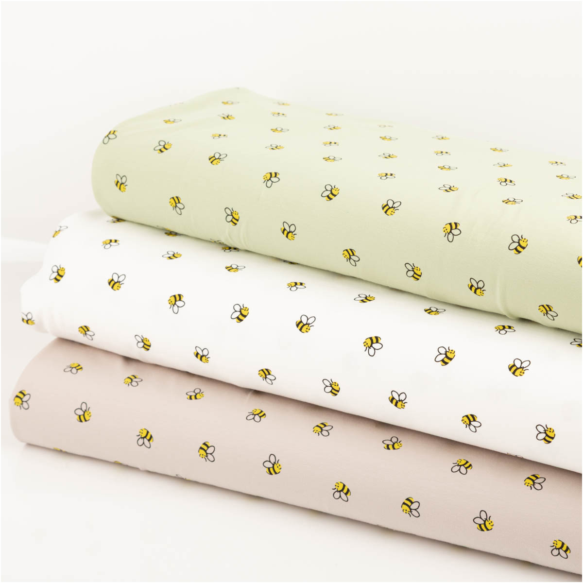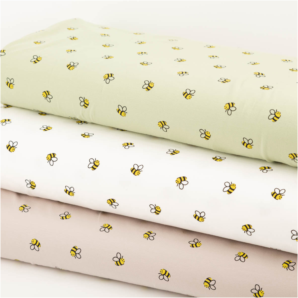 Du willst ein fröhliches Motiv, das trotzdem ruhig wirkt und sich super kombinieren lässt? Dieser Baumwolljersey in Weiß ist mit kleinen gelb-schwarzen Bienen bedruckt – klar, modern und einfach zuckersüß. Perfekt für bequeme Baby- und Kinderkleidung, die im Alltag mitmacht und dabei richtig gut aussieht.