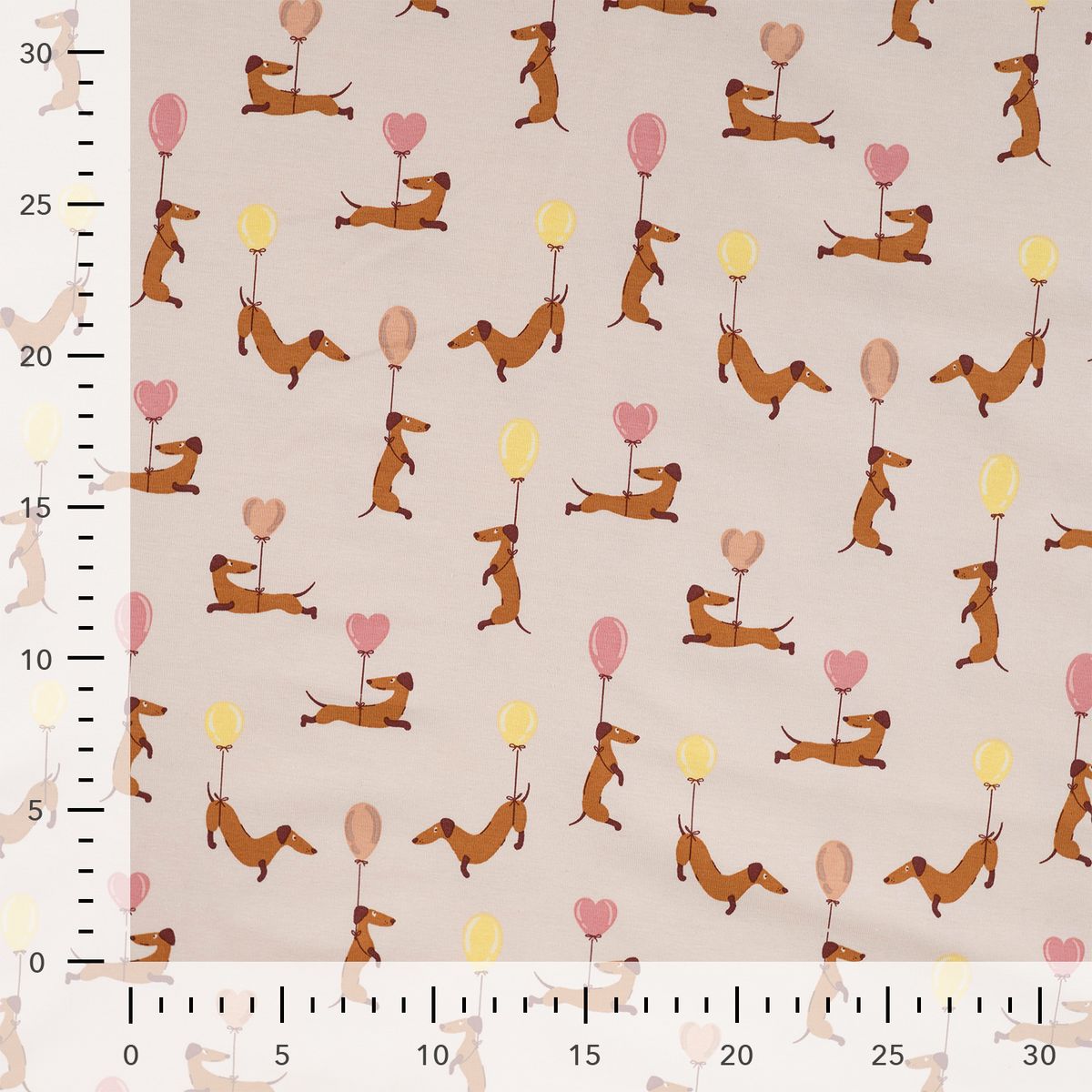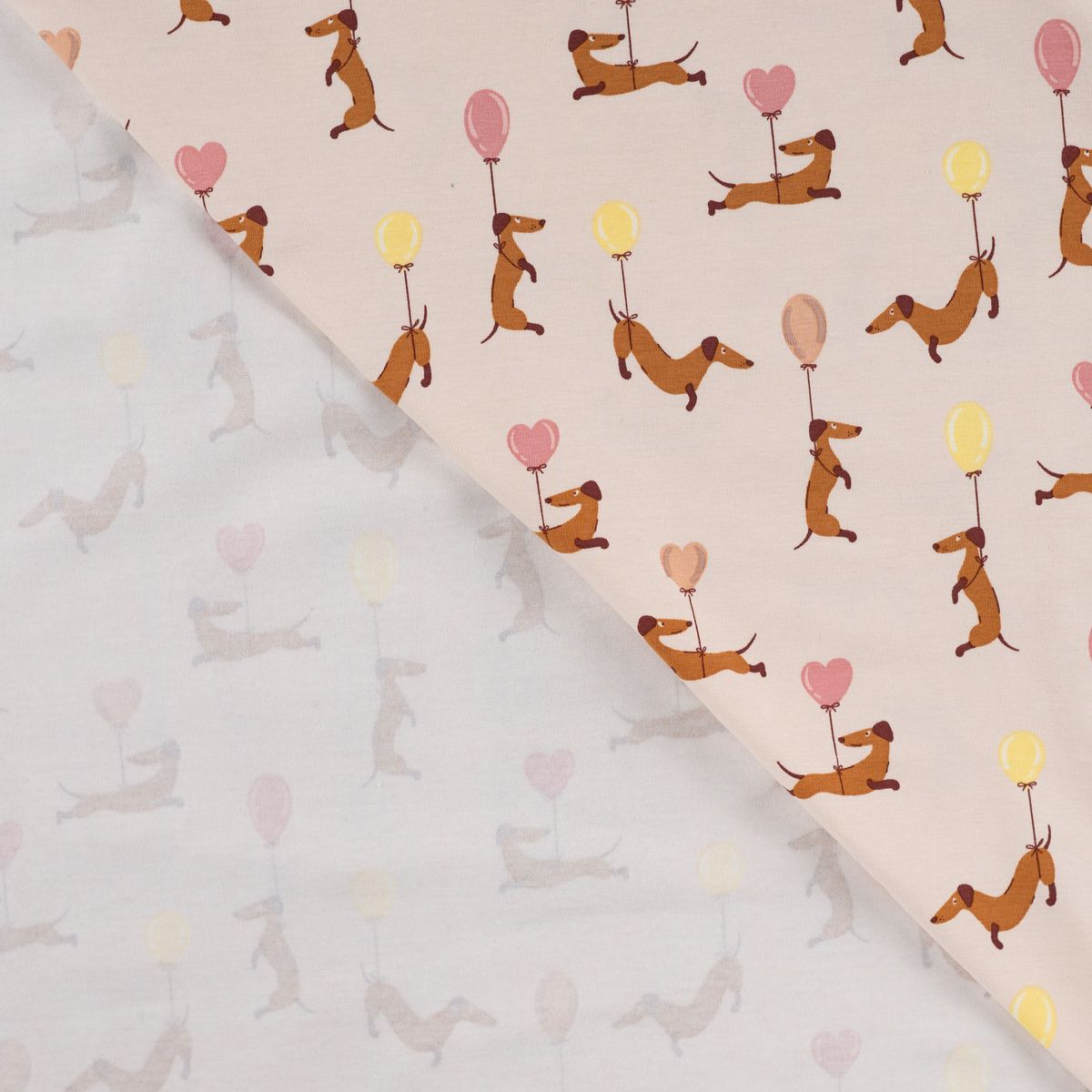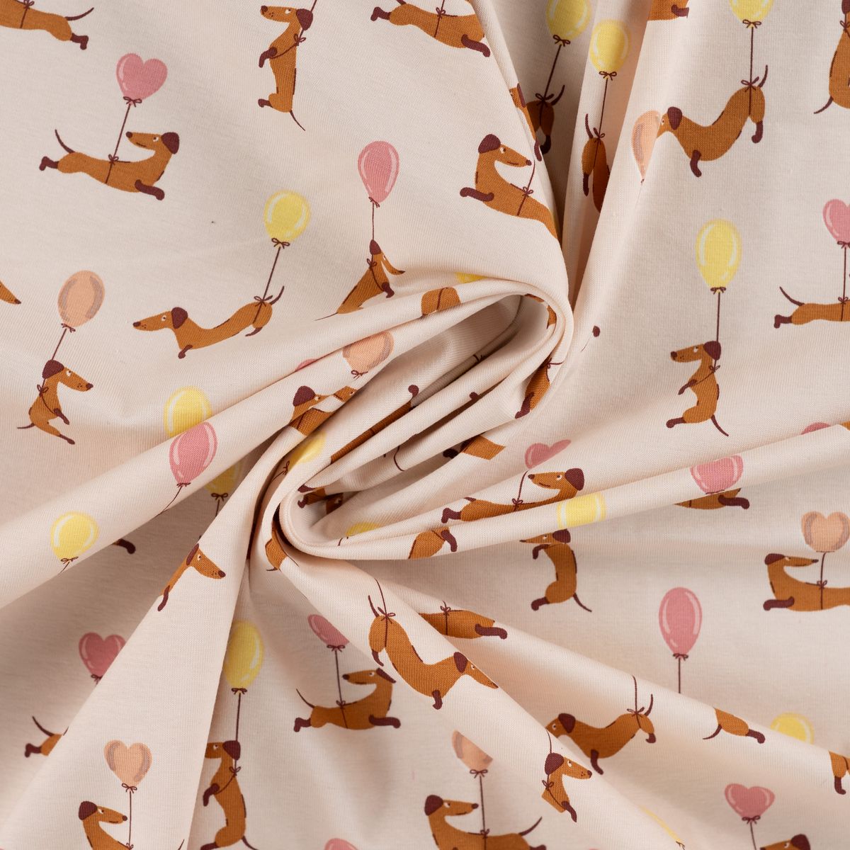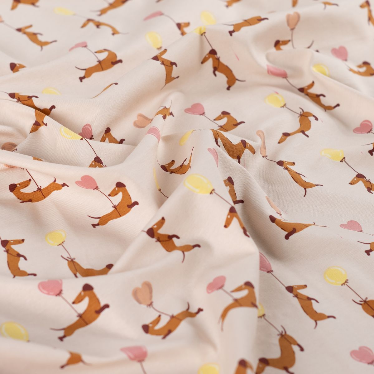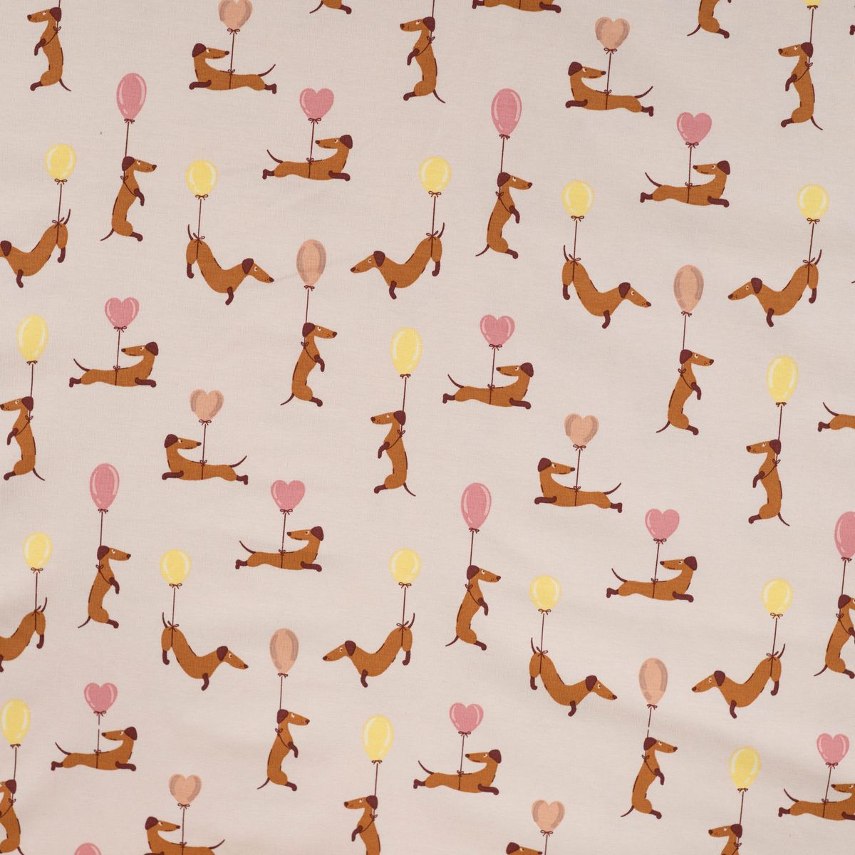 Baumwolljersey mit niedlichem Dackelmotiv und Ballons in Sand, Rosa und Gelb für fröhliche und liebevolle Nähideen