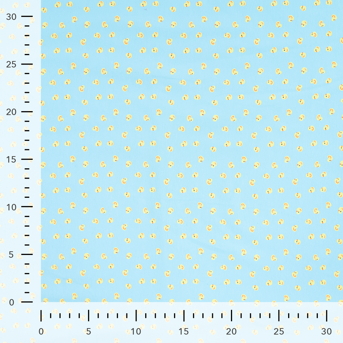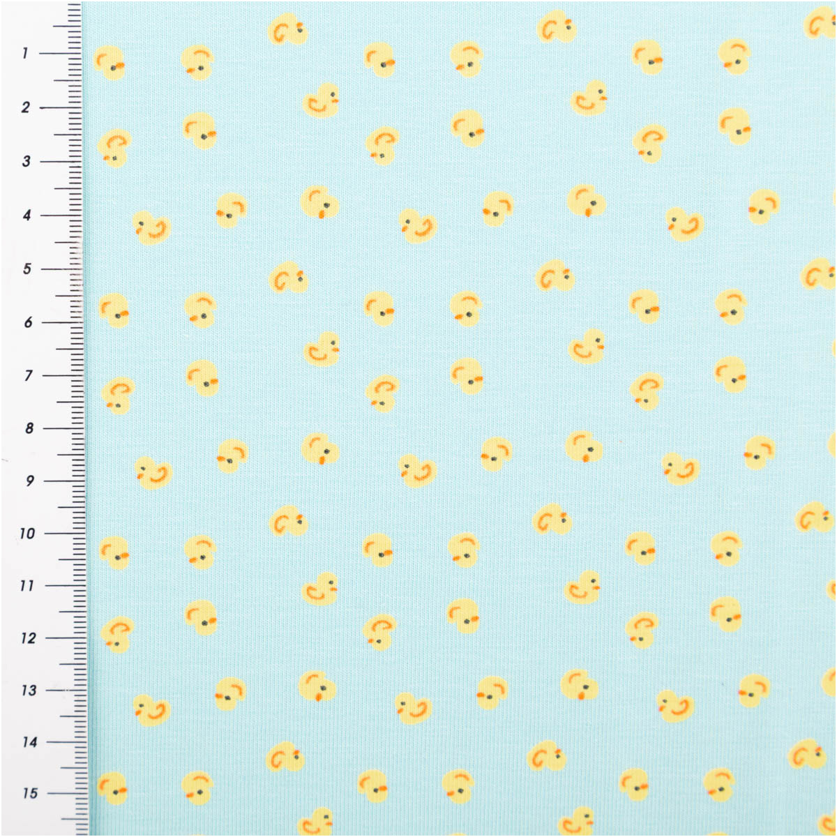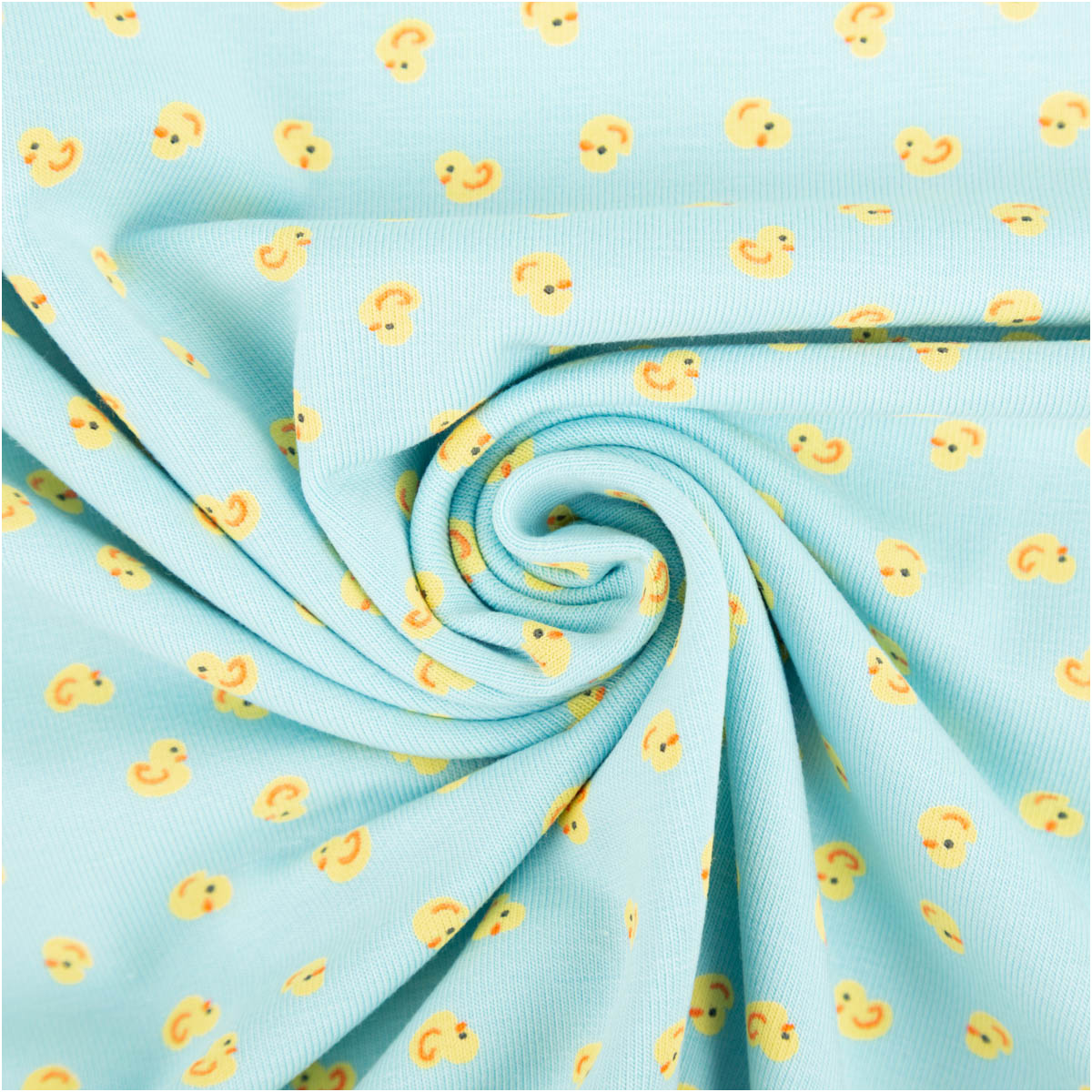 Die Entchen sind klein gehalten und regelmäßig verteilt. Dadurch wirkt der Stoff trotz der fröhlichen Farben ruhig und eignet sich hervorragend für Oberteile, Hosen oder ganze Sets.