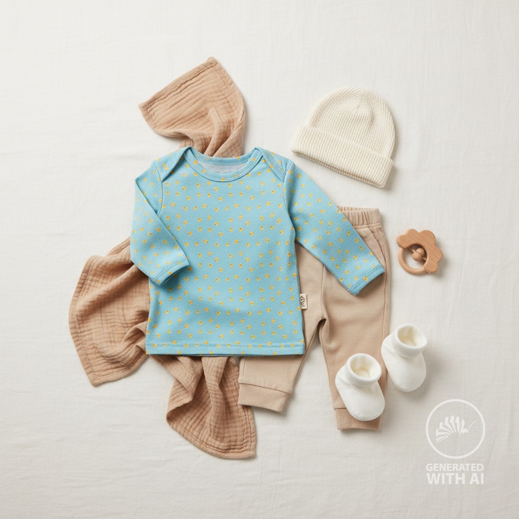 Fröhliches Entchenmuster: kleine gelbe Entchen auf türkisfarbenem Grund – modern, freundlich und perfekt für Baby- und Kinderlooks.