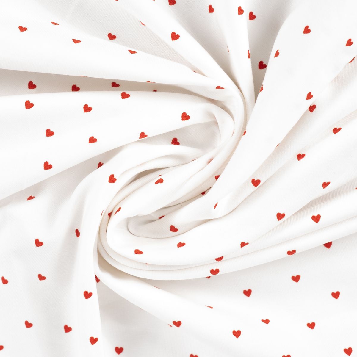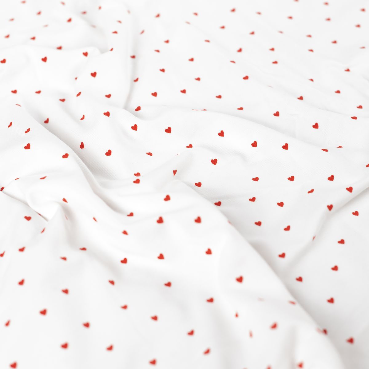 Die Farbkombination aus Weiß und Rot wirkt klar, freundlich und zeitlos. Die kleinen Herzchen sind dezent verteilt und machen den Stoff besonders vielseitig. Dadurch eignet er sich nicht nur für Babykleidung und Kinderkleidung, sondern auch für bequeme Oberteile, Nachtwäsche oder leichte Accessoires.