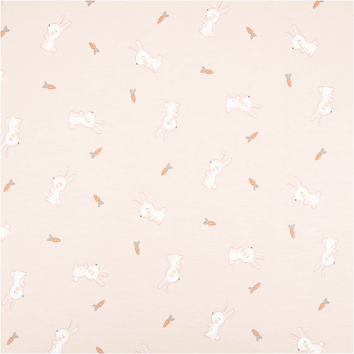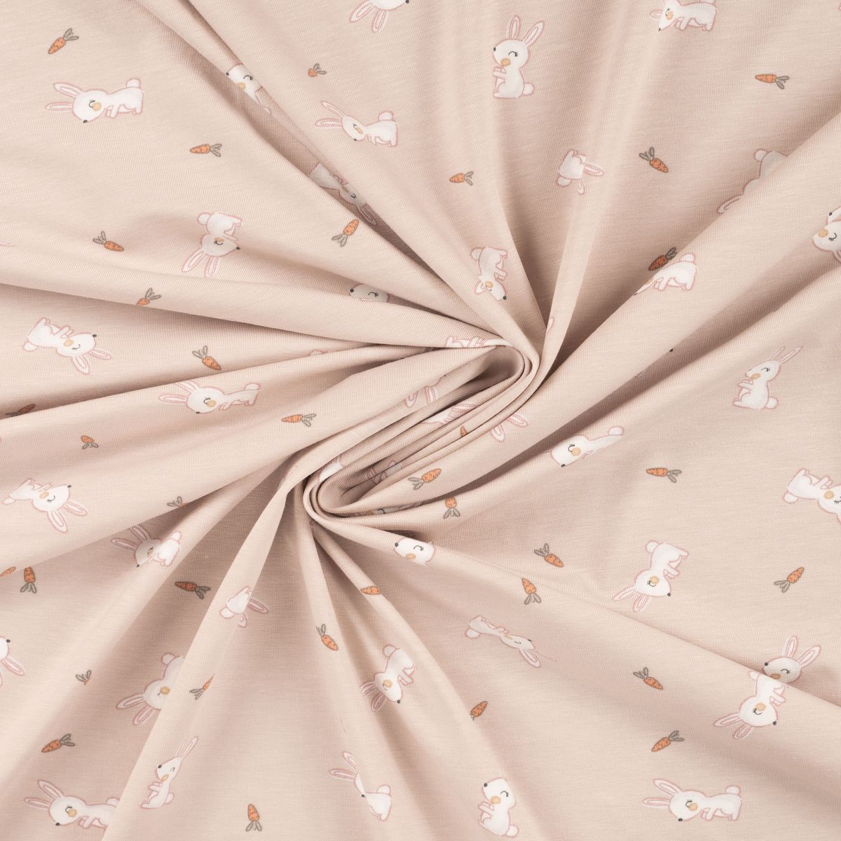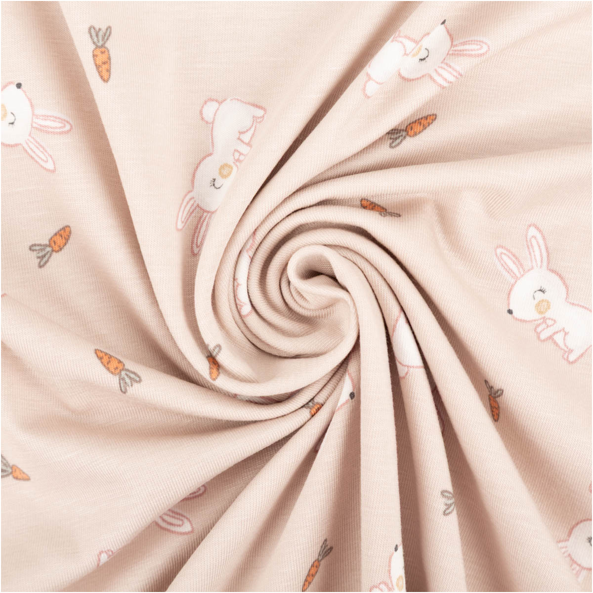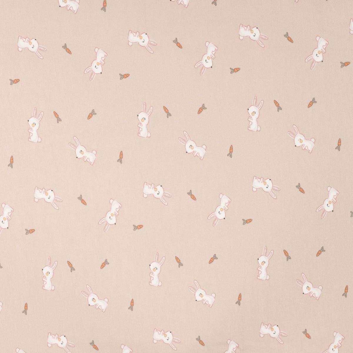 Liebevolles Motiv: weiße Kaninchen und kleine Möhren auf beigefarbigem Grund – süß, modern und perfekt kombinierbar mit Uni-Stoffen.