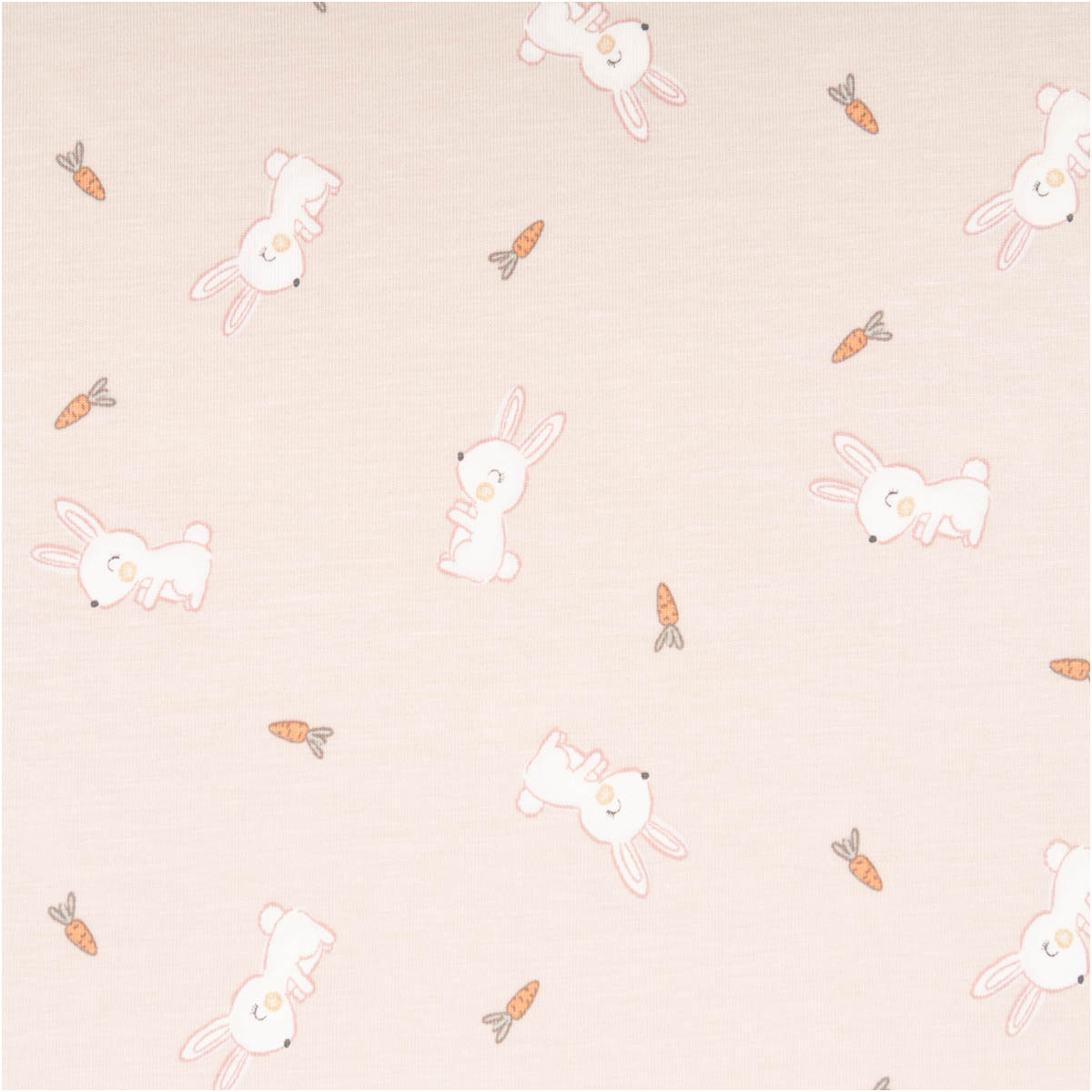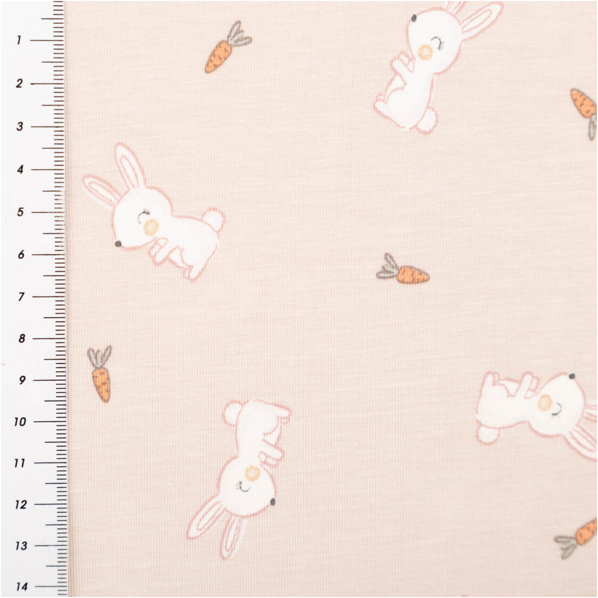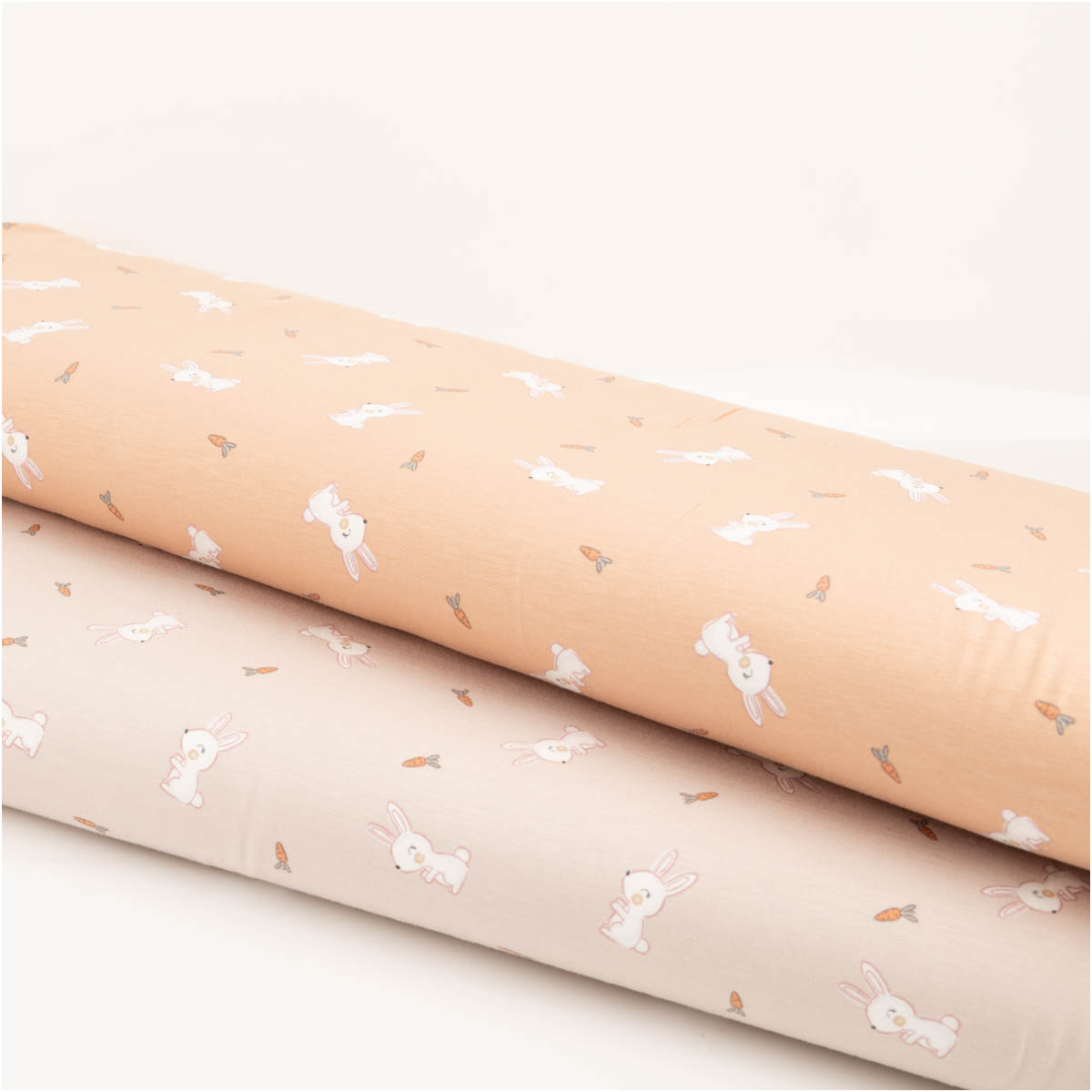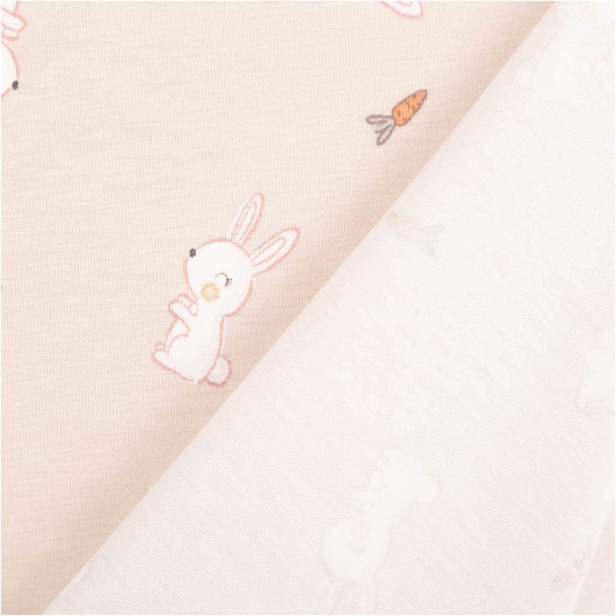 Liebevolles Motiv: weiße Kaninchen und kleine Möhren auf beigefarbigem Grund – süß, modern und perfekt kombinierbar mit Uni-Stoffen.