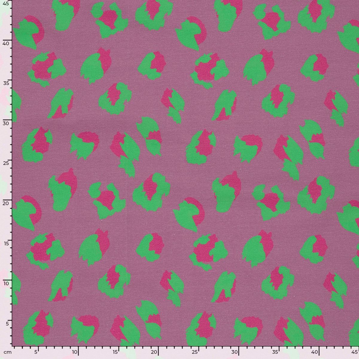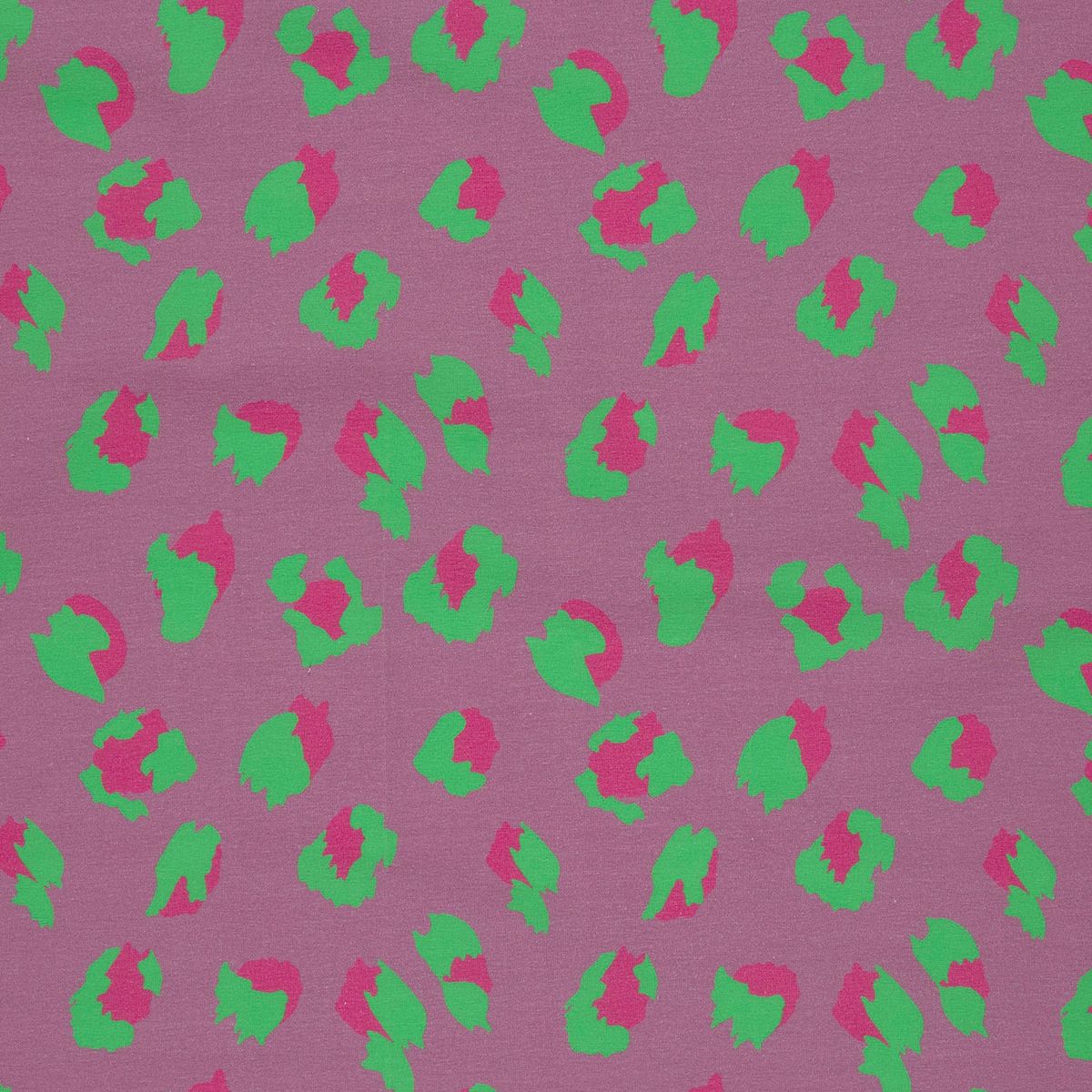 Weicher Baumwolljersey mit modernem Leo-Digitaldruck in leuchtendem Grün auf lila Hintergrund für auffällige und kreative Nähprojekte