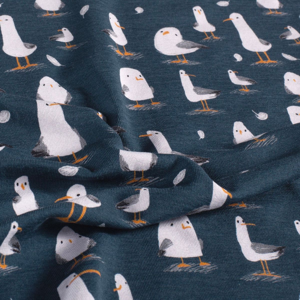 Baumwolljersey ist beliebt, weil er weich, dehnbar und hautangenehm ist. Genau diese Eigenschaften machen ihn zu einem idealen Stoff für bequeme Kleidung und viele kreative Nähideen für Groß und Klein. Durch den digitalen Druck wirkt das Möwenmotiv klar, freundlich und detailreich.