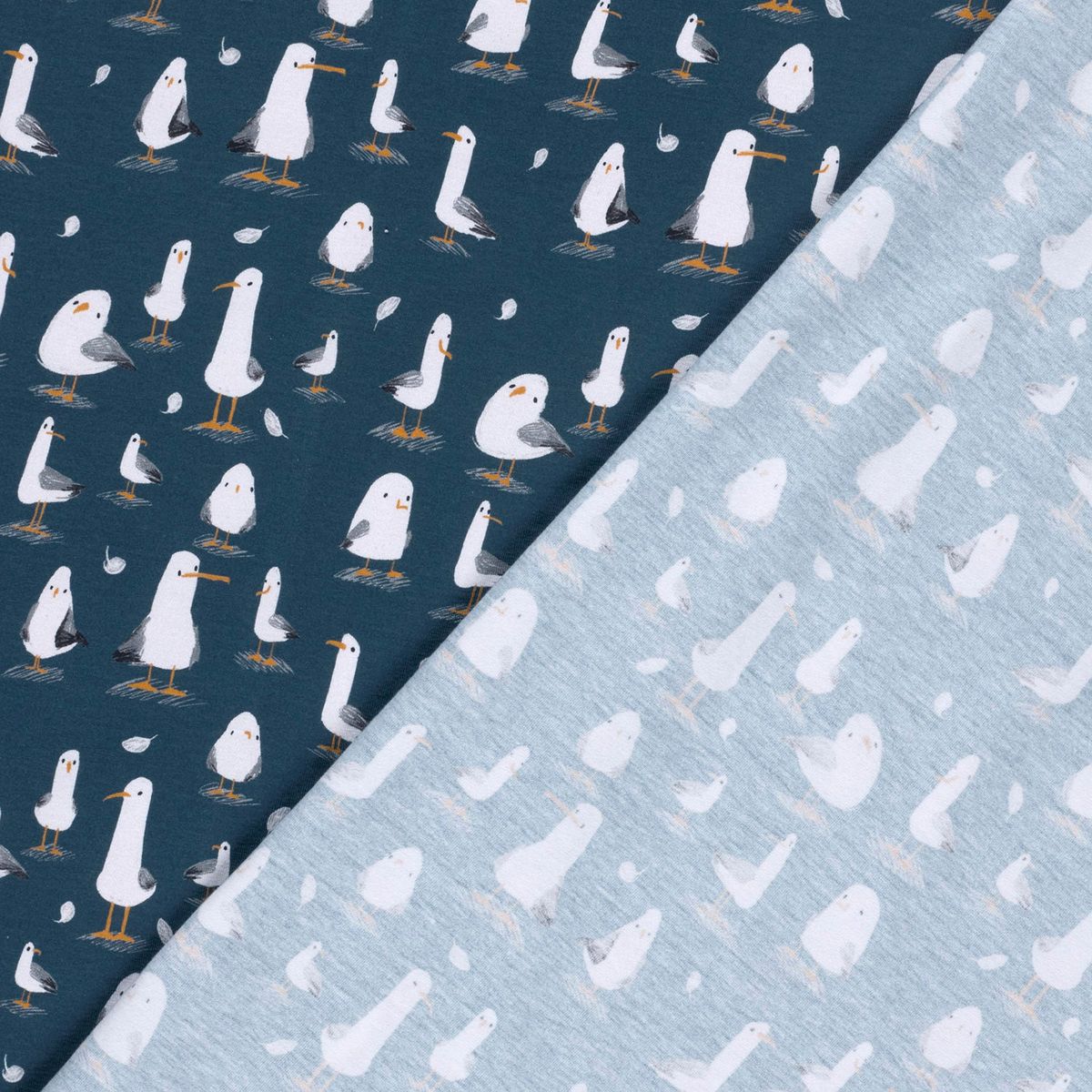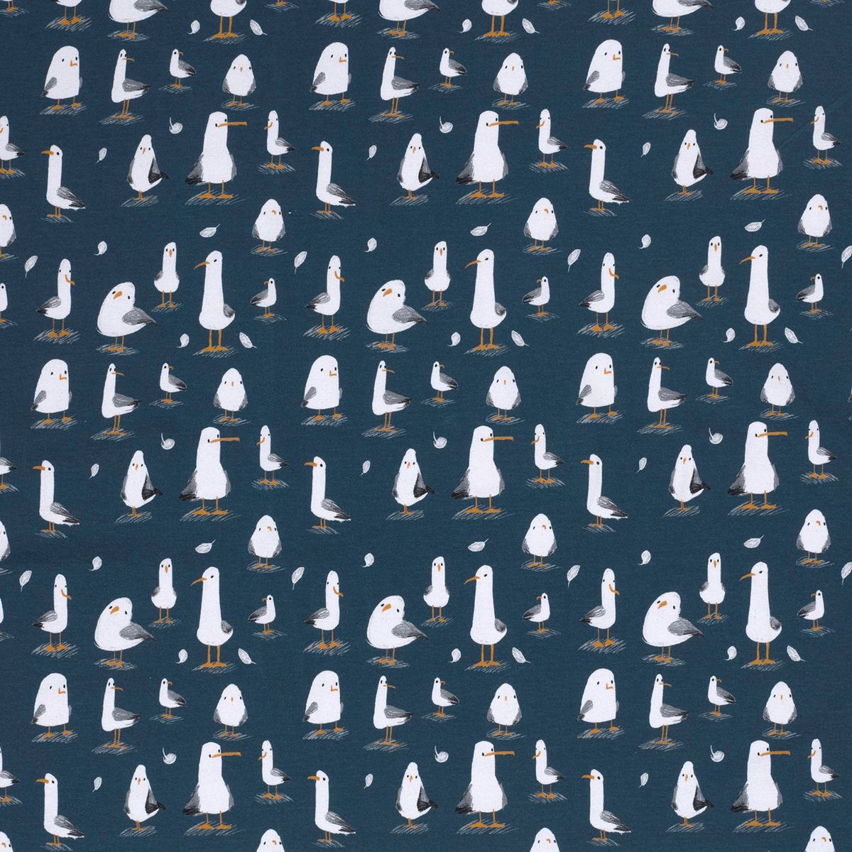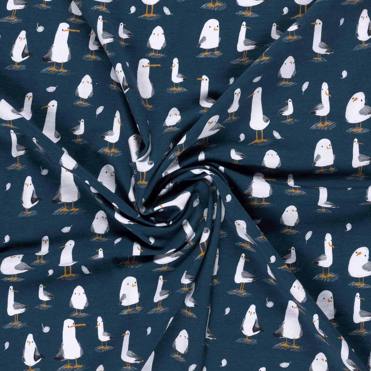 MARITIMES MÖWENMUSTER: Digital bedruckter Jersey mit weißen Möwen auf dunkelblauem Hintergrund für moderne, frische und kindgerechte Nähprojekte