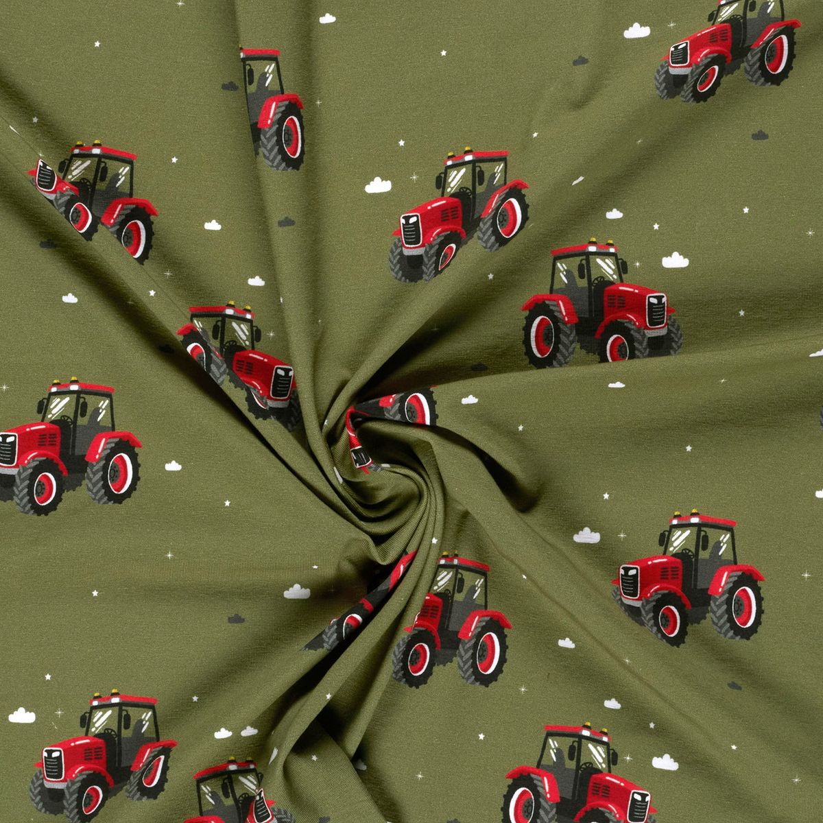 Dieser Baumwolljersey aus der Kollektion Fräulein von Julie ist eine tolle Wahl für alle, die Kinderstoffe mit Charakter suchen. Auf dem grünen Hintergrund kommen die roten Traktoren besonders schön zur Geltung und verleihen dem Stoff einen markanten, freundlichen und modernen Look. Der detailreiche Digitaldruck wirkt klar und lebendig und macht den Jersey zu einem echten Hingucker für viele Nähideen.