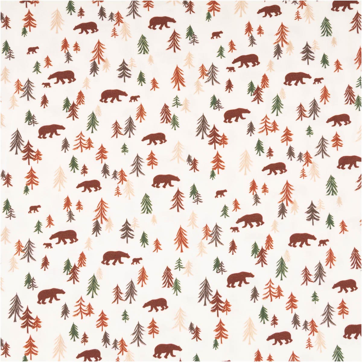 Waldmotiv mit Bären und Tannen in wollweiß und braun für eine natürliche Optik, ideal für Bekleidung, Kinder und Babybekleidung sowie kreative Nähprojekte