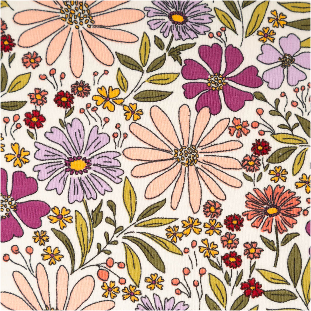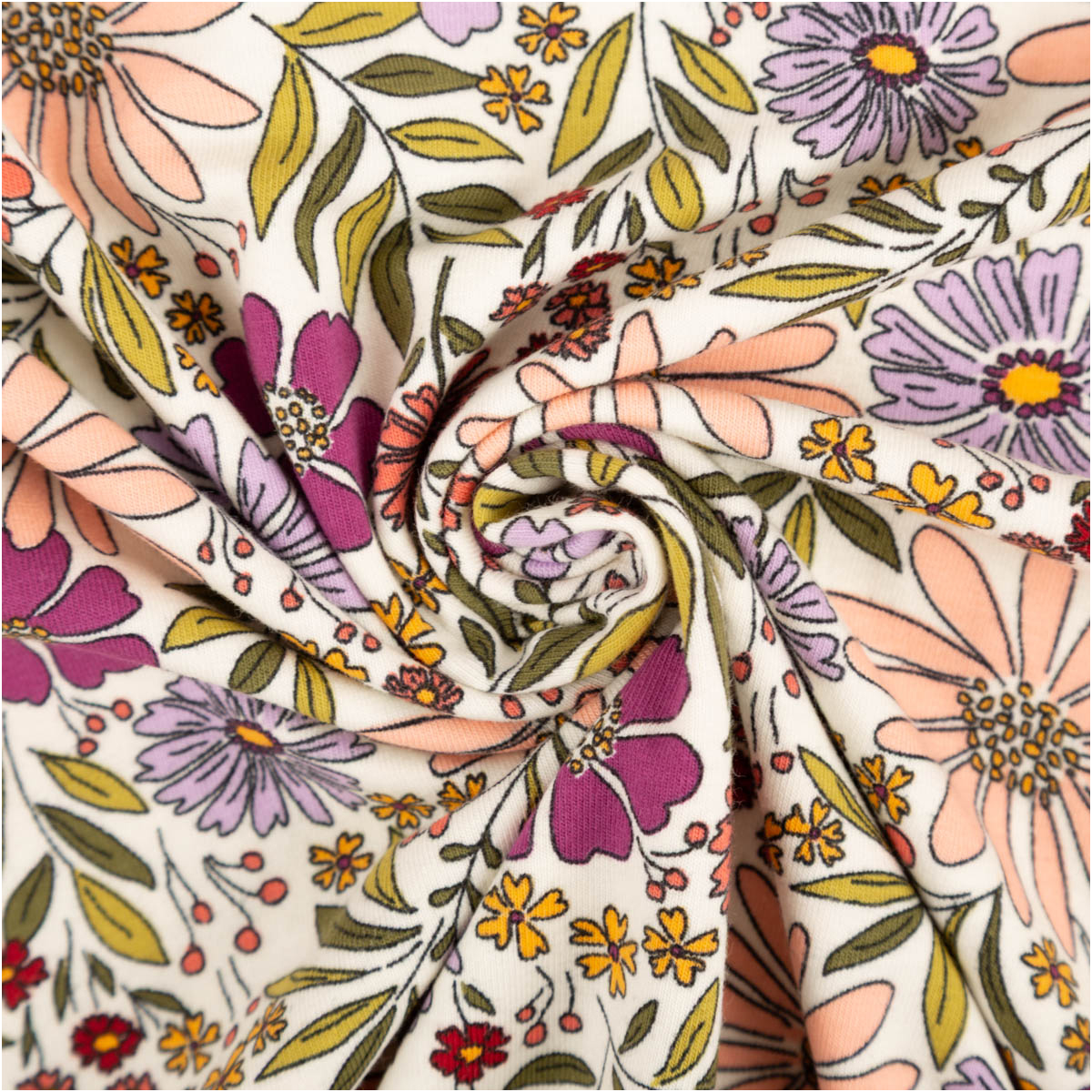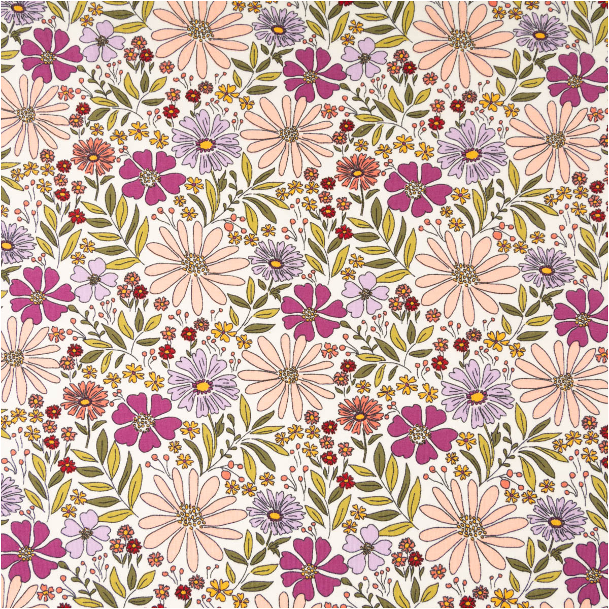 Dieser Baumwolljersey mit floralem Muster in Ecru, Grün, Lila und Rosa bringt eine natürliche, frische und zugleich feminine Ausstrahlung in deine Nähprojekte. Das detailreiche Blütendesign wirkt lebendig und harmonisch und eignet sich perfekt für Kleidung, die bequem ist und gleichzeitig schön aussieht. Als Meterware bietet dir der Stoff viel Spielraum für deine kreativen Ideen.