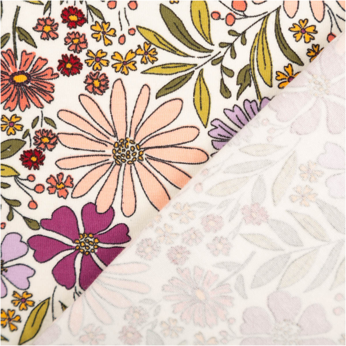 Das Blümchenmuster kombiniert verschiedene Farben zu einem harmonischen Gesamtbild. Ecru als Grundfarbe sorgt für eine ruhige Basis, während Grün, Lila und Rosa frische Akzente setzen. Dadurch entsteht ein Stoff, der sowohl verspielt als auch stilvoll wirkt und sich vielseitig kombinieren lässt.