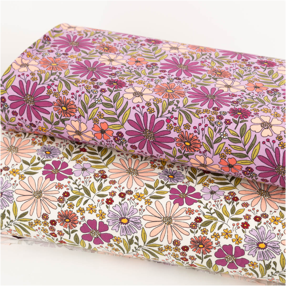 Jersey Stoff Blumen als Meterware in Ecru, Grün, Lila und Rosa