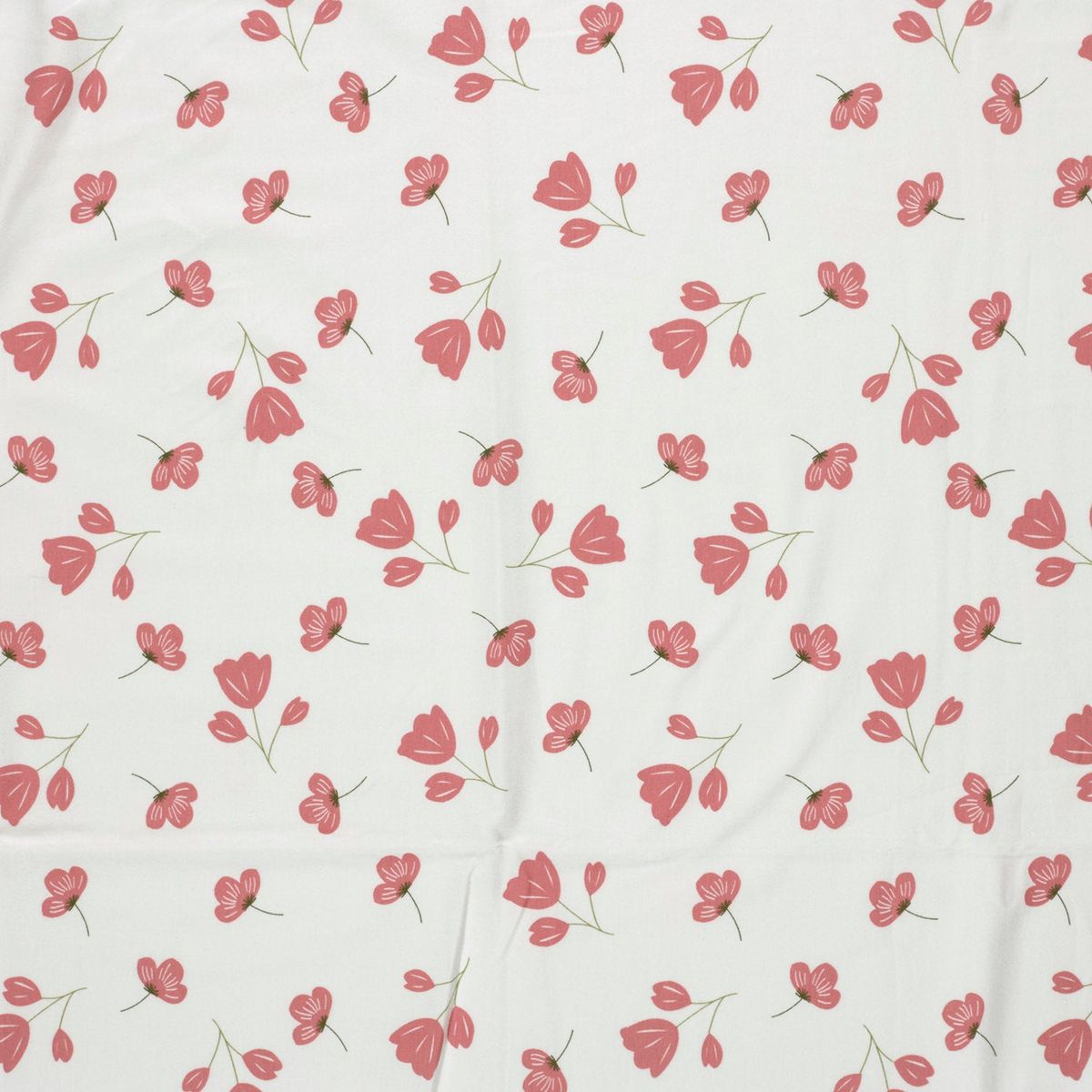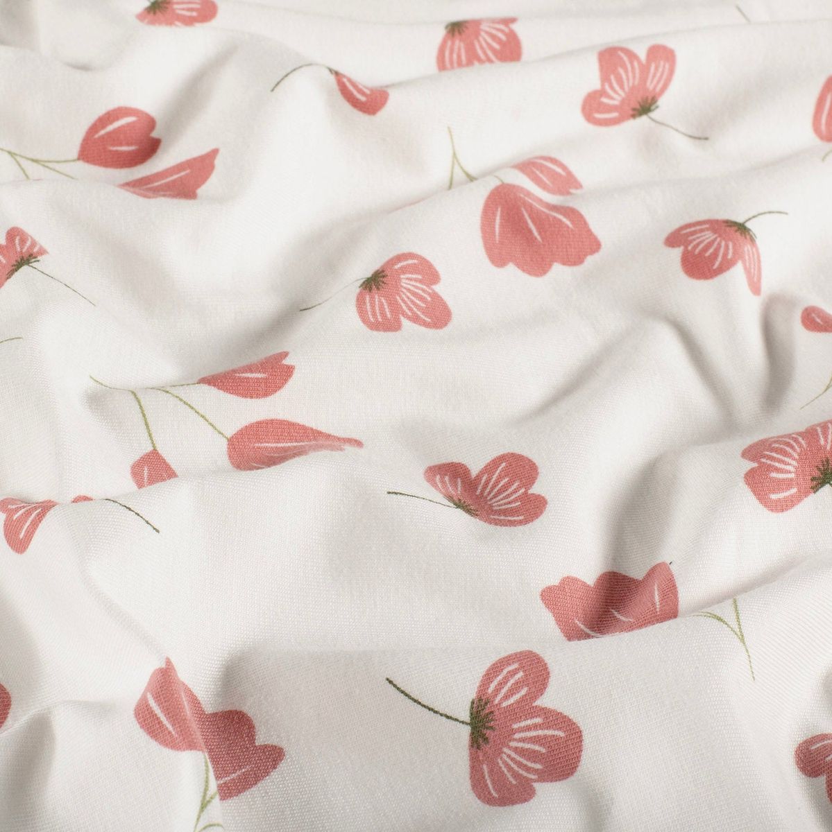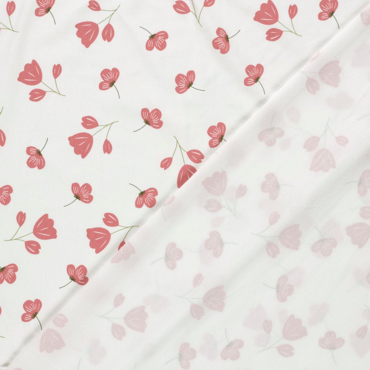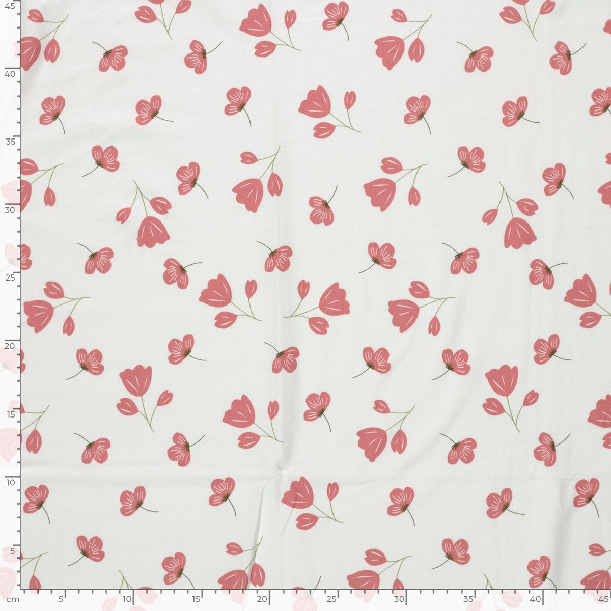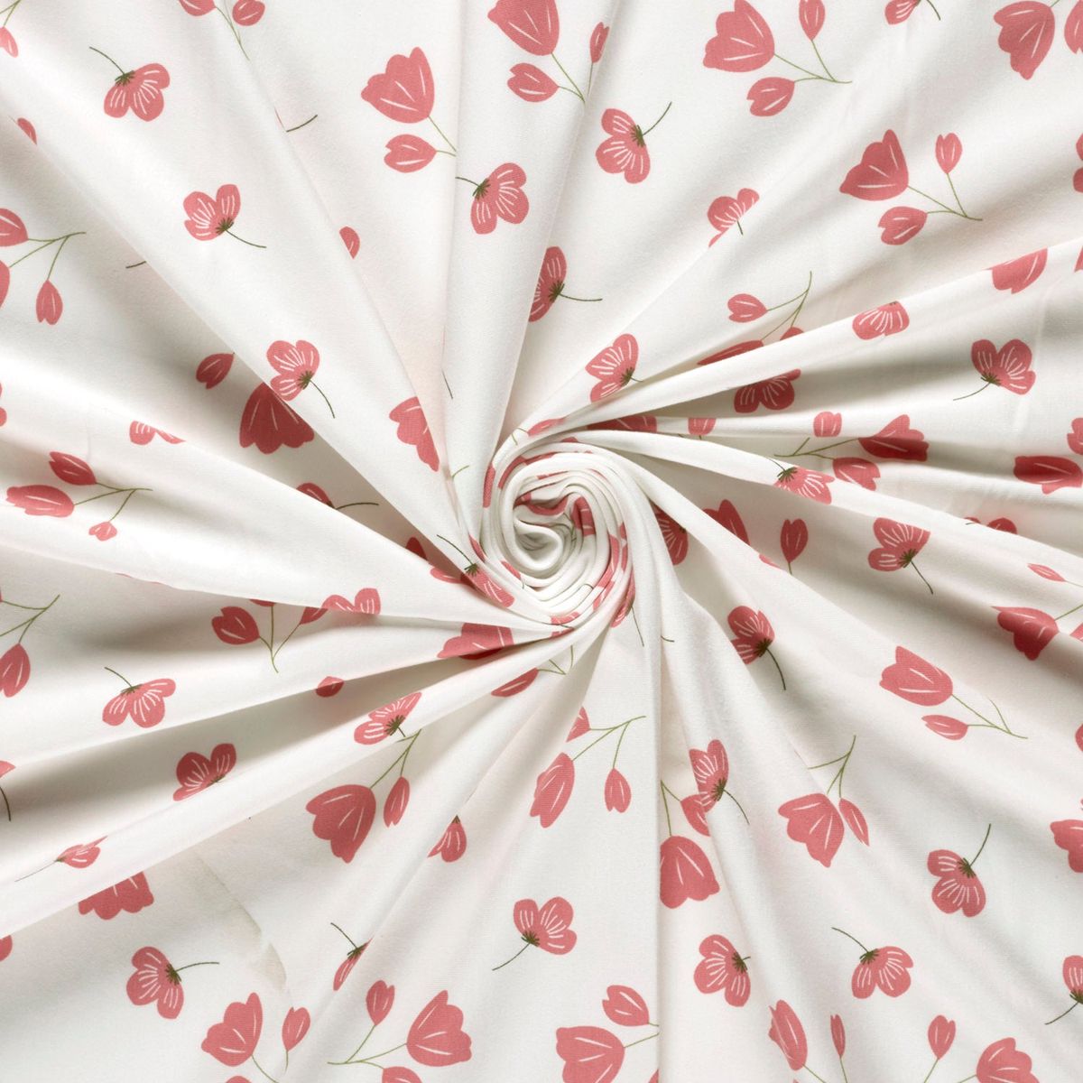 FLORALES DESIGN: Der Baumwolljersey besticht durch ein zartes Blumenmuster in Rosarot auf wollweißem Grund für eine elegante und frische Optik deiner Nähprojekte.