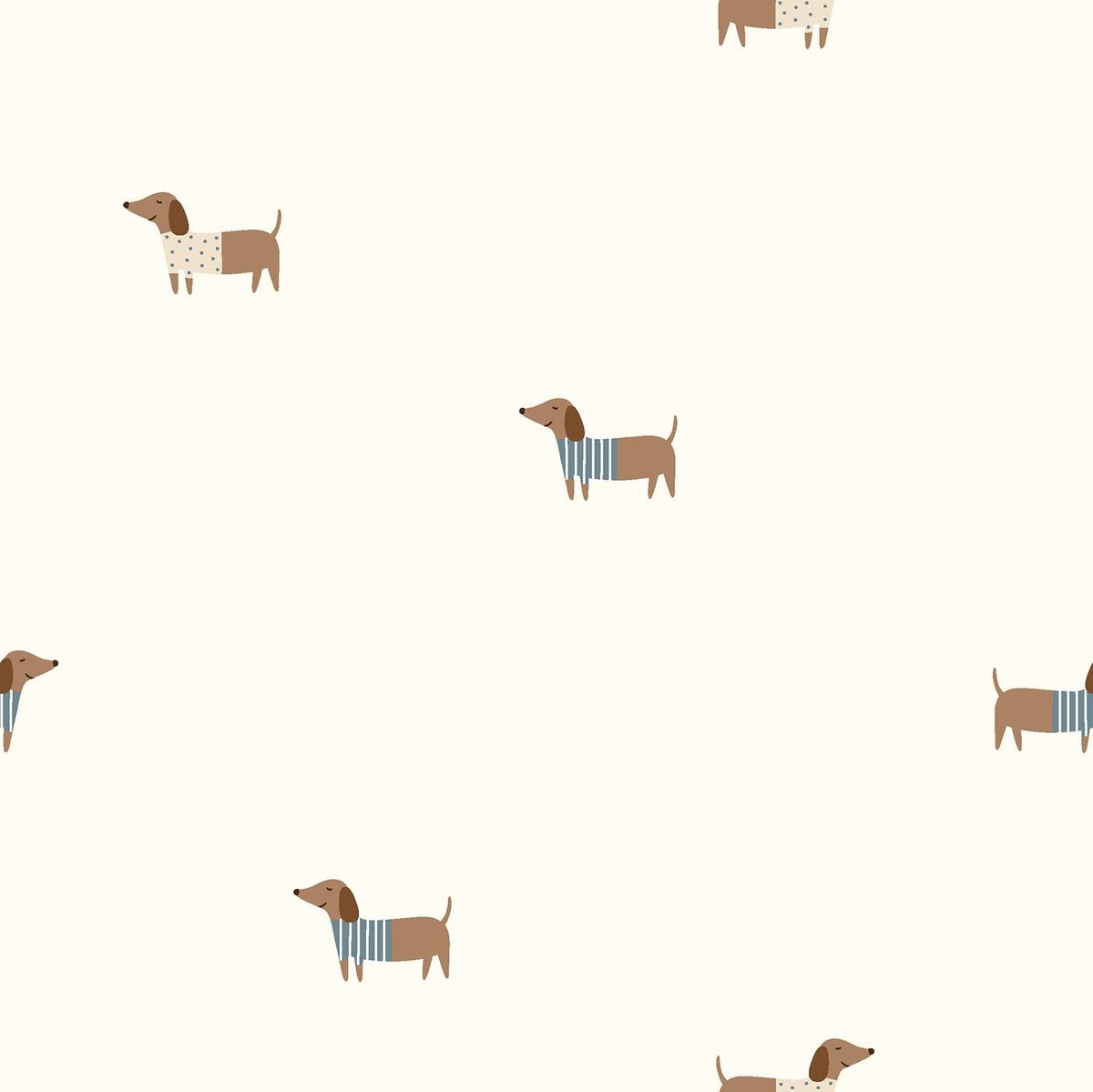 Design: Dackel-Motiv auf wollweißem Hintergrund, braune & blaue Akzente