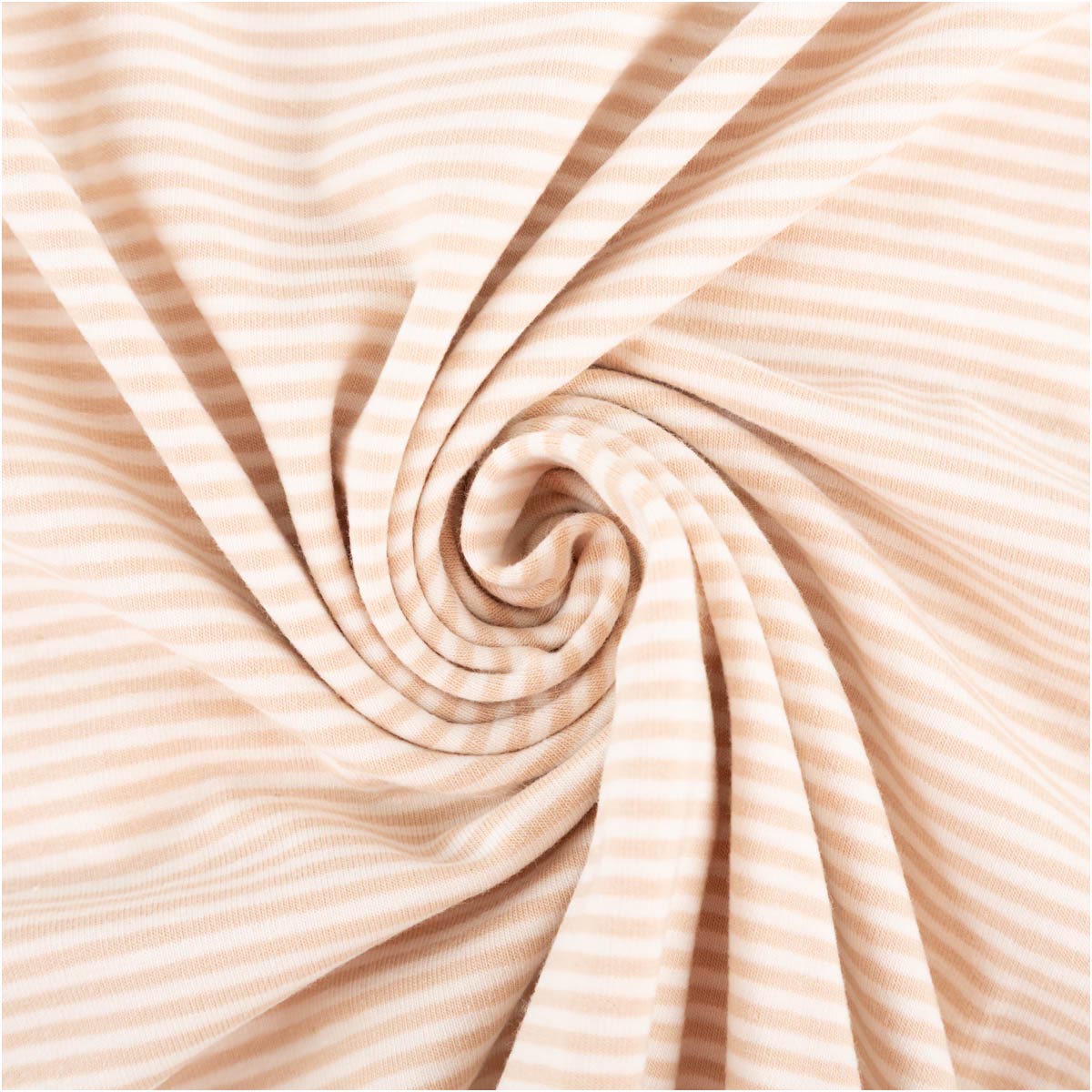 Dieser hochwertige Jersey Stoff aus Baumwolle begeistert mit seinem angenehmen Tragegefühl, weichem Fall und vielseitigen Einsatzmöglichkeiten. Die feinen garngefärbten Streifen in Weiß und Beige verleihen dem Stoff eine zeitlose Optik, die sich perfekt für Bekleidung, Accessoires und Babyausstattung eignet.