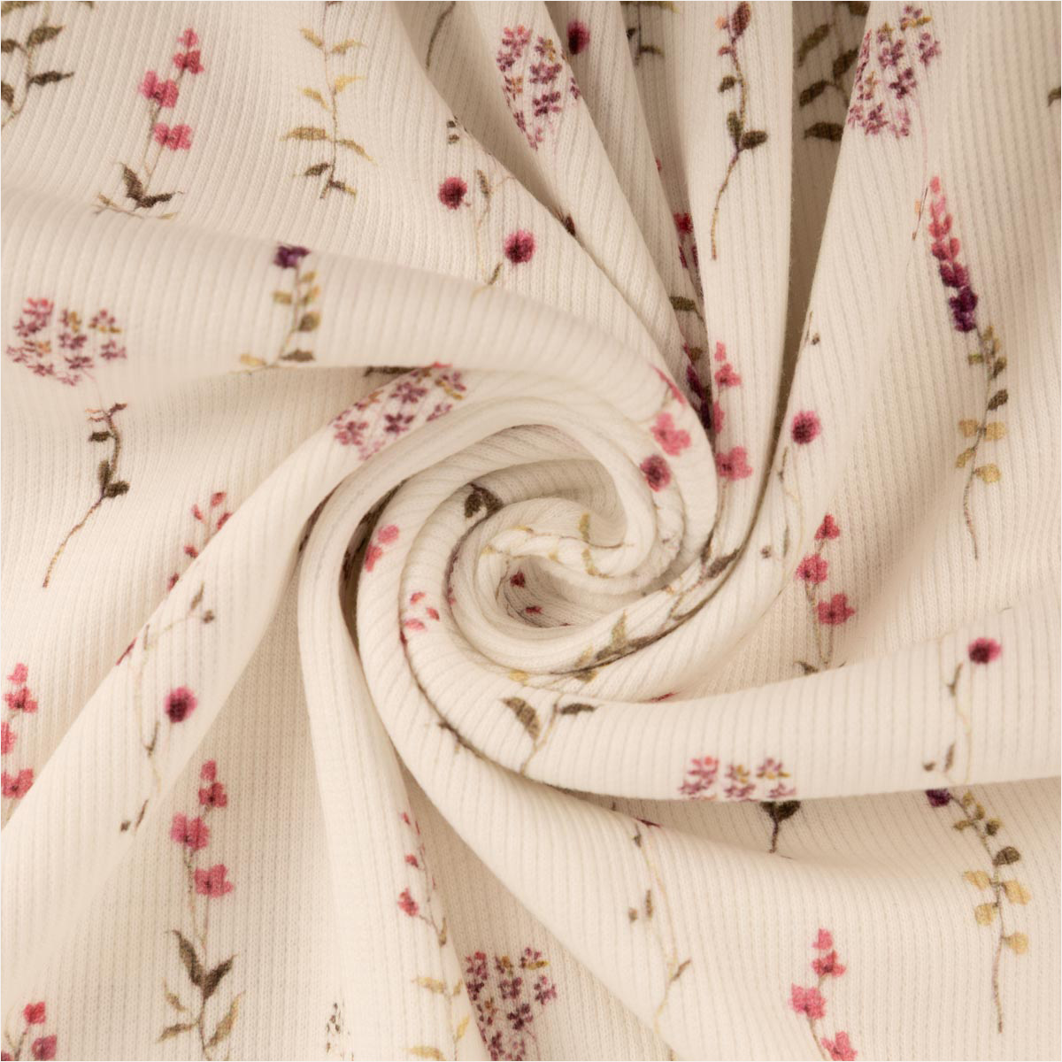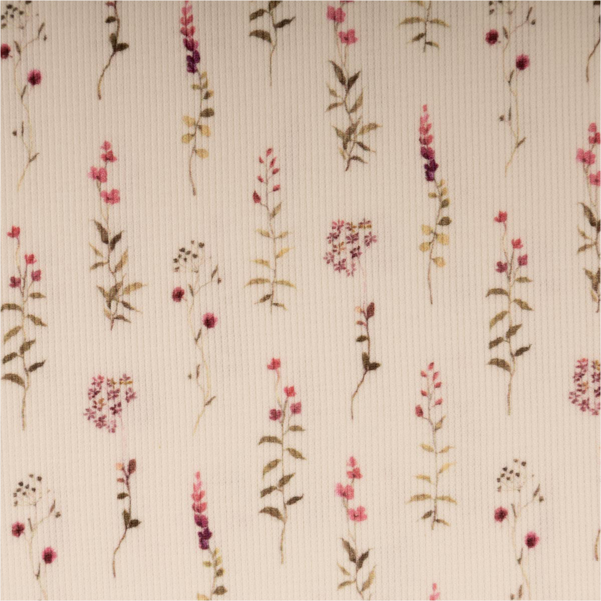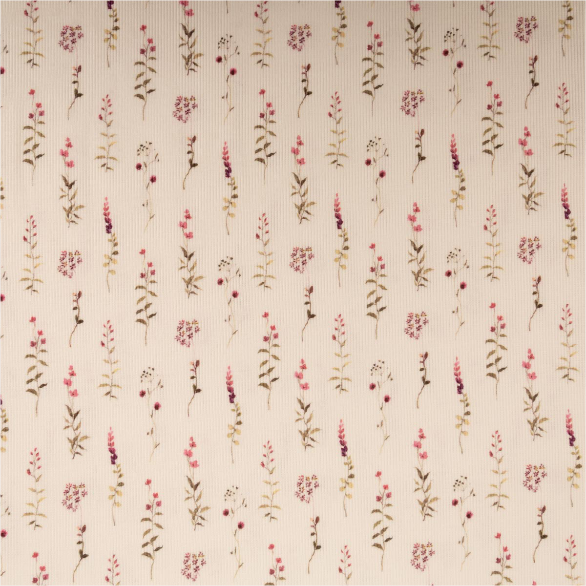 Weicher Rippjersey mit zartem Blümchenmuster in Rosa und Grün auf wollweißem Grund