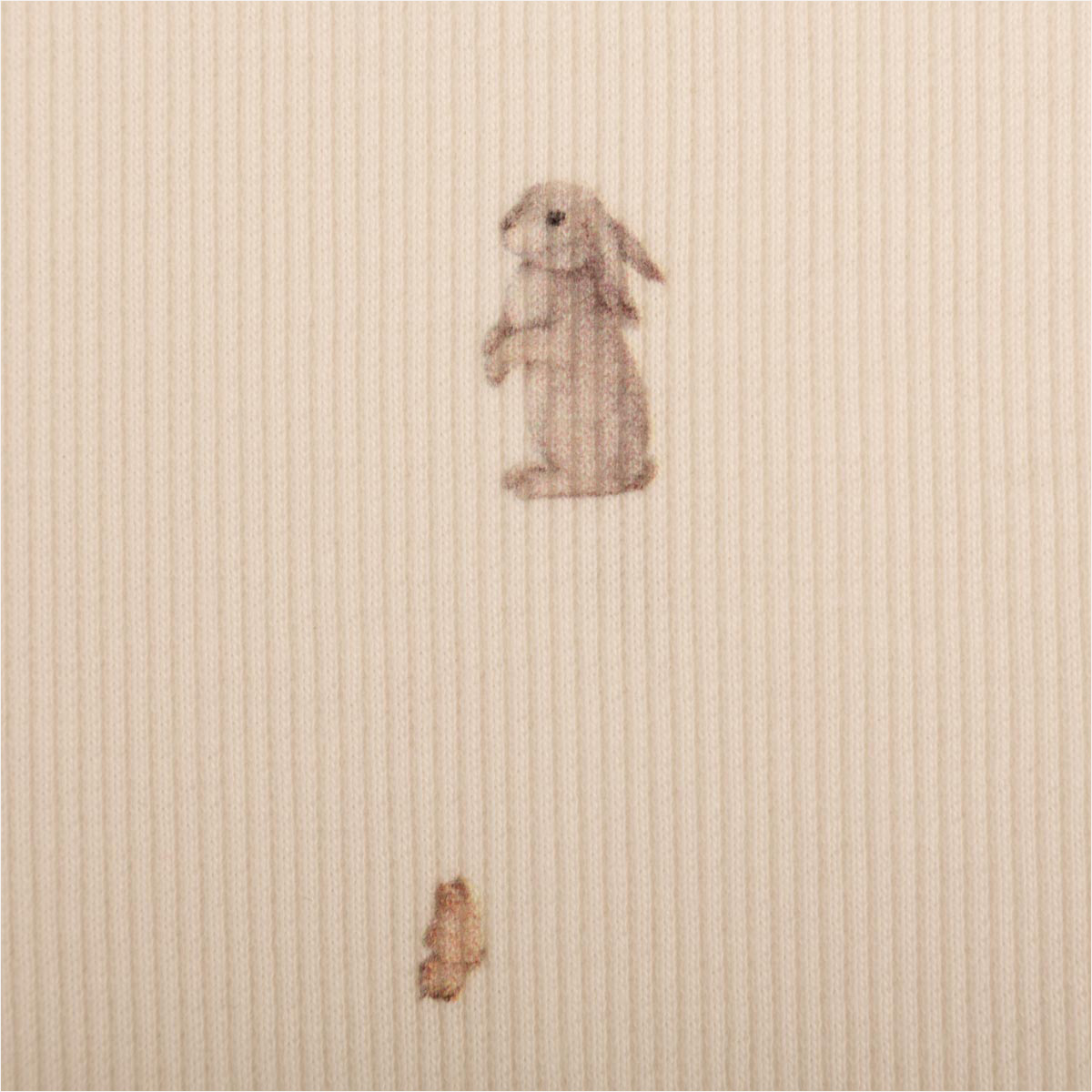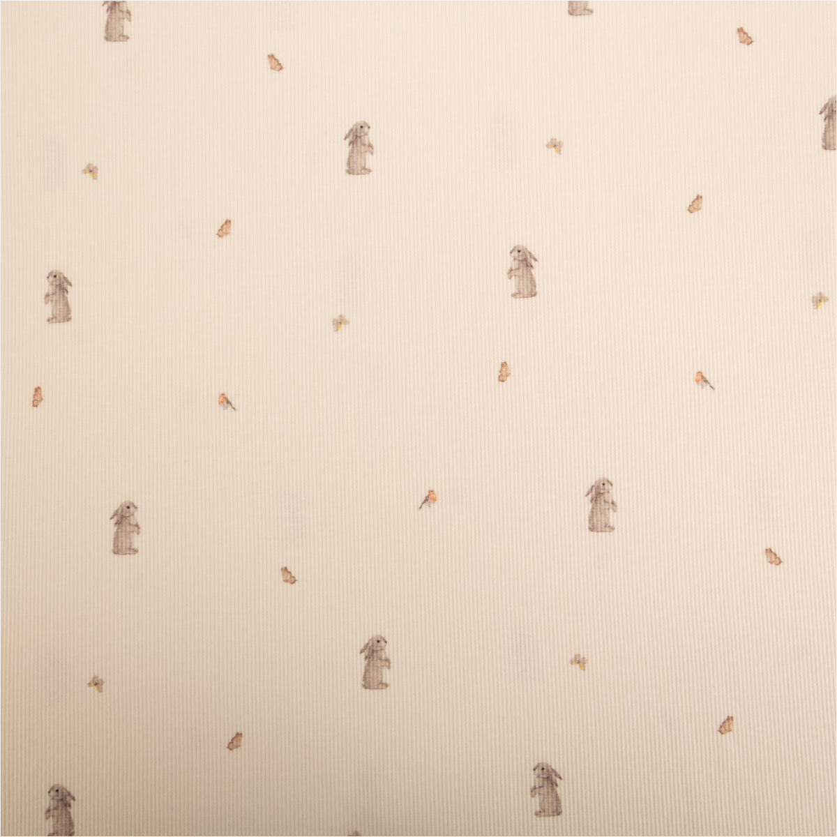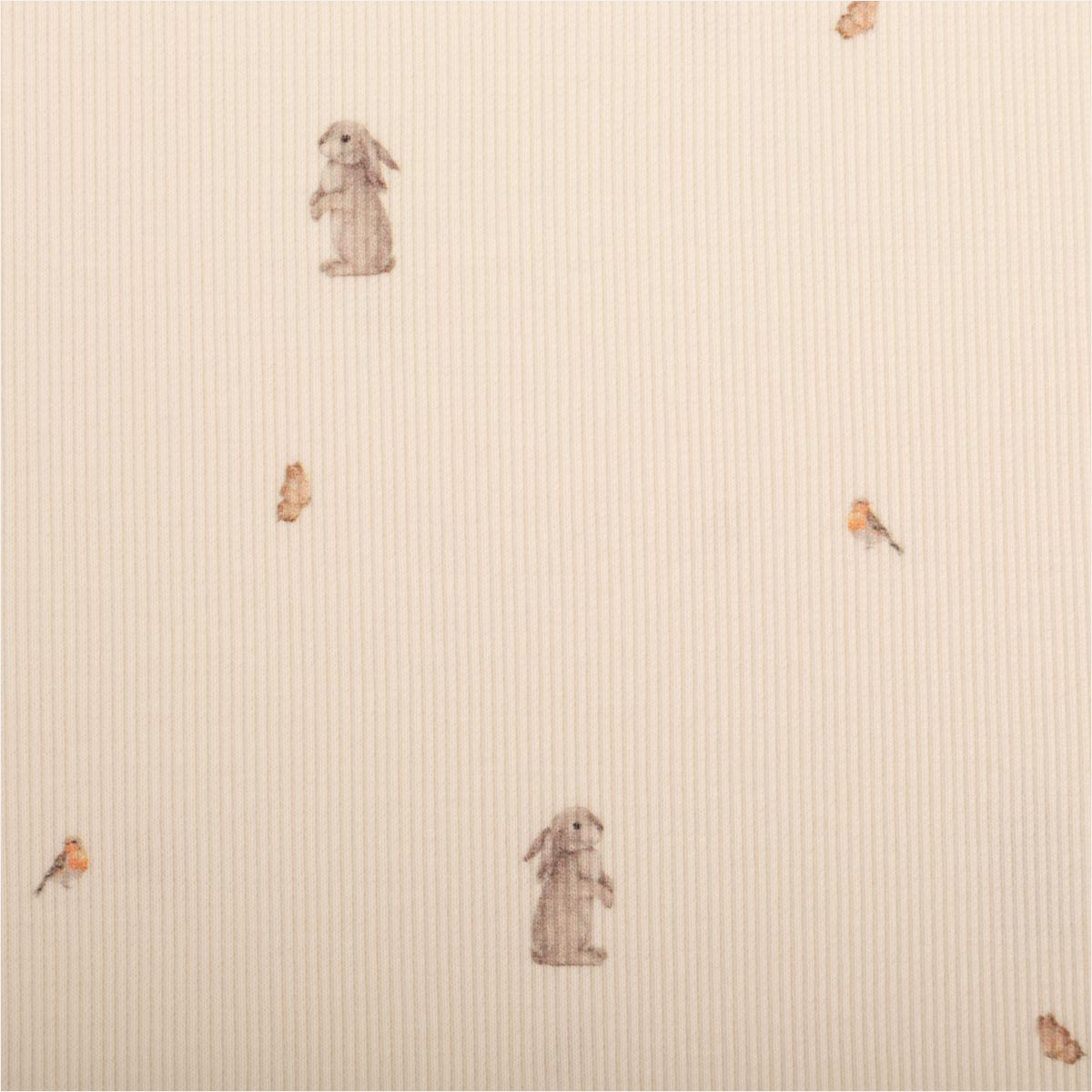 Rippjersey mit Hase-, Rotkehlchen- und Schmetterlingsmotiv auf wollweißem Grund