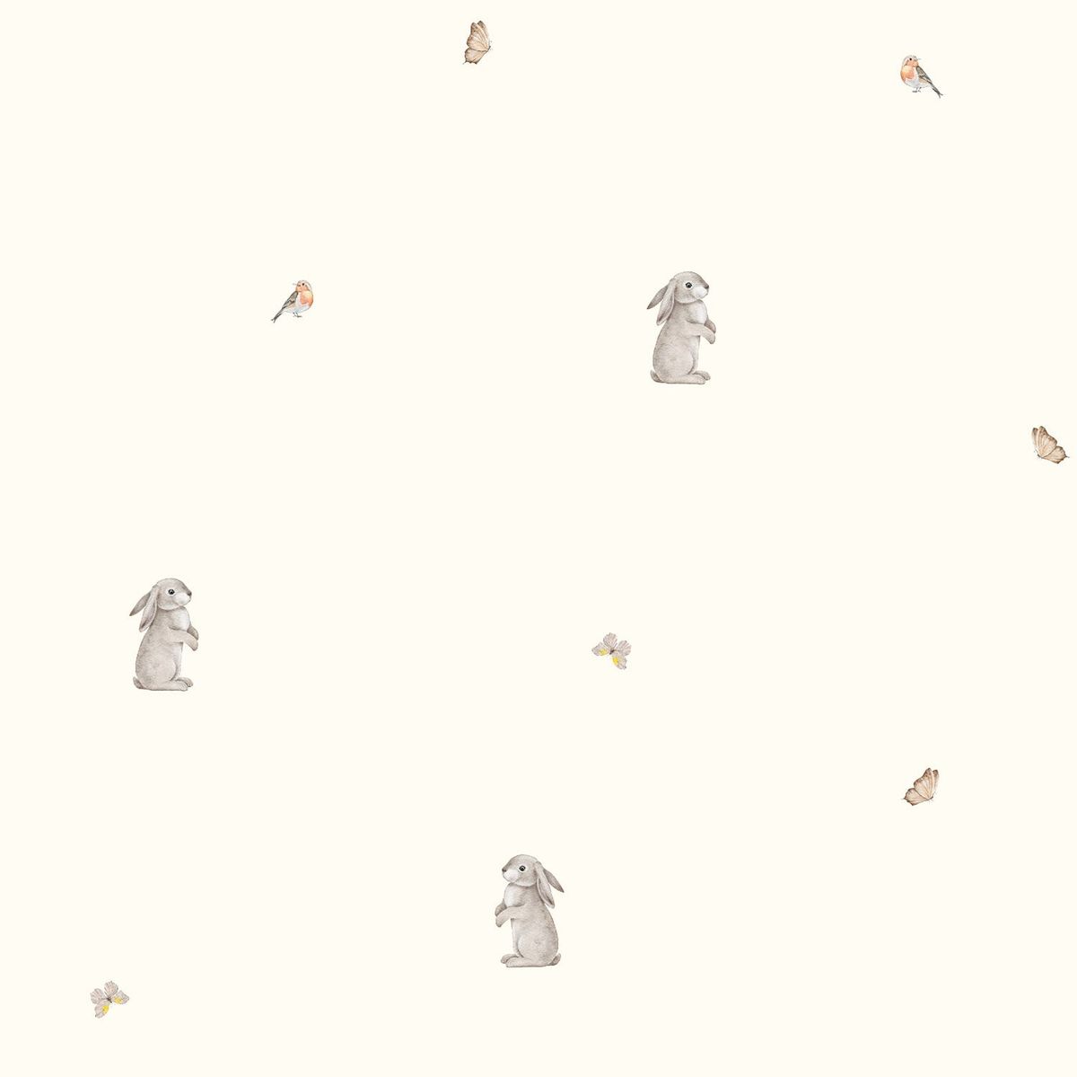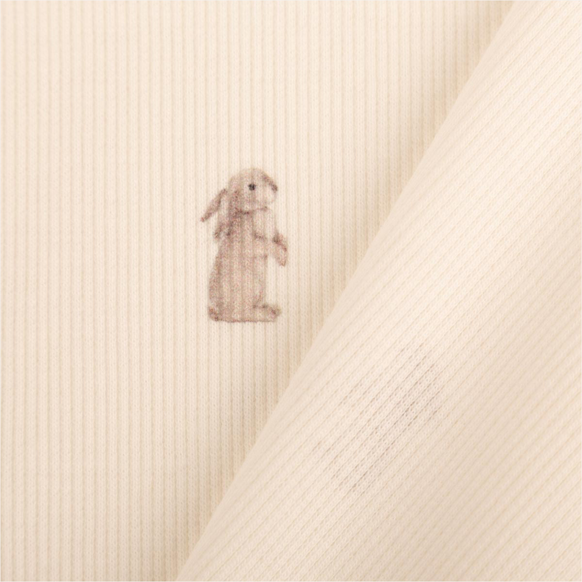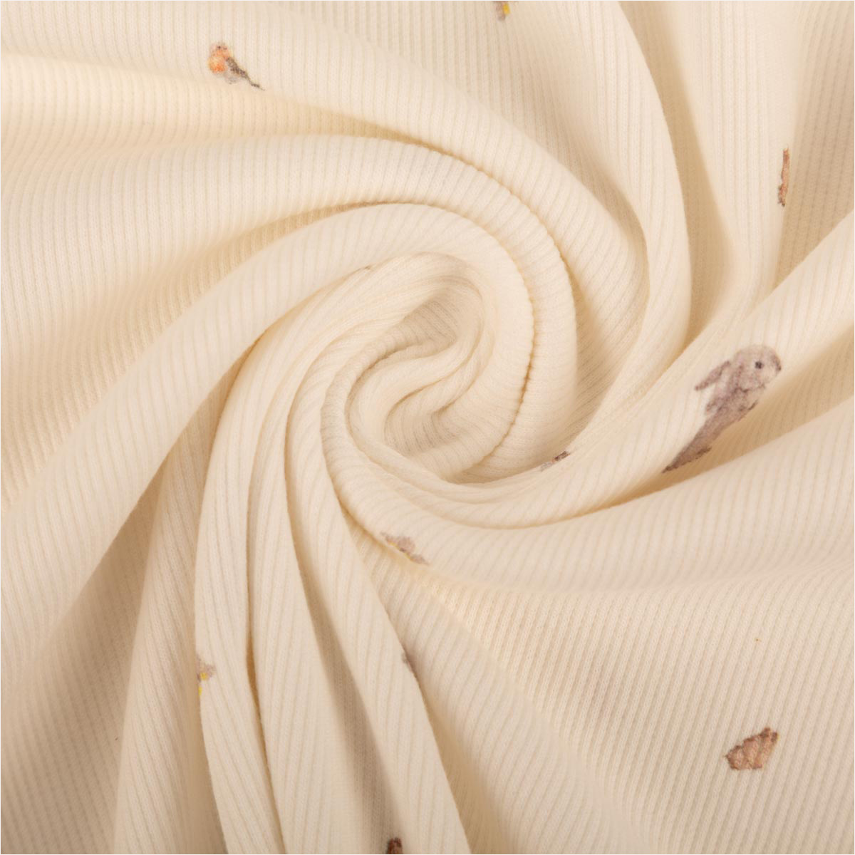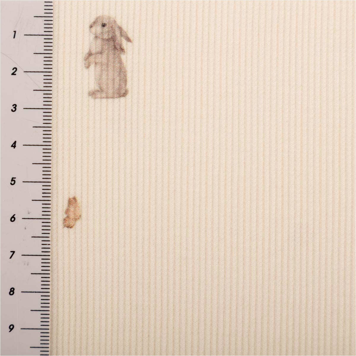 Rippjersey mit Hase-, Rotkehlchen- und Schmetterlingsmotiv auf wollweißem Grund