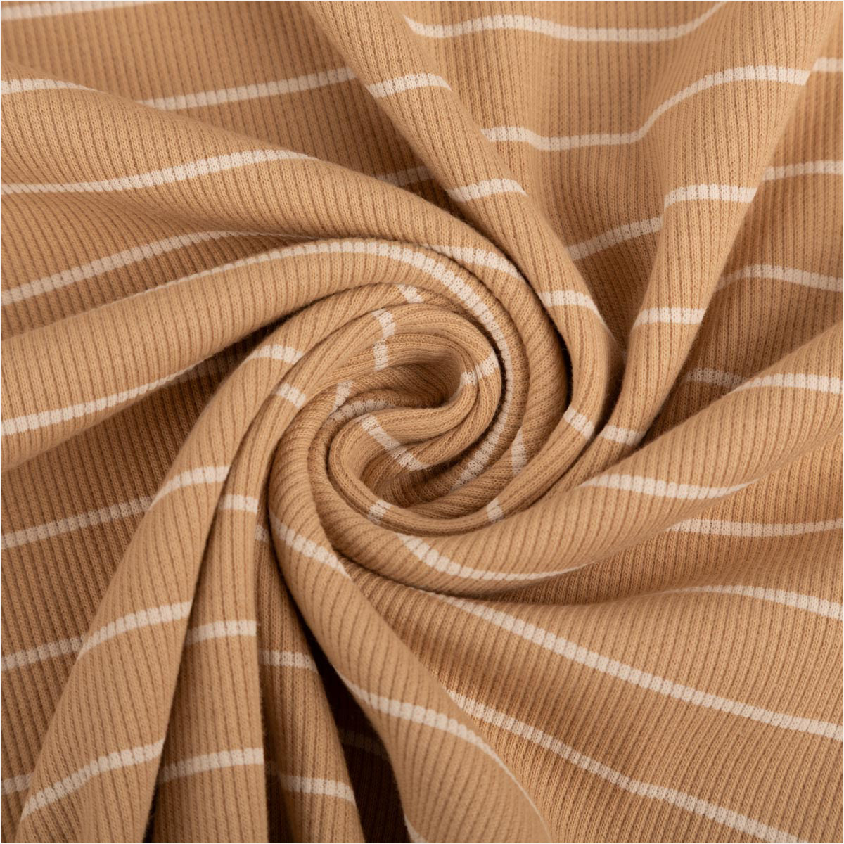 Entdecke den Rippjersey Stoff aus Baumwolle mit eleganten Streifen in Beige und Weiß – ein Klassiker für zeitlose Nähprojekte. Seine feine Rippenstruktur sorgt für einen dezenten Look und gleichzeitig für angenehme Elastizität.