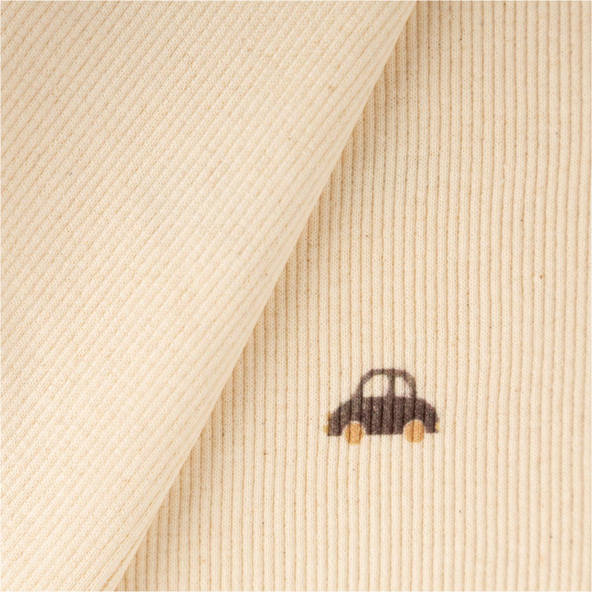 Bio Rippjersey mit Autos: Der Bio Jersey Stoff mit Rippenstruktur liegt voll im Trend und ist momentan überall in der Mode zu finden. Der Baumwolljersey in Natur mit feinen Rillen und kleinen Autos macht aus denen Näh-Projekten zauberhafte Hingucker.