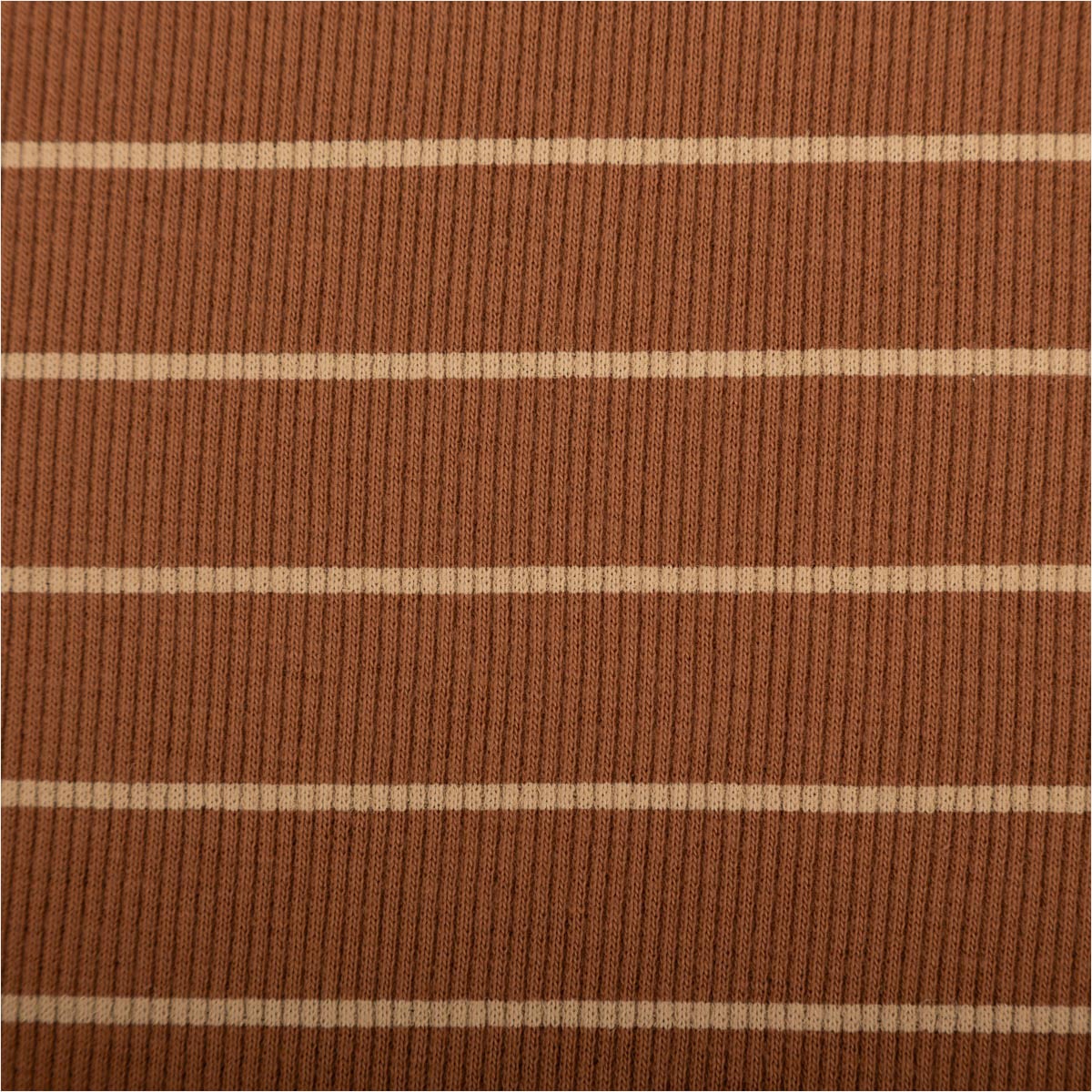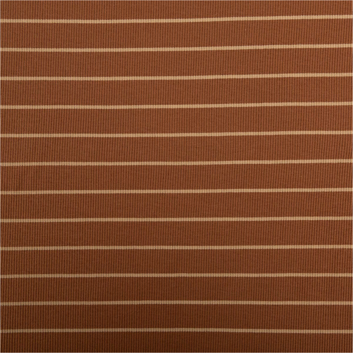 Entdecke den Rippjersey Stoff aus Baumwolle mit eleganten Streifen in Braun und Beige – ein Klassiker für zeitlose Nähprojekte. Seine feine Rippenstruktur sorgt für einen dezenten Look und gleichzeitig für angenehme Elastizität.