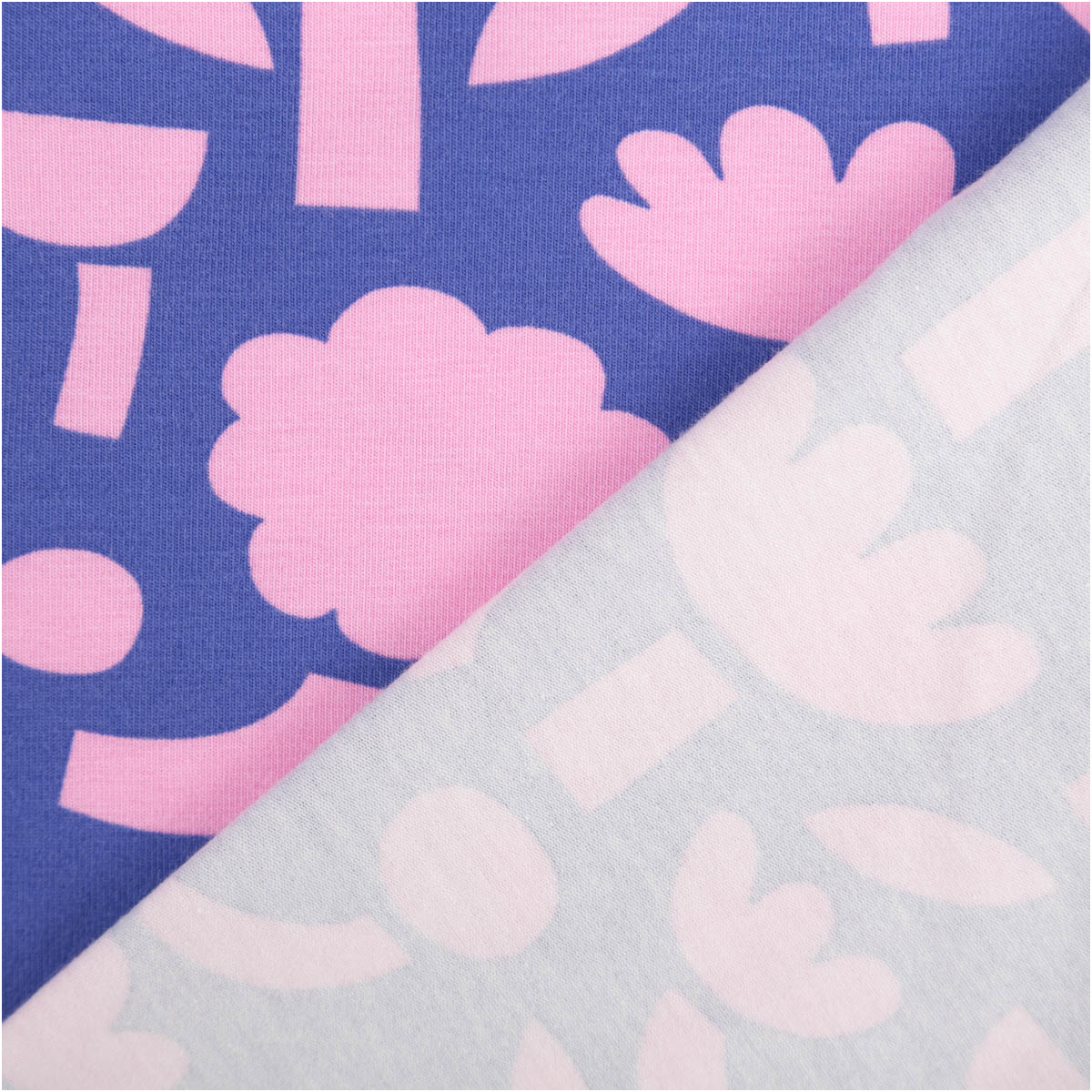 Das florale Muster ist modern und grafisch interpretiert. Die großen stilisierten Blütenformen wirken klar, freundlich und besonders dekorativ. Durch die Kombination aus kräftigem Fuchsia und warmem Apricot entsteht ein frischer Look, der sowohl für Kinder als auch für moderne Accessoires und bequeme Freizeitkleidung wunderbar geeignet ist.