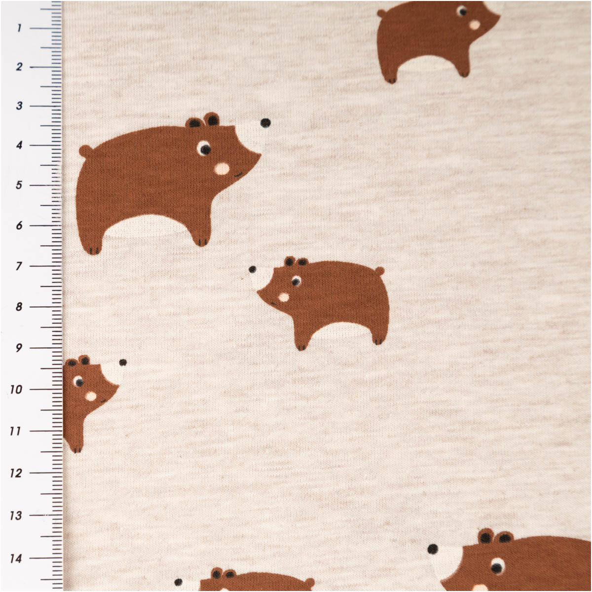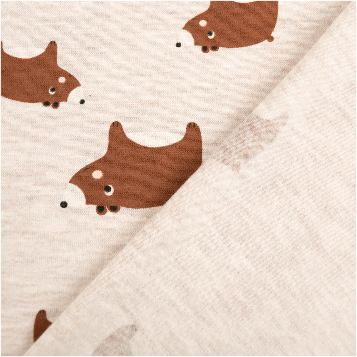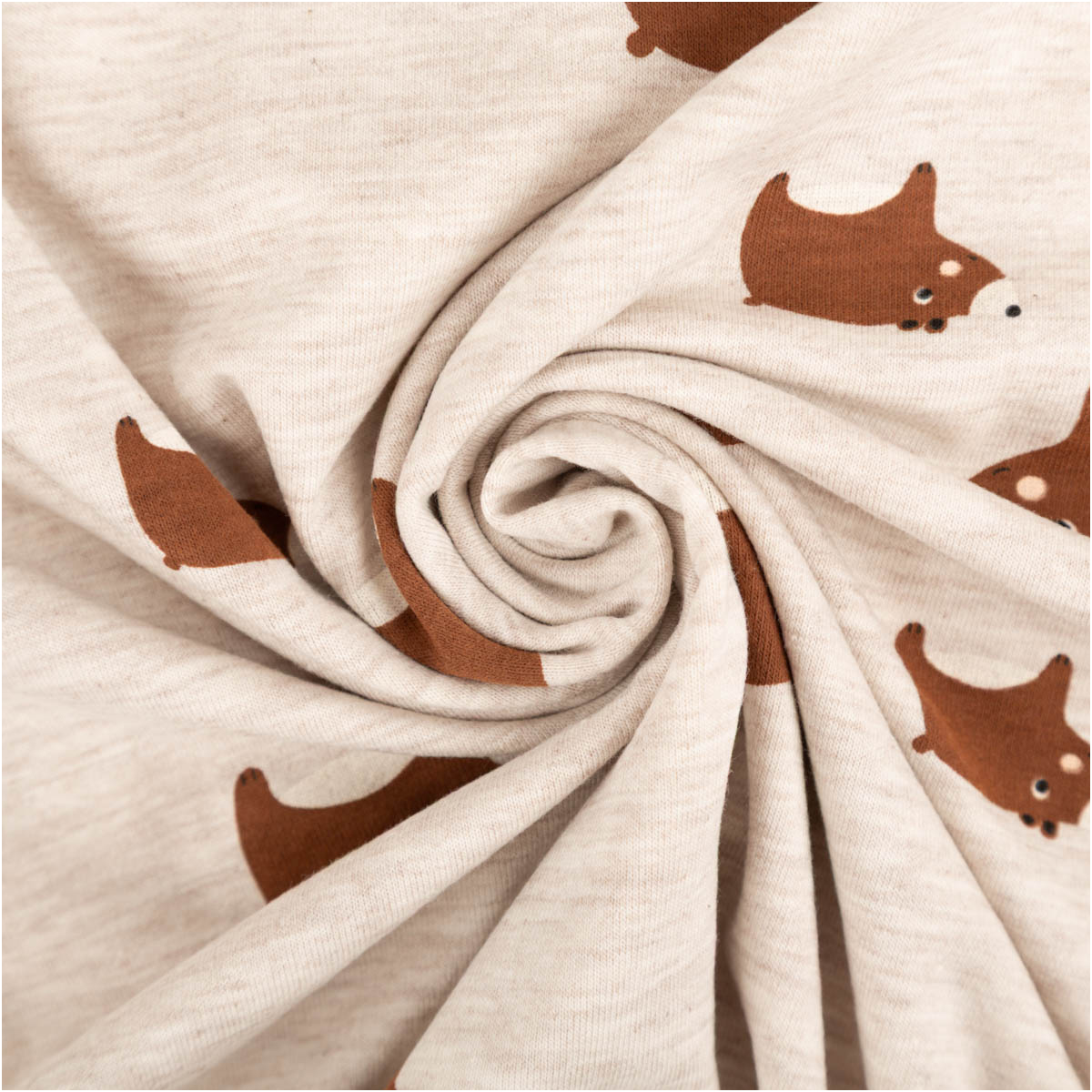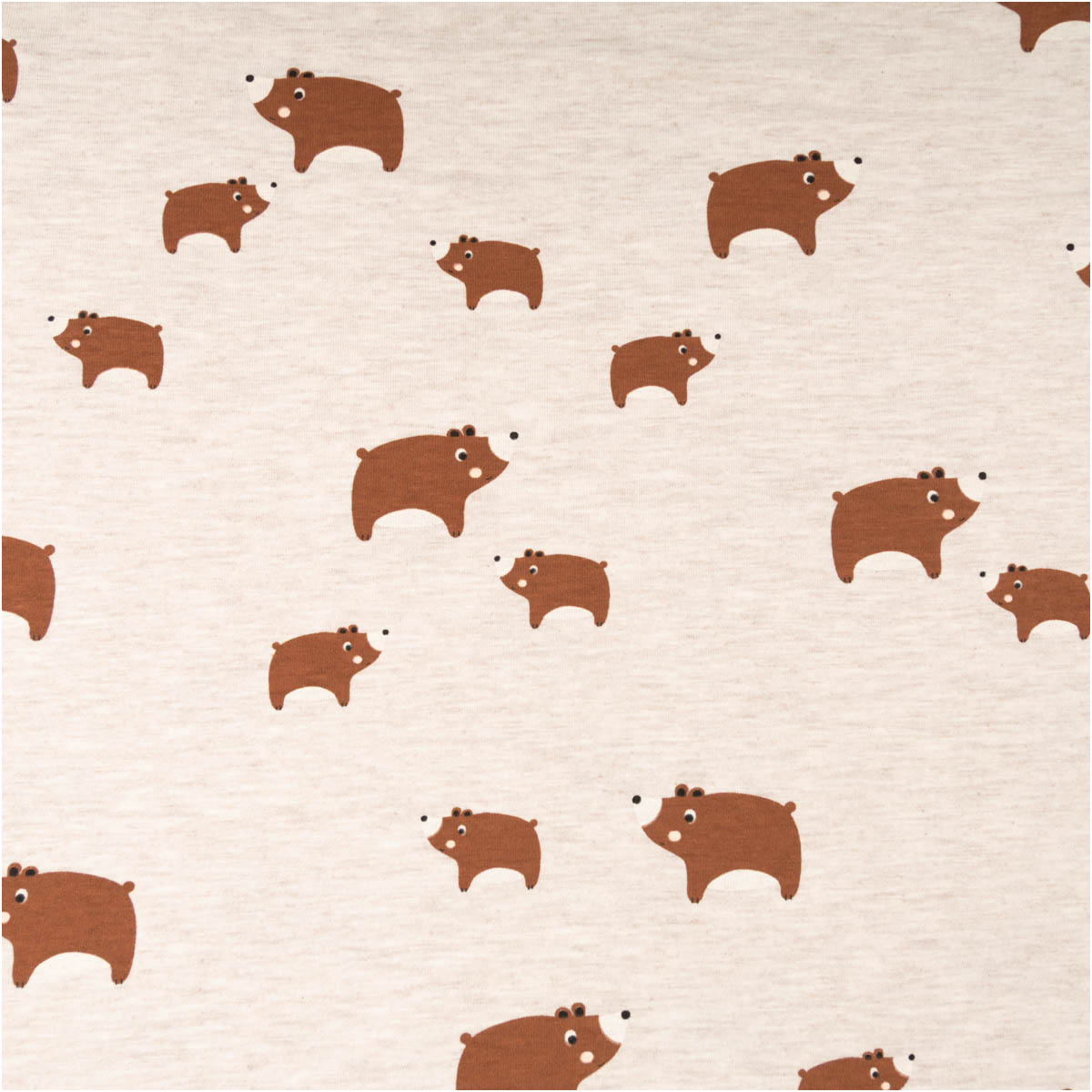 Dieser Baumwolljersey mit niedlichen Bärenmotiven auf sandfarben meliertem Hintergrund ist die perfekte Wahl für liebevolle und natürliche Nähprojekte. Das ruhige Design in Braun wirkt warm, freundlich und zeitlos – ideal für Baby- und Kinderkleidung sowie bequeme Alltagsmode. Als Meterware bietet dir der Stoff viel Flexibilität für deine kreativen Ideen.