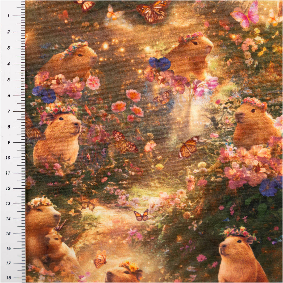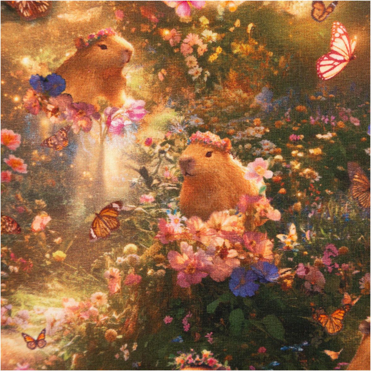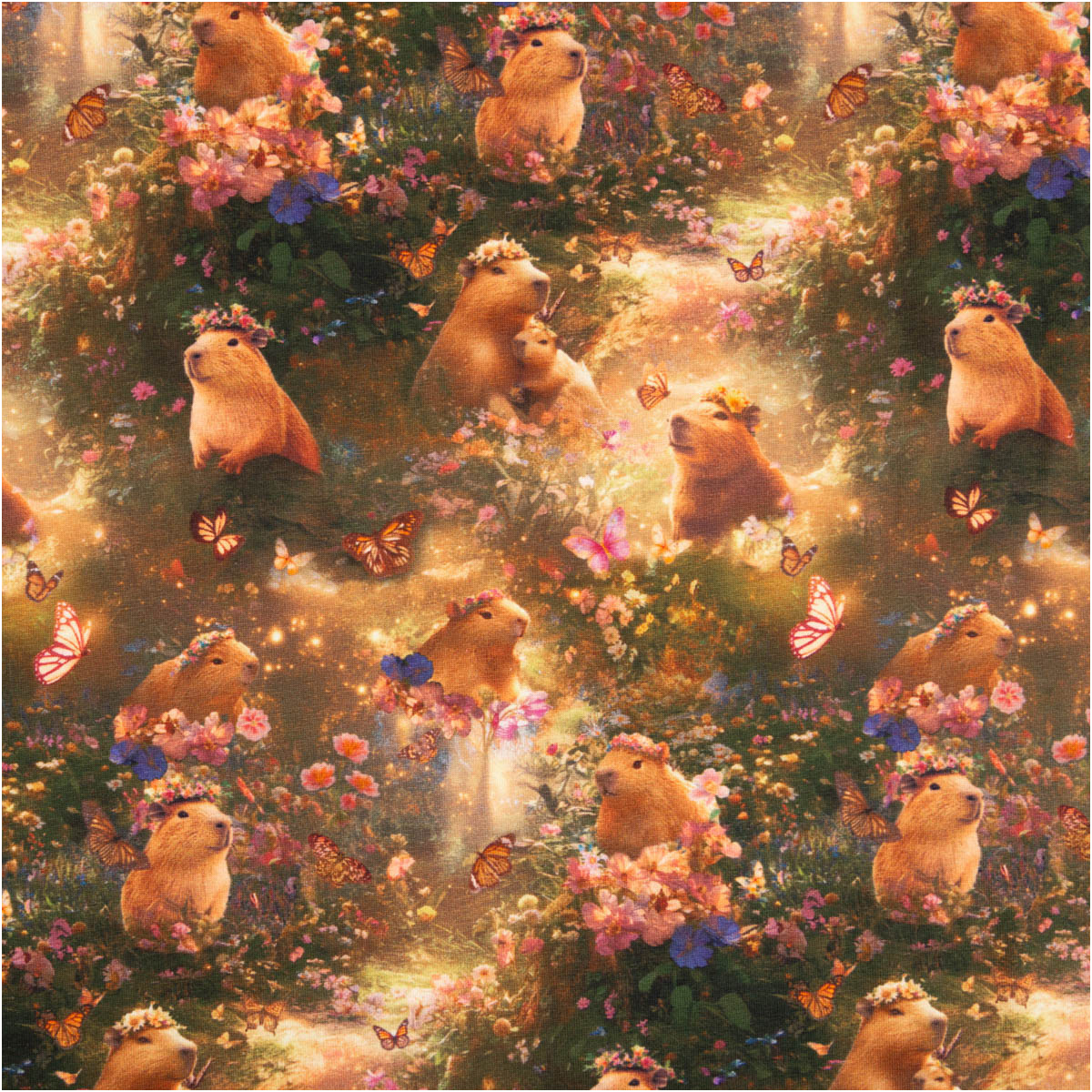 Fröhliches Capybara-Design: süße Capybaras mit Blüte und Blumenmotiv auf grüner Wiese, hochwertiger Digitaldruck aus der Poppy Fabrics Kollektion