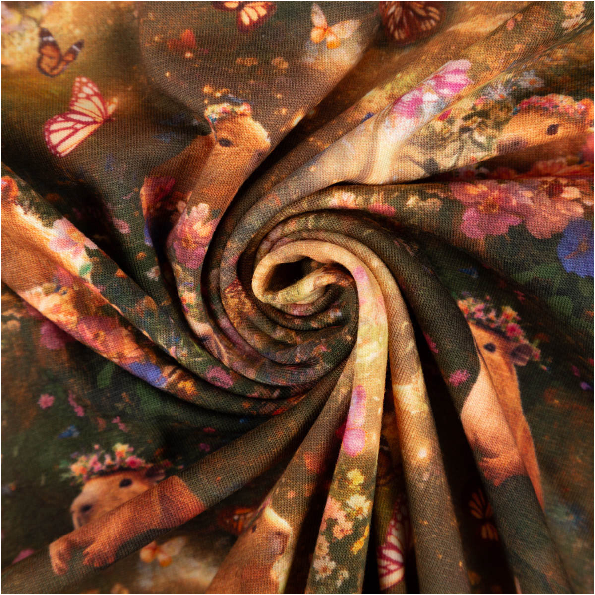 Baumwolljersey „Capybaras & Blumen“ – Digitaldruck ocker/grün/rosa, 1,48 m breit