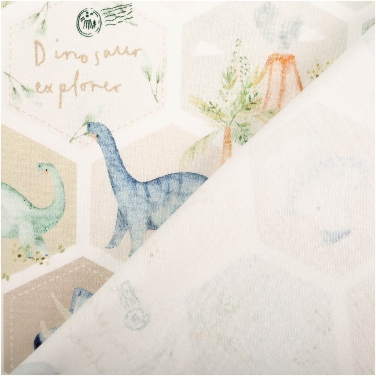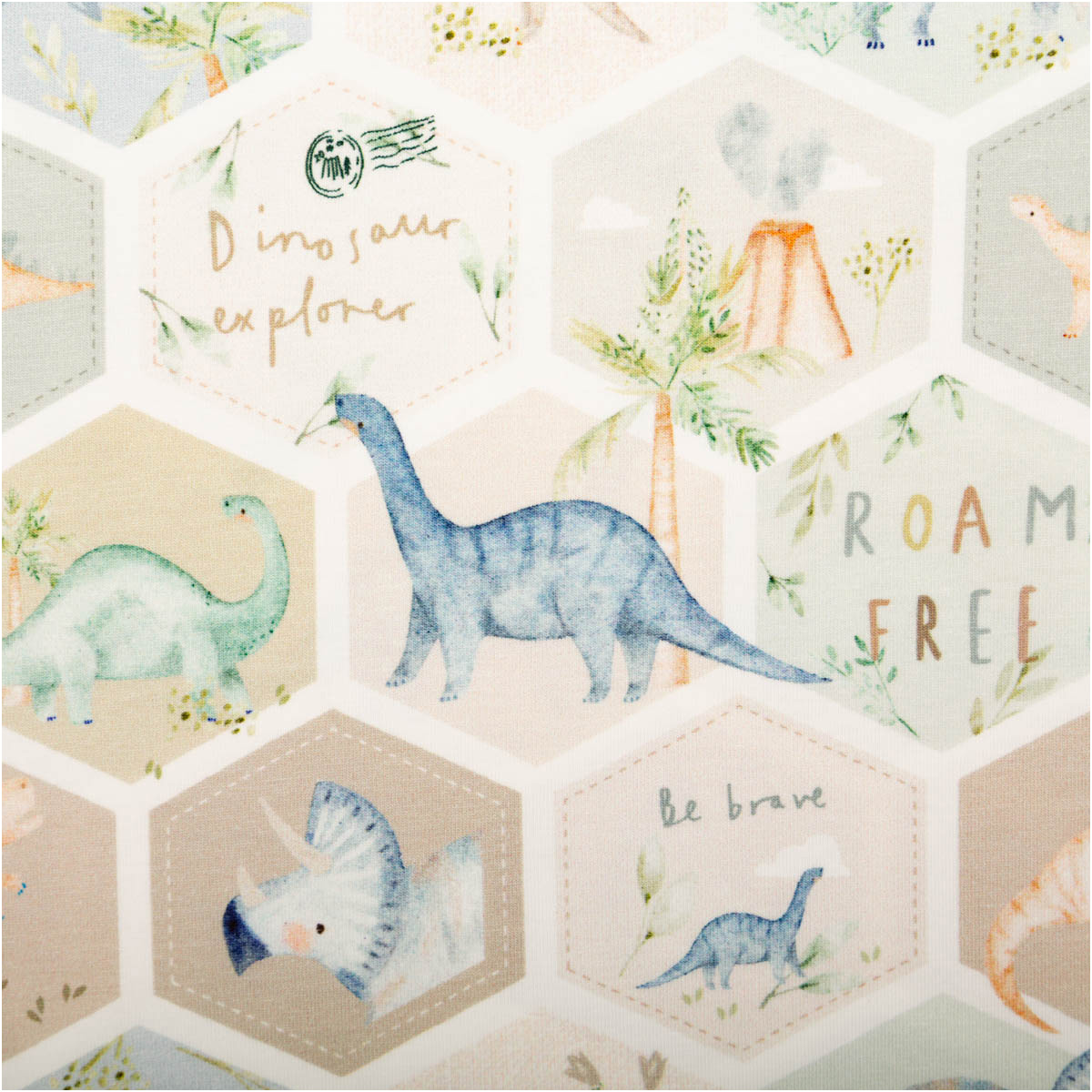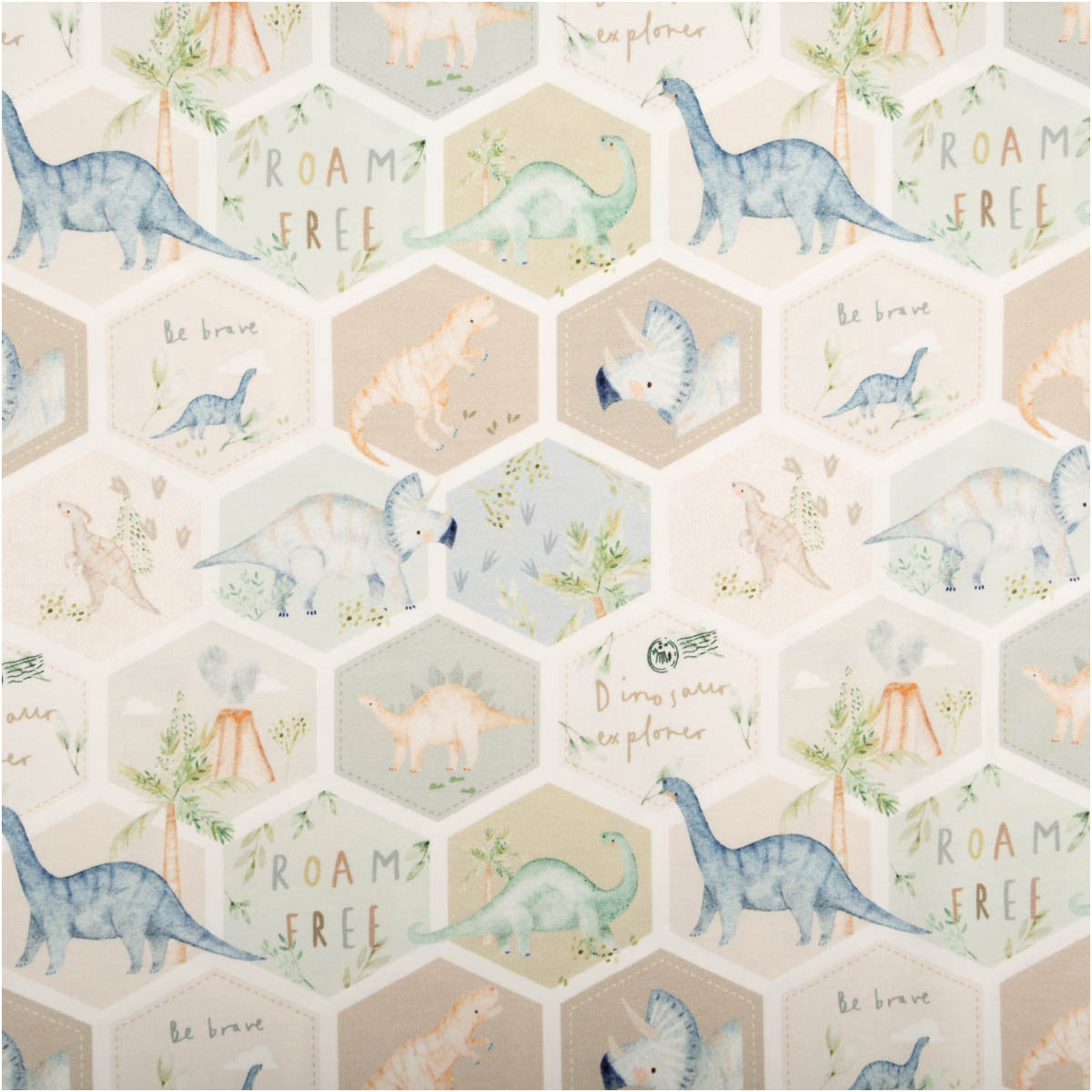 Dieser Jersey Stoff aus Baumwolljersey begeistert mit einem liebevoll gestalteten Dinosaurier-Design in moderner Hexagon-Optik. Auf hellem Grund zeigen sich verschiedene Dinosaurier, Pflanzen und kleine Naturmotive in harmonischen Farben wie Grün, Blau und Beige. Die sanfte Farbwelt wirkt freundlich, modern und kindgerecht und macht den Stoff zu einer tollen Wahl für viele kreative Nähideen.
