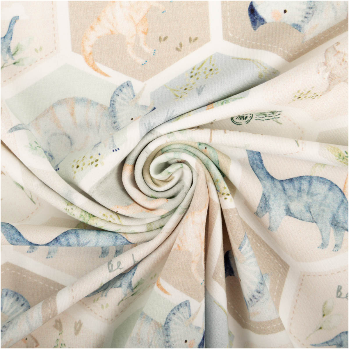 Jersey Stoff Baumwolljersey Digitaldruck Dinosaurier Hexagon grün blau beige 1,5 m Breite