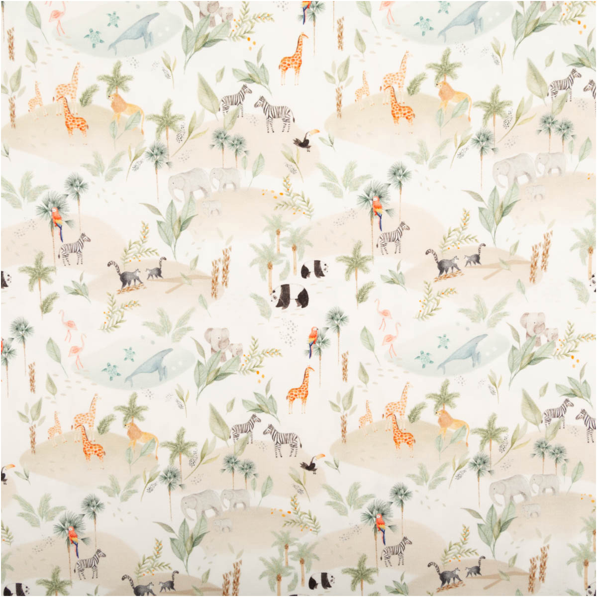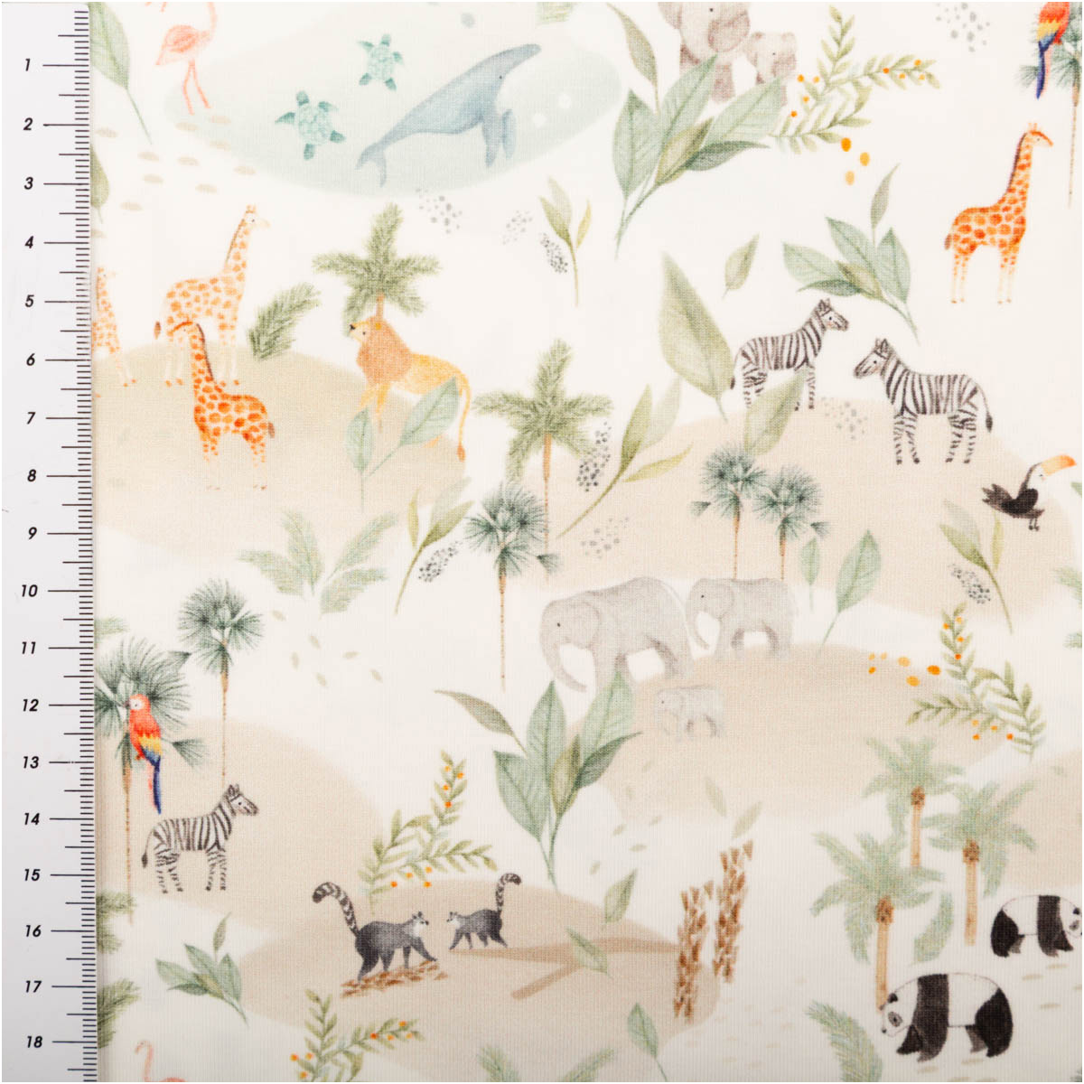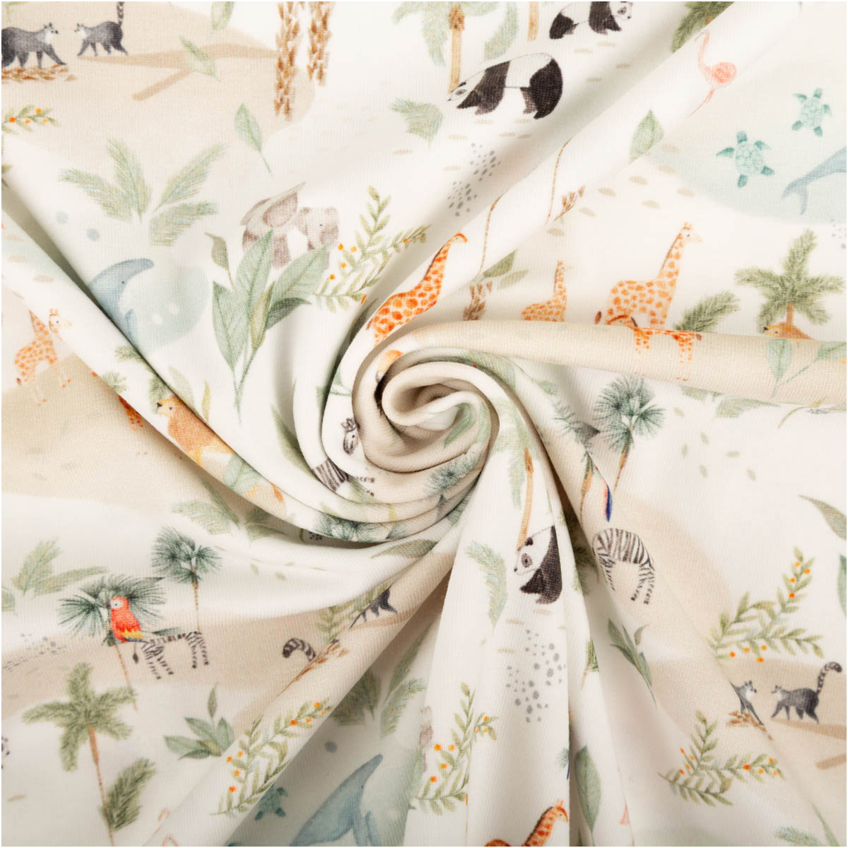 Dieser Jersey Stoff aus Baumwolljersey begeistert mit einem detailreichen Digitaldruck voller liebevoll gestalteter Safaritiere und tropischer Pflanzen. Auf hellem Grund verteilen sich unter anderem Elefanten, Zebras, Giraffen, Löwen, Pandas und bunte Vögel zwischen Palmen und Blättern. Dadurch wirkt der Stoff lebendig, freundlich und wunderbar verspielt.
