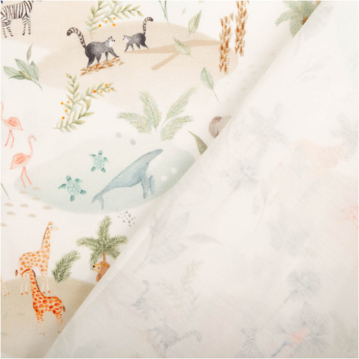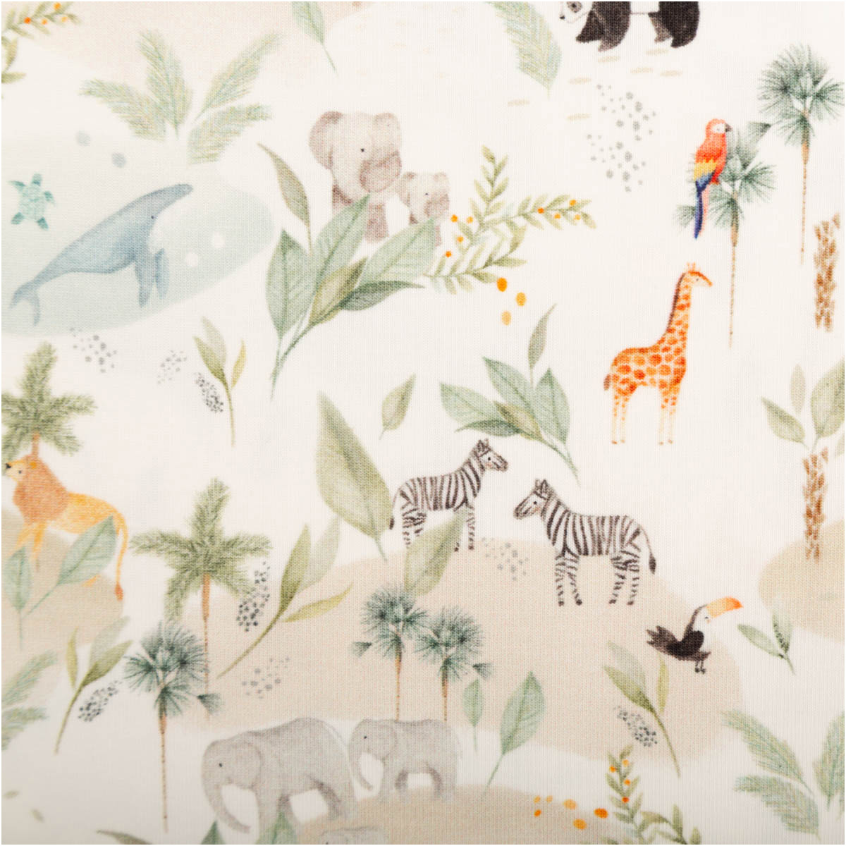 Weicher Baumwolljersey mit detailreichem Digitaldruck und liebevollen Safaritieren wie Elefanten, Zebras, Giraffen, Löwen, Pandas und bunten Vögeln
