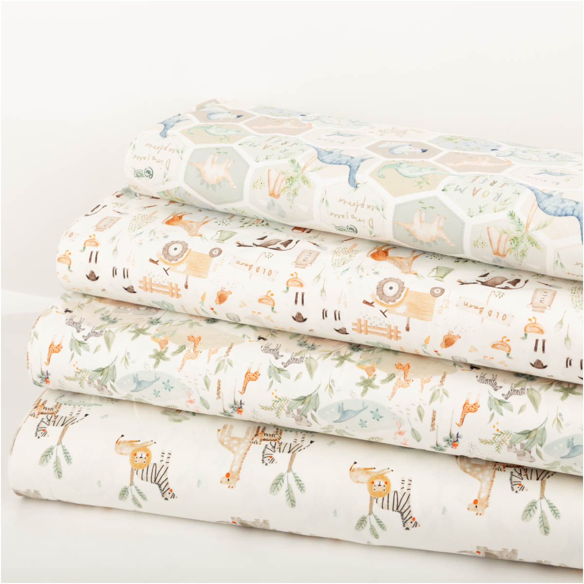 Das fantasievolle Motiv macht den Stoff besonders attraktiv für Kinderkleidung und Babyprojekte. Gleichzeitig lässt sich das Design auch wunderbar mit unifarbenen Jerseys in Grün, Natur, Beige oder passenden Bunttönen kombinieren.