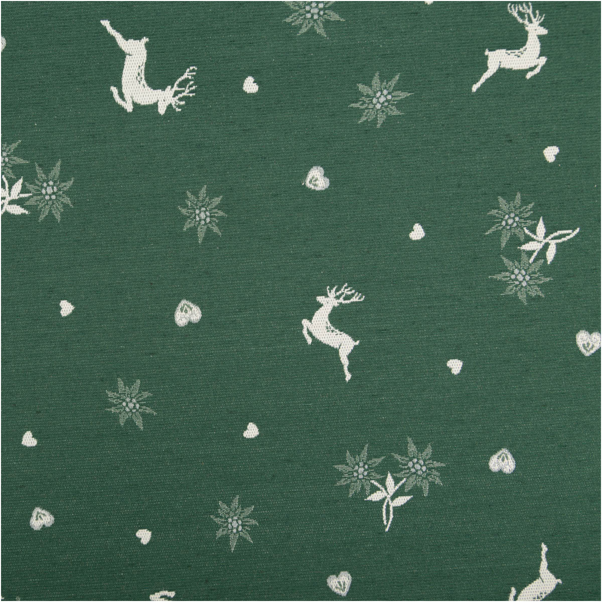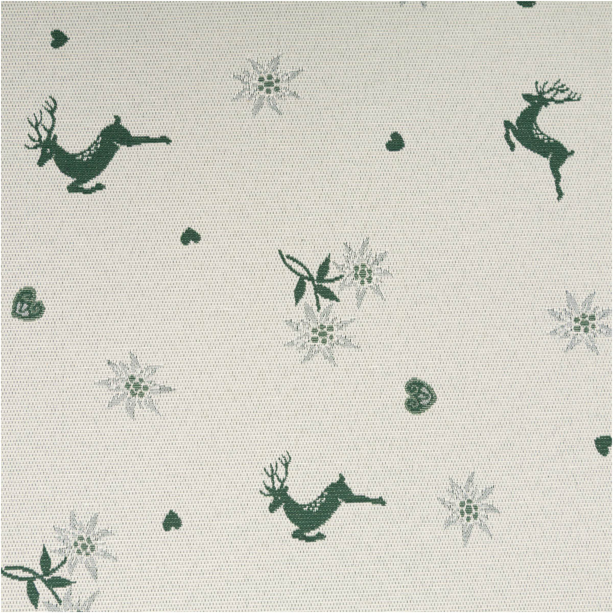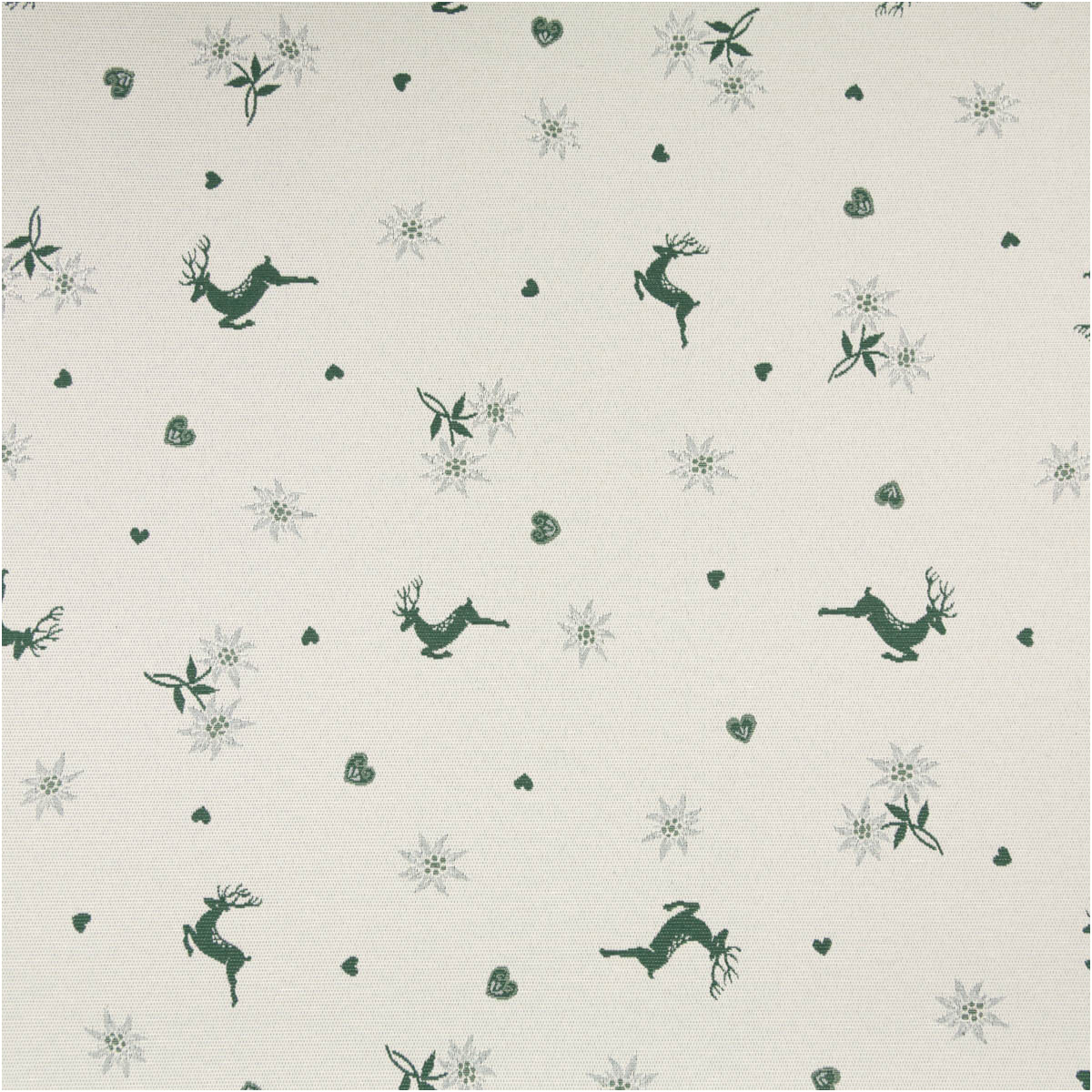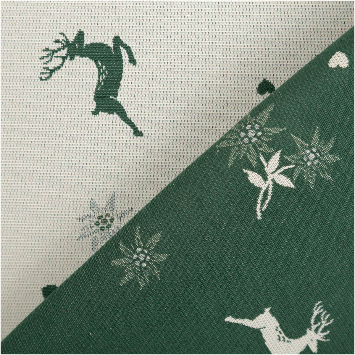 Jacquard Dekostoff Doubleface „Hirsch, Edelweiß & Herz“ – grün/ecru, 140 cm breit