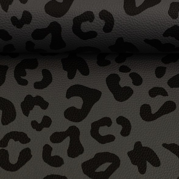 Hochwertiges Kunstleder mit Happy-Leo-Print in Grau/Schwarz von Cherry Picking Studios in Kooperation mit Swafing
