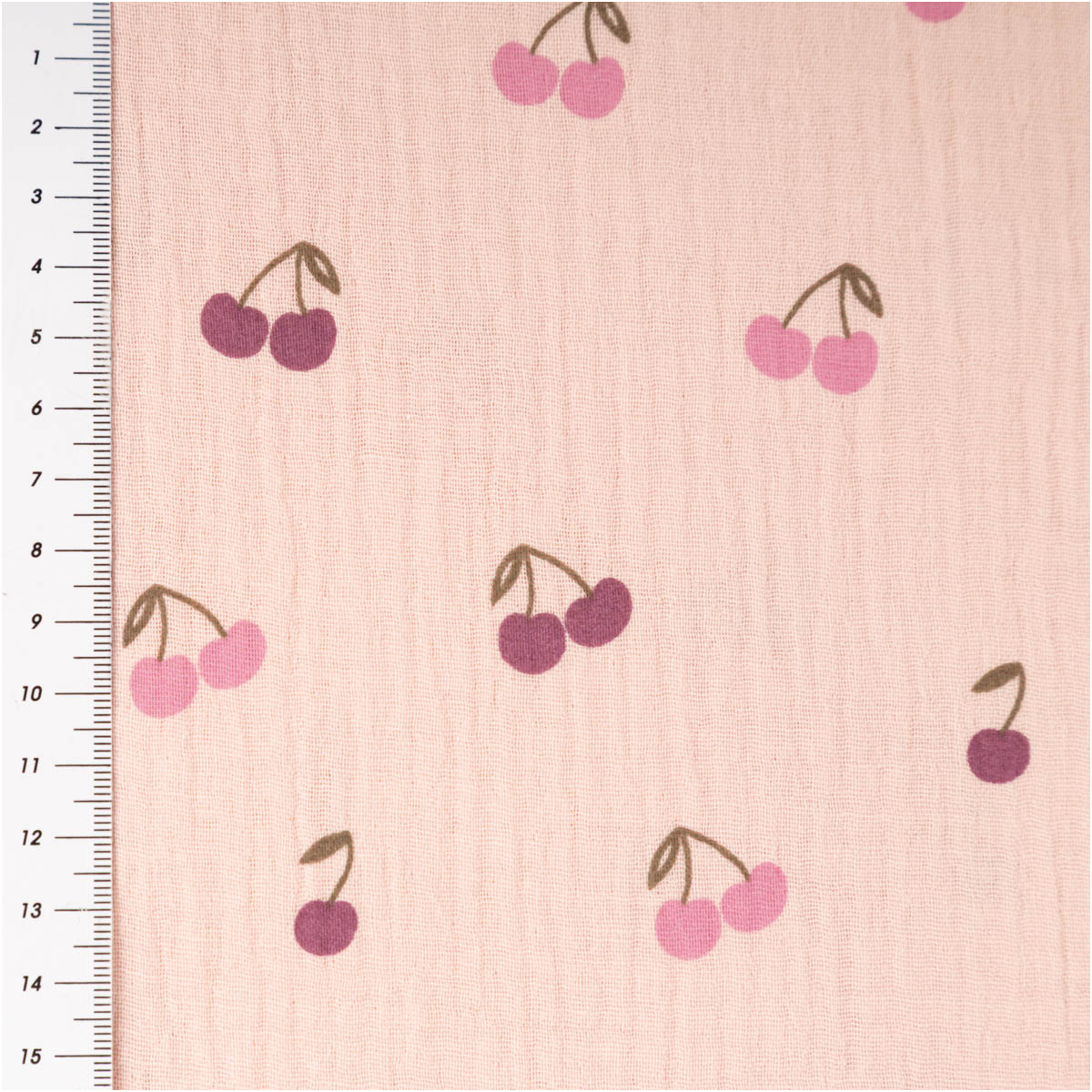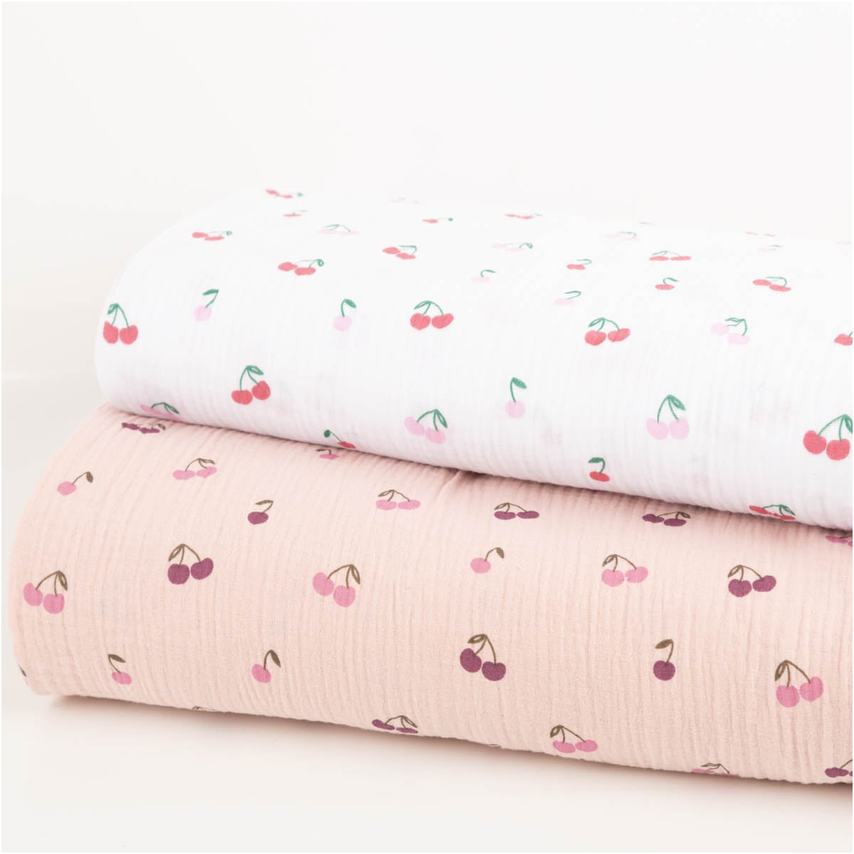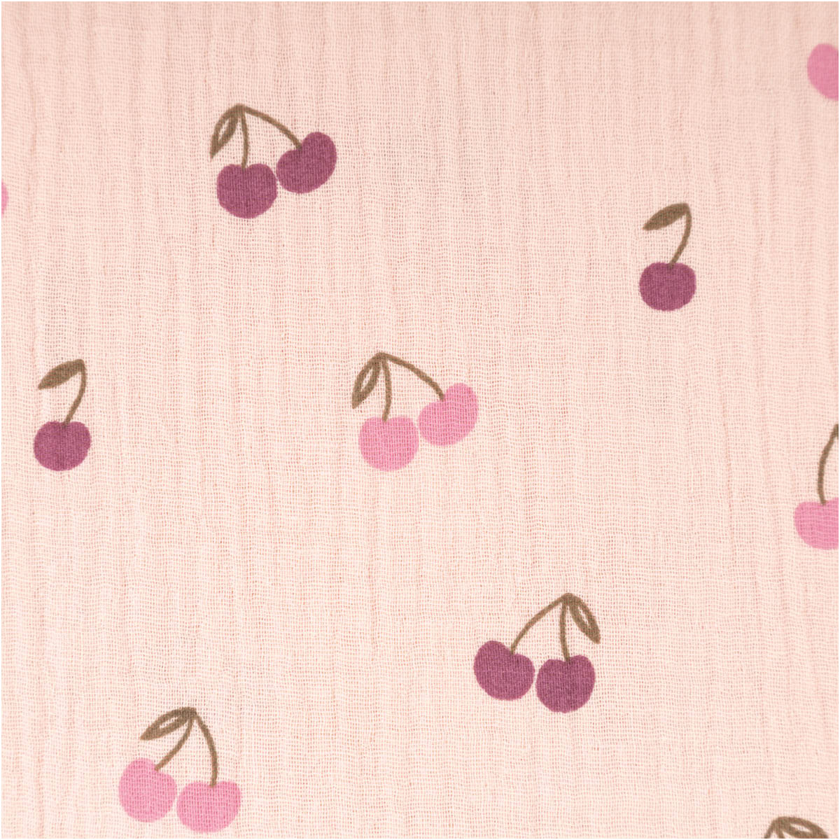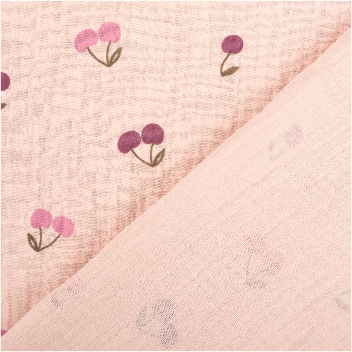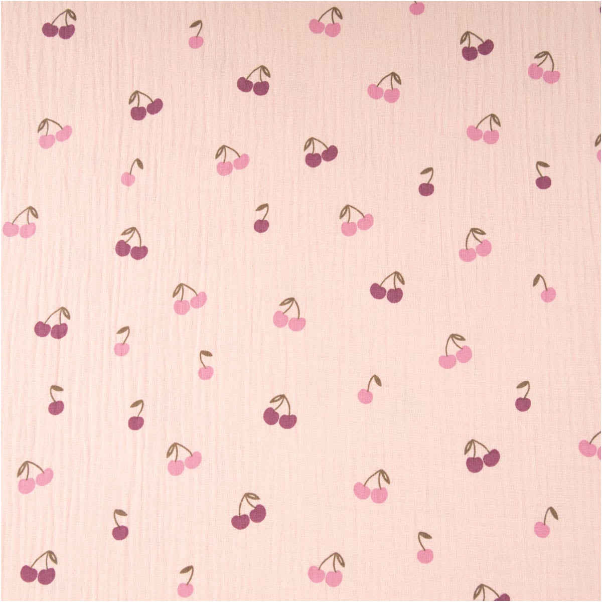 Dieser Musselin Stoff aus 100 % Baumwolle begeistert mit einem süßen Kirsch-Dessin auf zartem Rosaton. Die kleinen Kirschen in verschiedenen Rosé- und Beerentönen wirken verspielt, modern und gleichzeitig angenehm ruhig. Als Meterware eignet sich dieser Double Gauze Stoff perfekt für deine kreativen Nähideen rund um Kleidung und Accessoires.