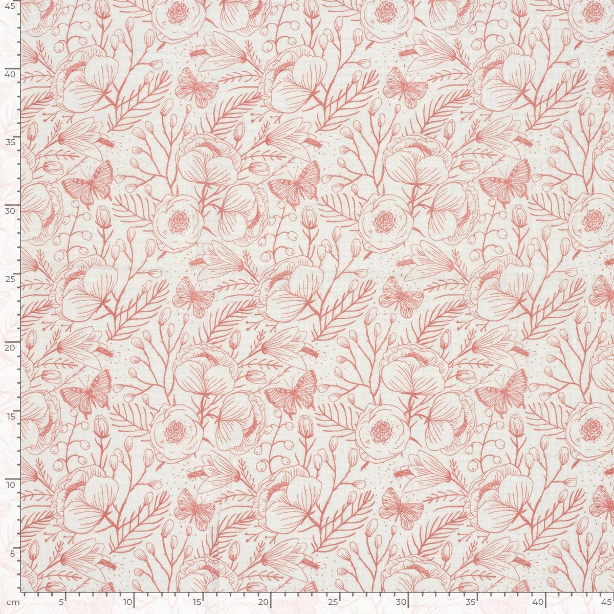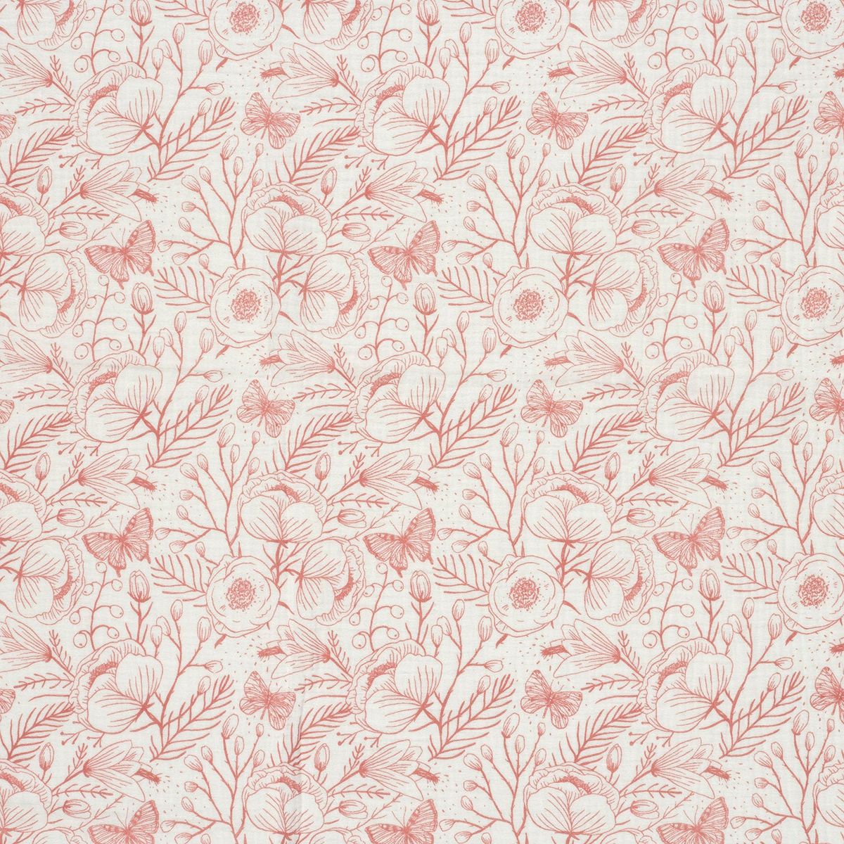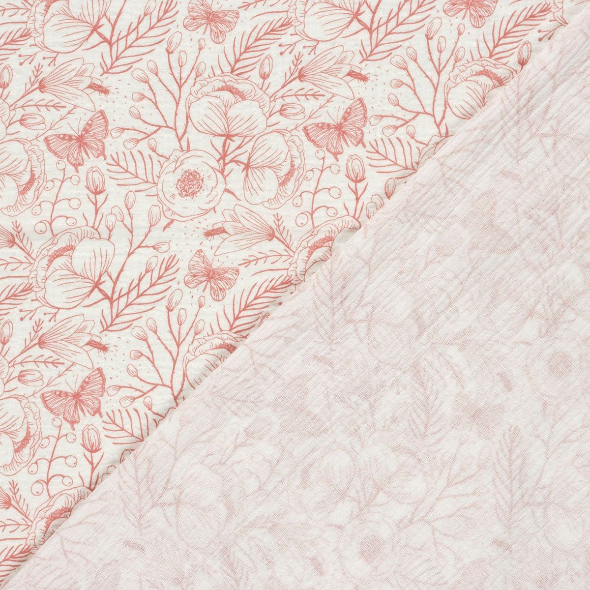 Du suchst nach einem Stoff, der filigrane Ästhetik mit unschlagbarer Weichheit verbindet? Dieser hochwertige zweilagige Musselin (Double Gauze) aus reiner Baumwolle begeistert durch sein detailliertes Muster aus gezeichneten Blumen und zarten Schmetterlingen in Rosa auf wollweißem Grund. Das romantische Design ist die perfekte Wahl für deine kreativen Nähprojekte rund um Babys, Kinder und sommerliche Fashion-Highlights.