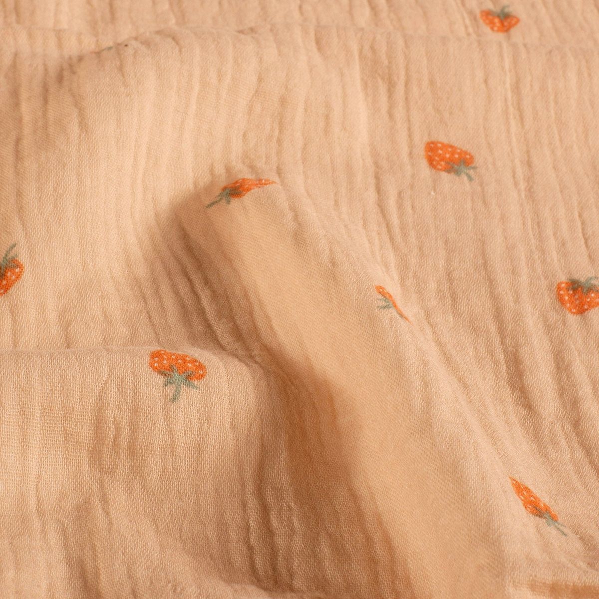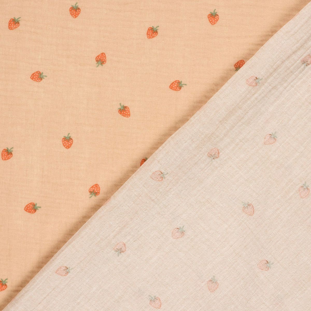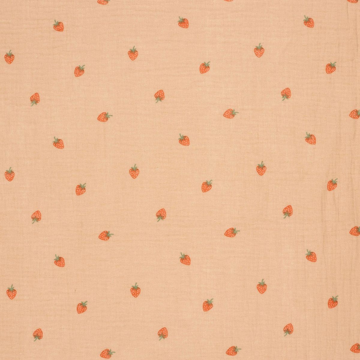 Du suchst nach einem Stoff, der sommerliche Frische und maximale Sanftheit vereint? Dieser hochwertige zweilagige Musselin (Double Gauze) aus reiner Baumwolle begeistert durch sein dezentes Erdbeer-Motiv auf einem warmen Hintergrund in Apricot. Das verspielte Design ist die perfekte Basis für deine kreativen Nähprojekte rund um Babys, Kinder und sommerliche Damenmode.