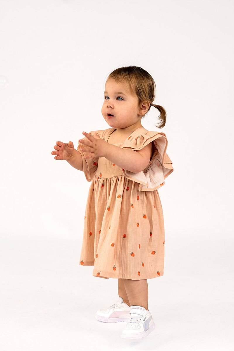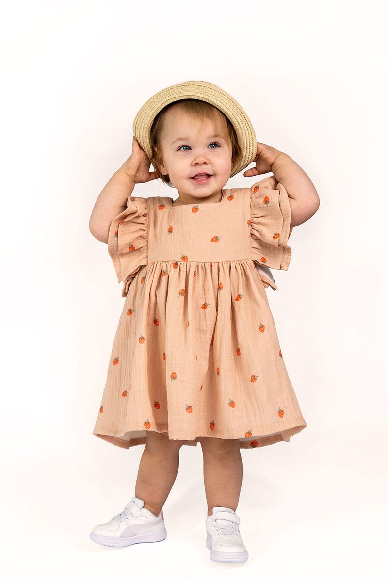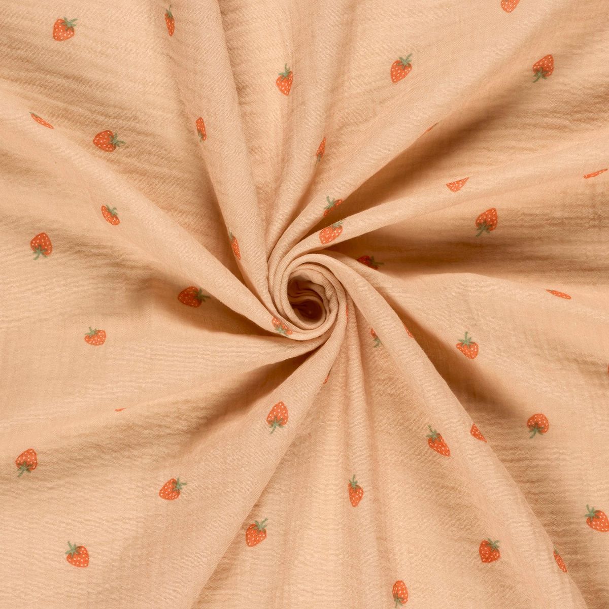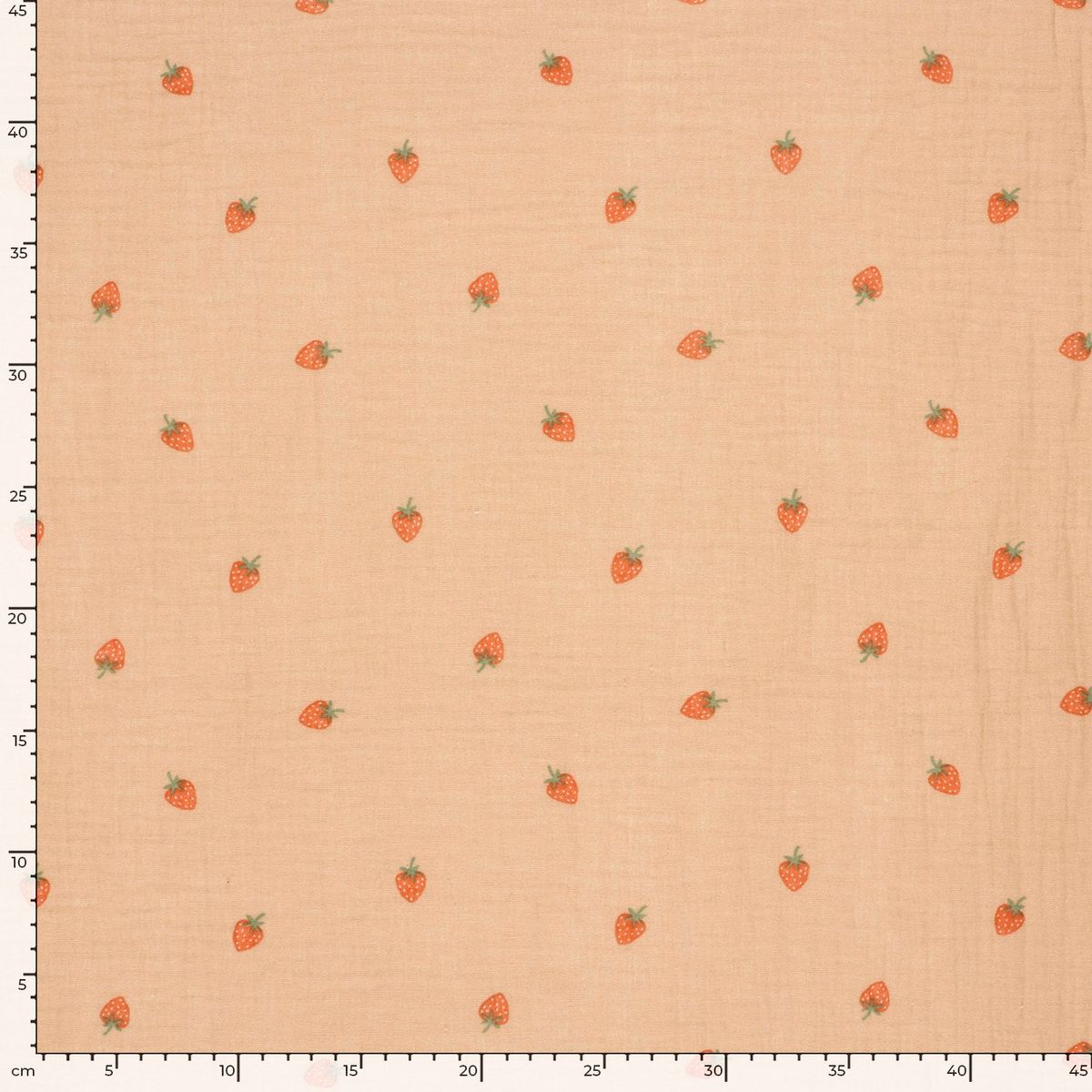 Du suchst nach einem Stoff, der sommerliche Frische und maximale Sanftheit vereint? Dieser hochwertige zweilagige Musselin (Double Gauze) aus reiner Baumwolle begeistert durch sein dezentes Erdbeer-Motiv auf einem warmen Hintergrund in Apricot. Das verspielte Design ist die perfekte Basis für deine kreativen Nähprojekte rund um Babys, Kinder und sommerliche Damenmode.