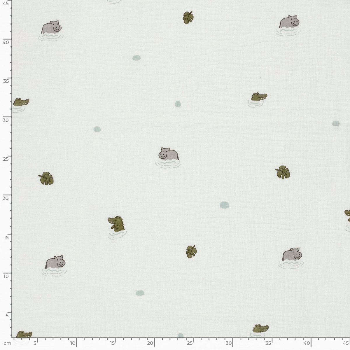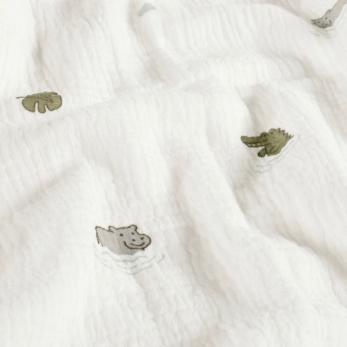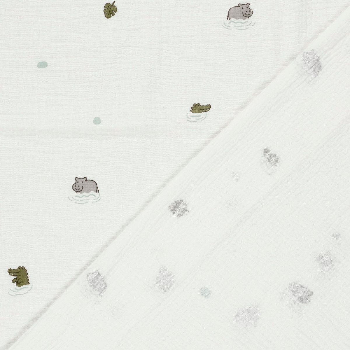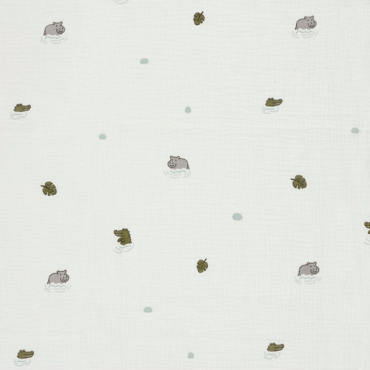 Weicher zweilagiger Musselin aus 100 % Baumwolle mit kleinen Nilpferden, Krokodilen, Blättern und Punkten auf wollweißem Hintergrund