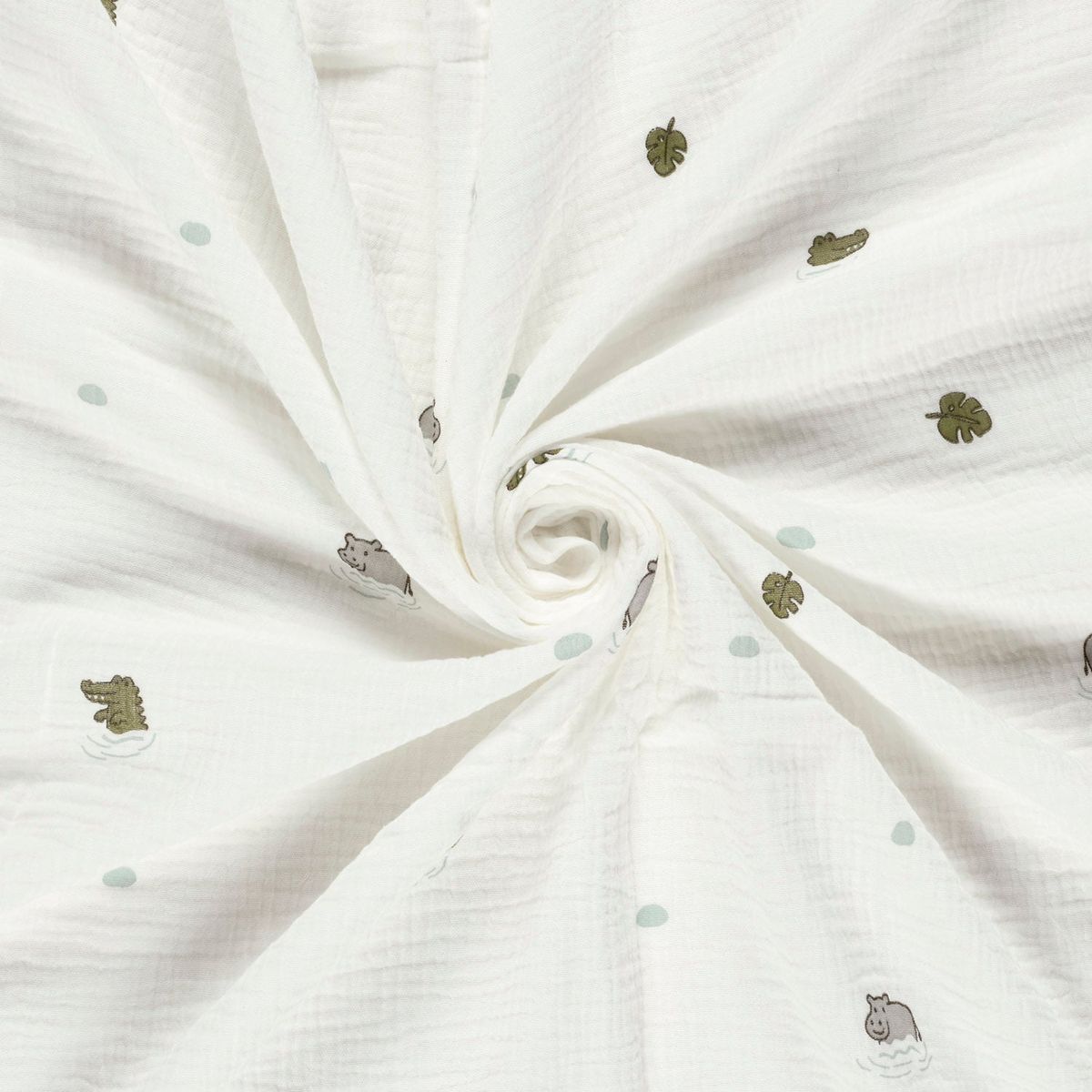 Musselin Stoff Nilpferd Krokodil in Wollweiß – weich, luftig und liebevoll gestaltet