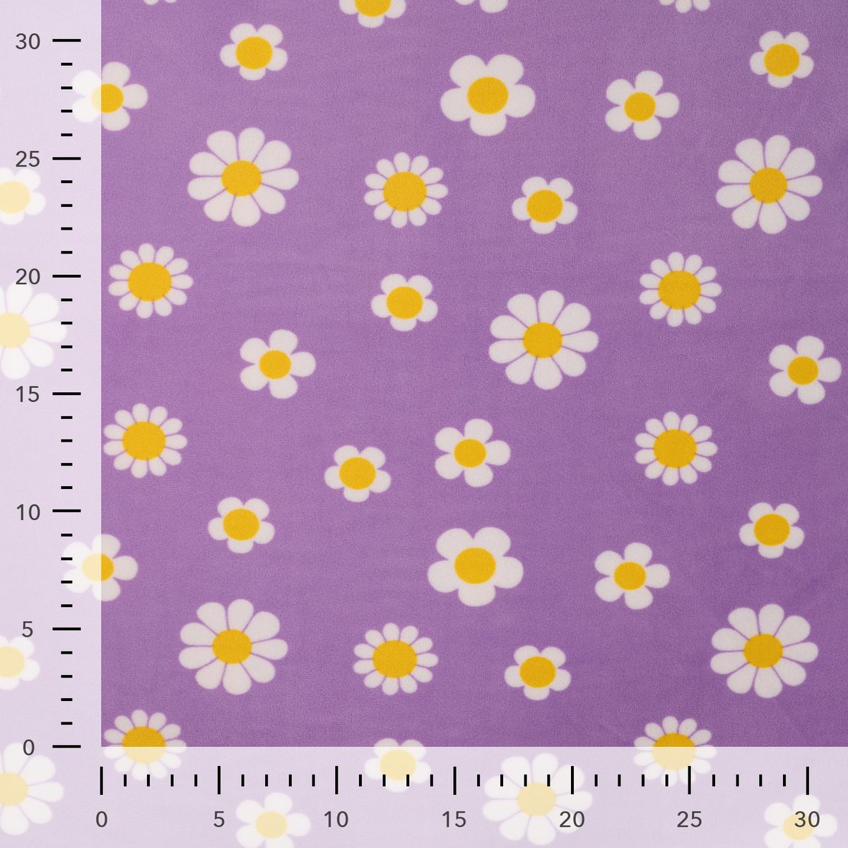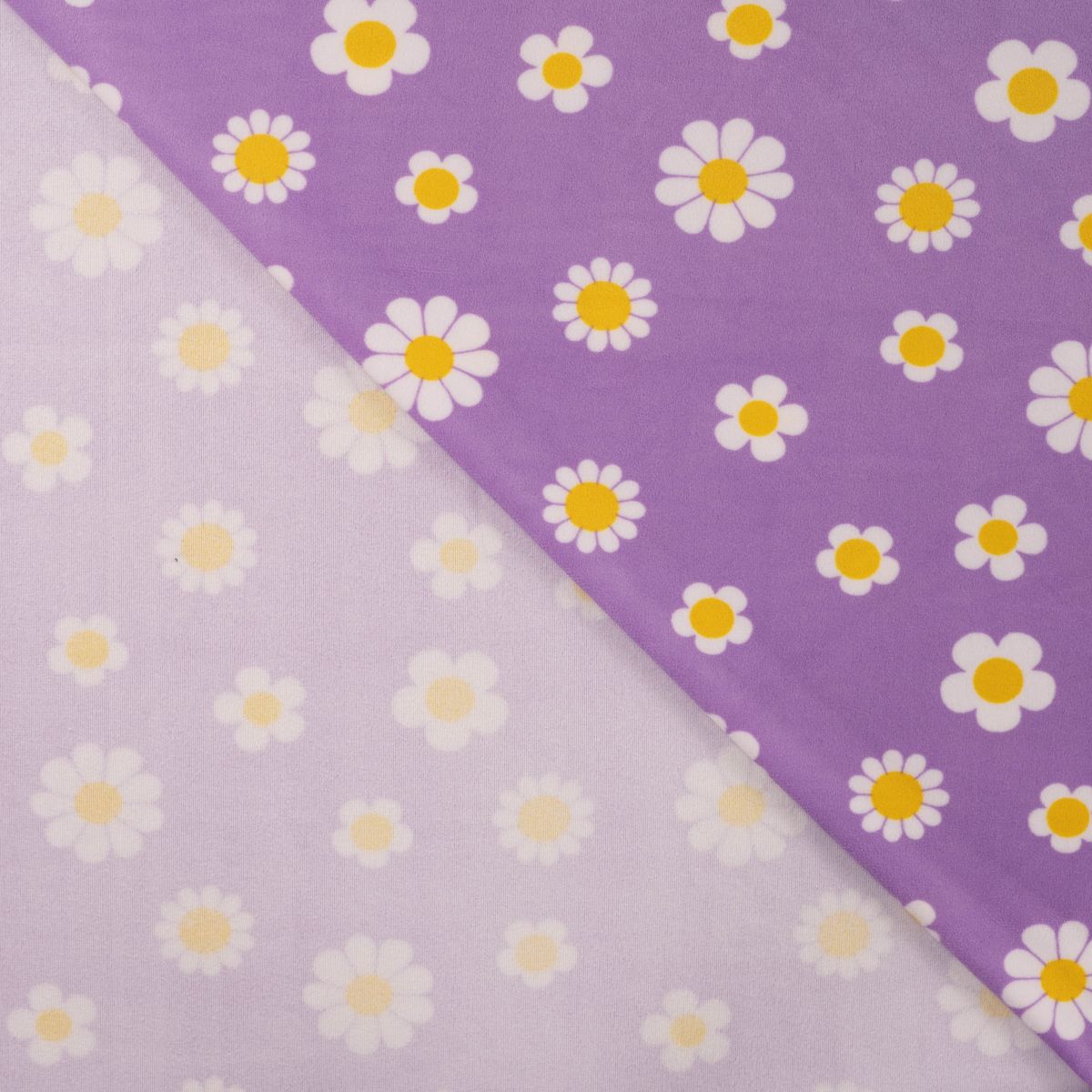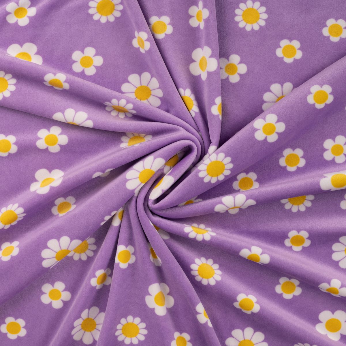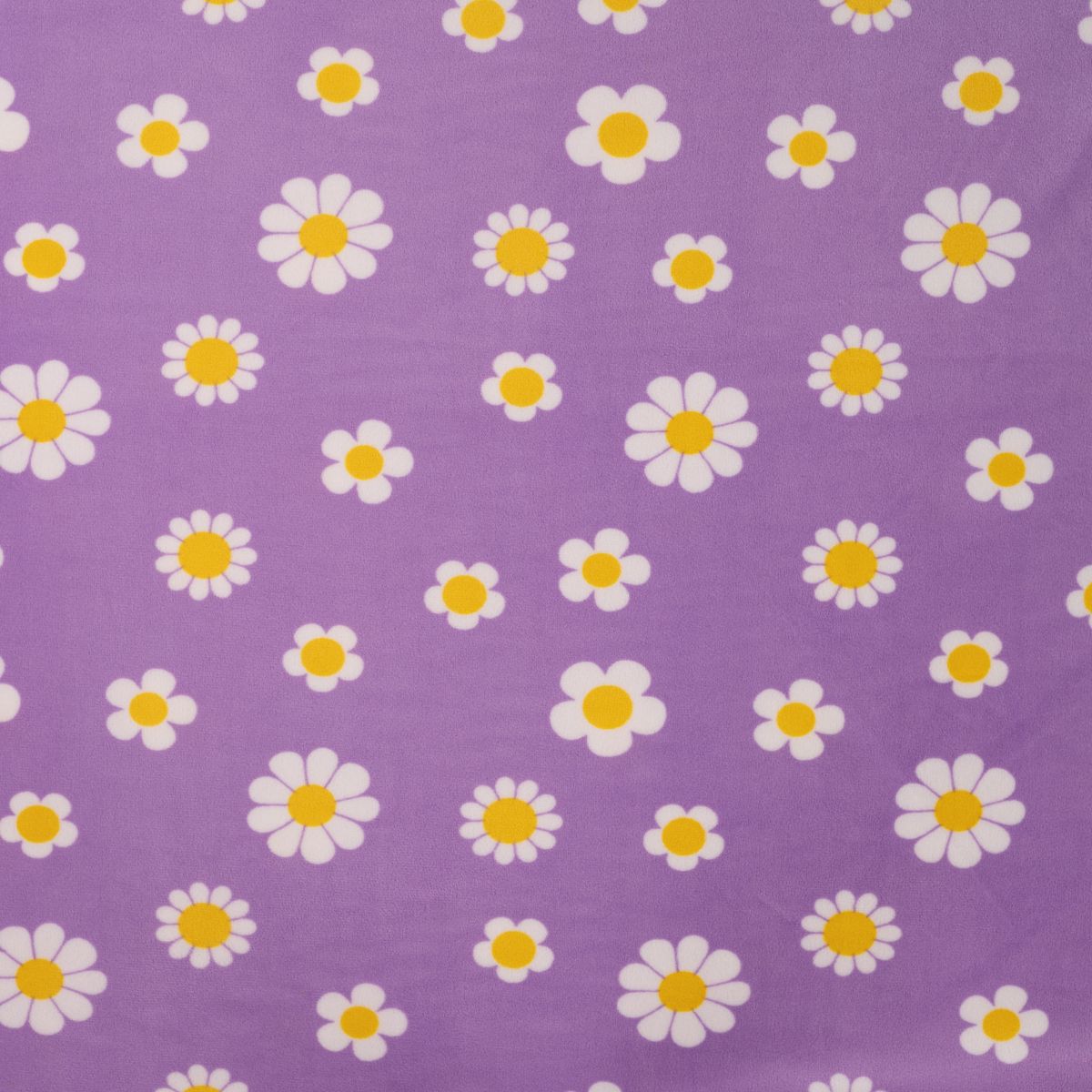 Kuschelig weicher Nicki Stoff in Lila mit weißen Blumen und gelber Mitte für gemütliche und kreative Nähprojekte