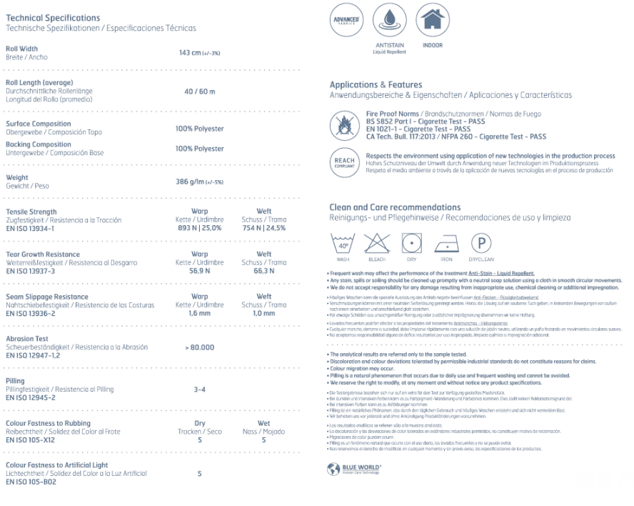 Der integrierte Fleckschutz sorgt dafür, dass Flüssigkeiten abperlen und weniger in die Faser eindringen. So bist du im Alltag bestens gewappnet, vor allem wenn Kinder, Haustiere oder Gäste im Spiel sind. Zusätzlich ist der Stoff schwer entflammbar – ein Pluspunkt für Sicherheit und Objektbereiche.