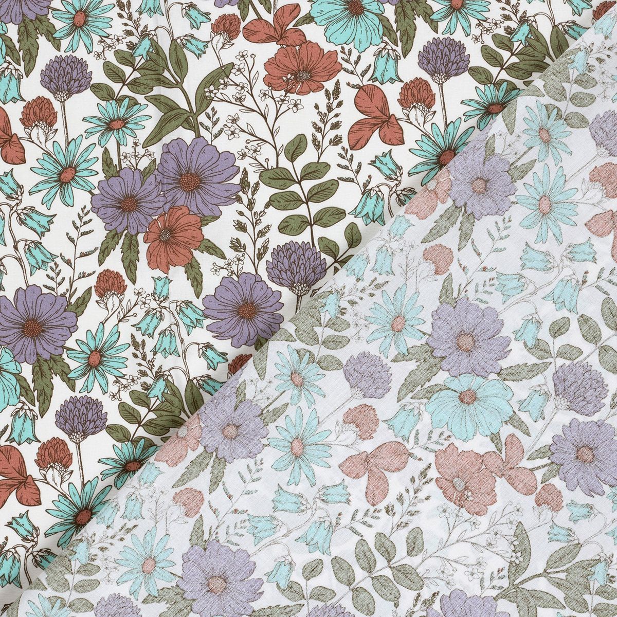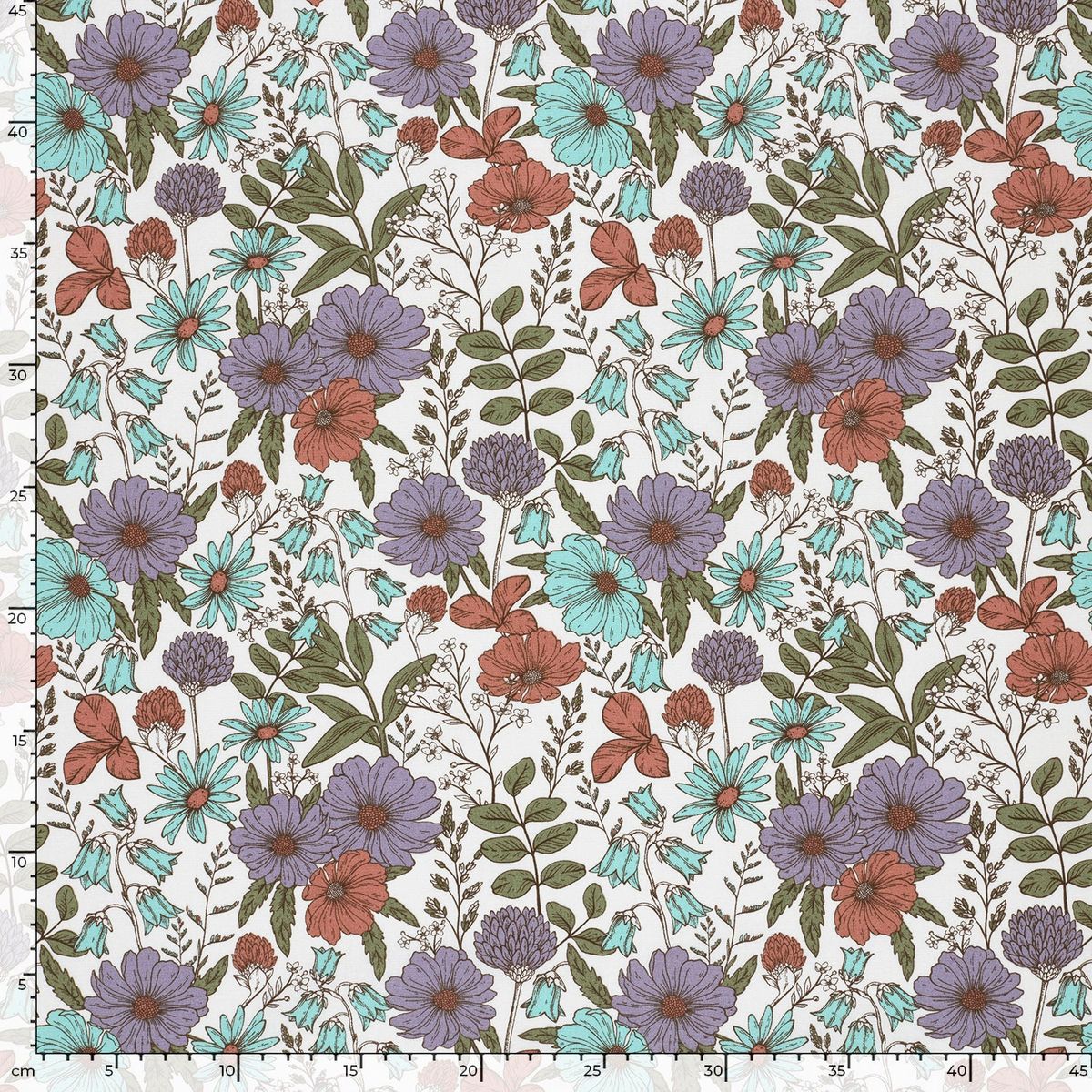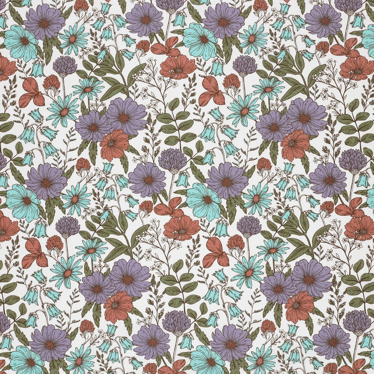 FLORALES DESIGN: Stilvolles Blumenmuster auf wollweißem Hintergrund in Lila, Türkis, Rot und Grün für elegante, romantische und moderne Nähideen