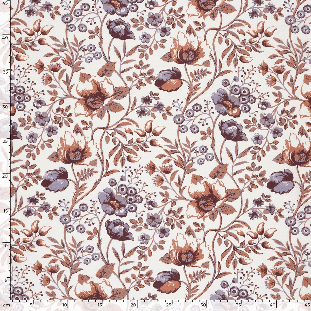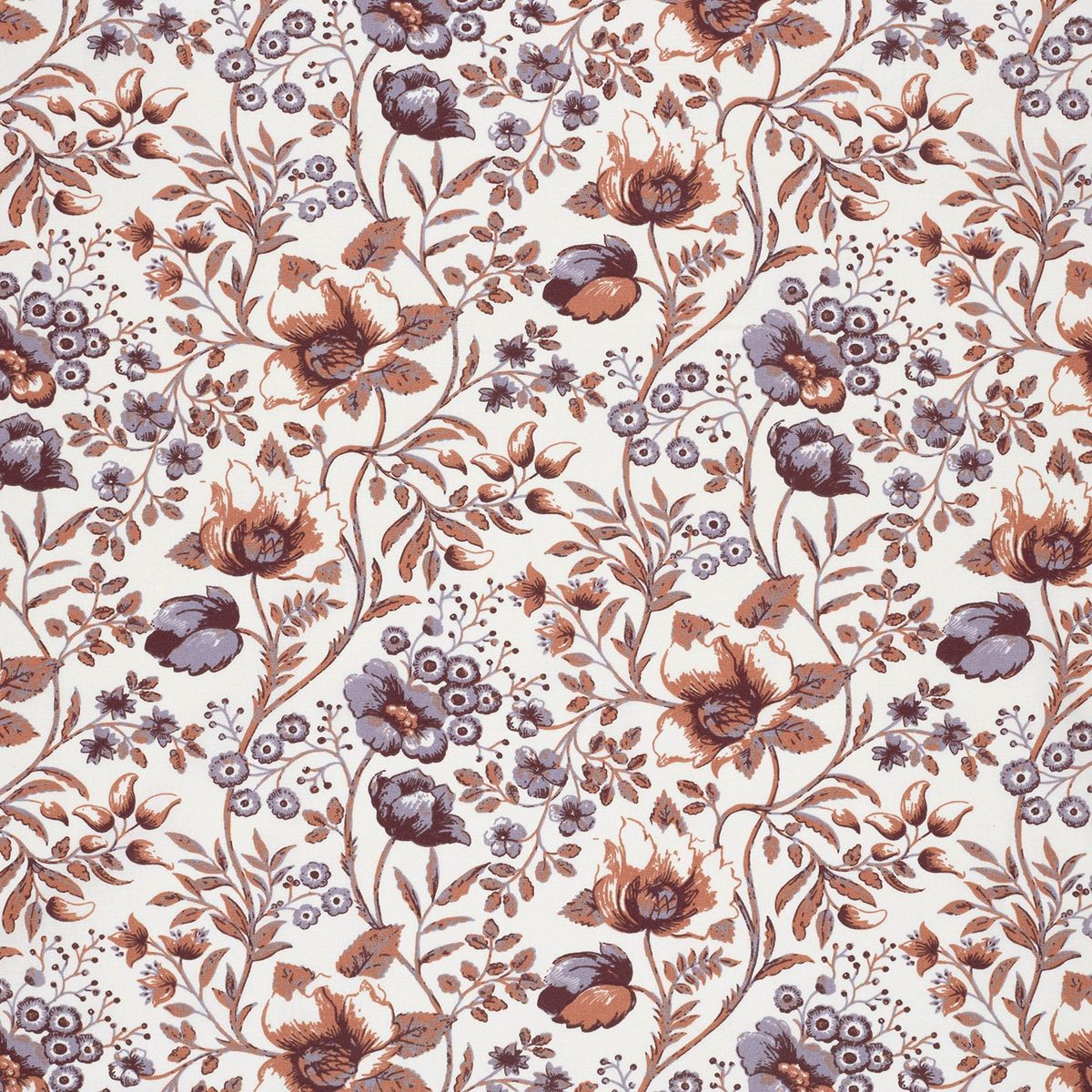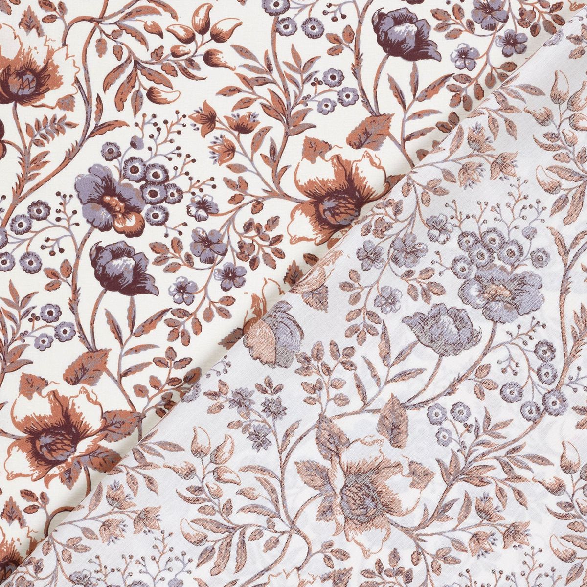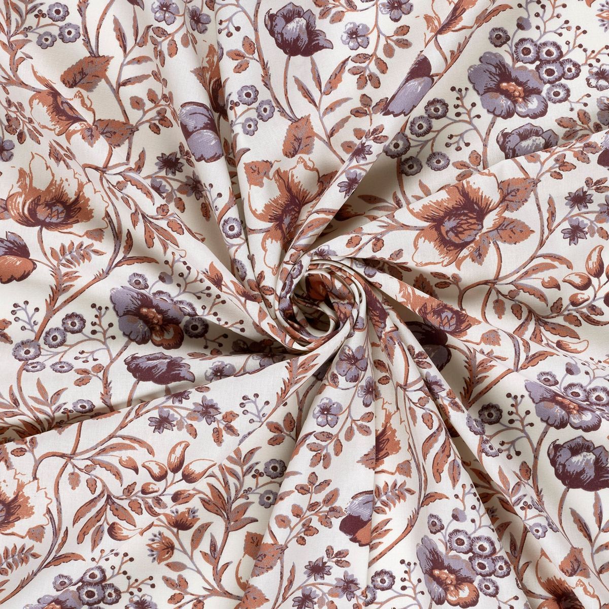 Baumwollstoff Popeline mit Blumenranken in Wollweiß, Braunrot und Lila